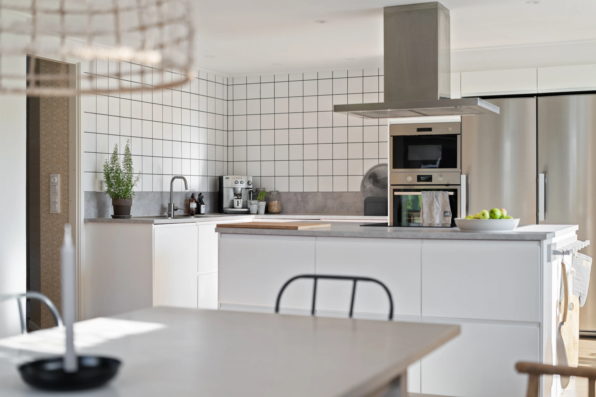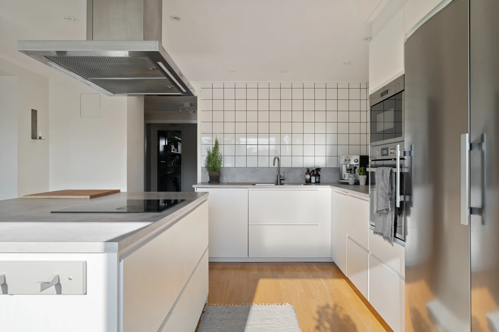 Parkettgolv med golvvärme och vitmålade väggar. Vit köksinredning och ovanför köksbänken i laminat sitter vitt kakel samt spotlights. Köket är utrustat med kyl och frys i fullhöjd, induktionshäll, inbyggd ugn, fläkt, inbyggd mikro samt diskmaskin. Takbelysning med dimmer.