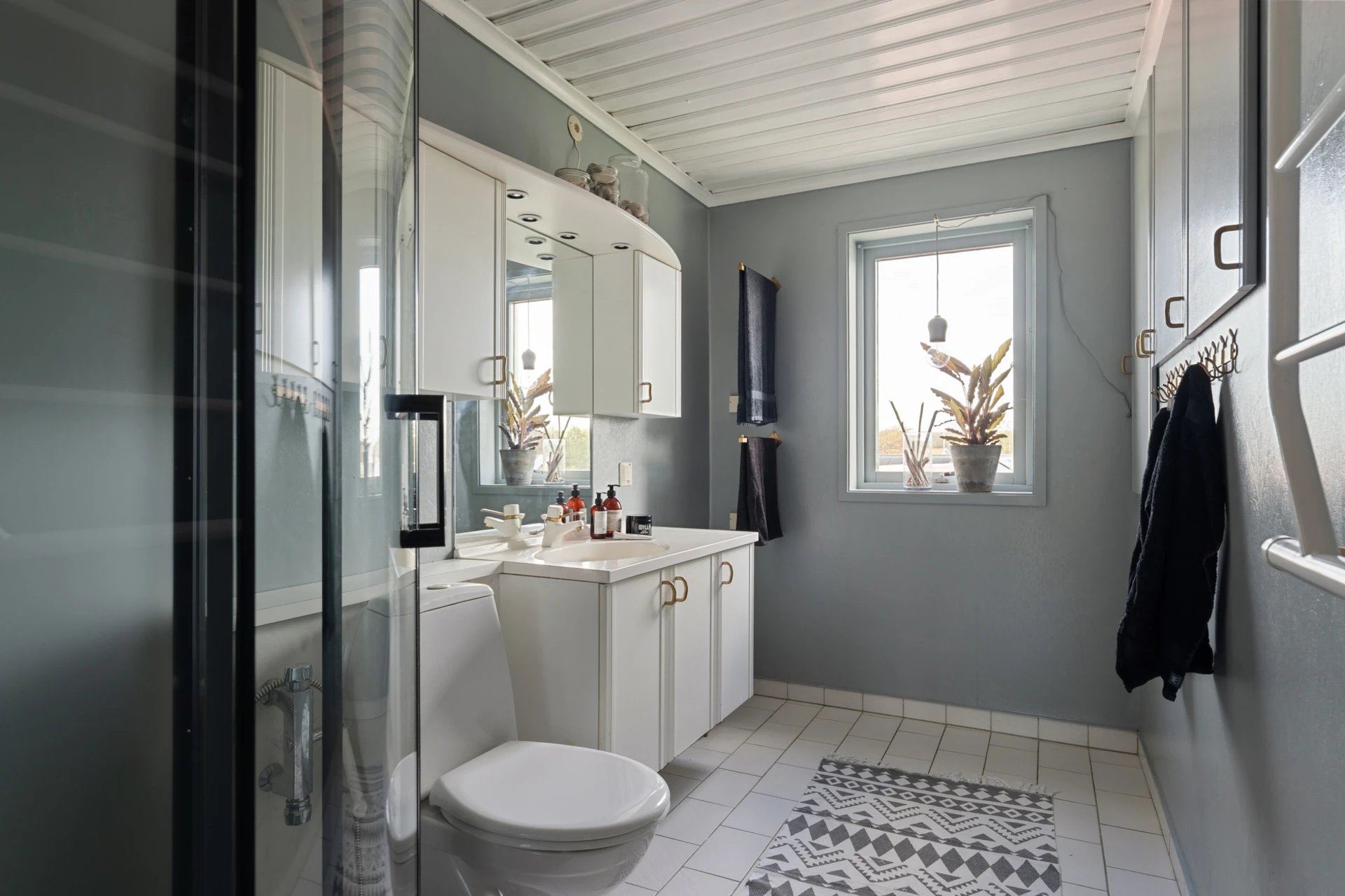 Klinkergolv med golvvärme och våtrumstapet i grått. Badrummet är inrett med WC, handfat med kommod, spegel, förvaringsskåp, dusch, samt handdukstork. Spotlights med dimmer.