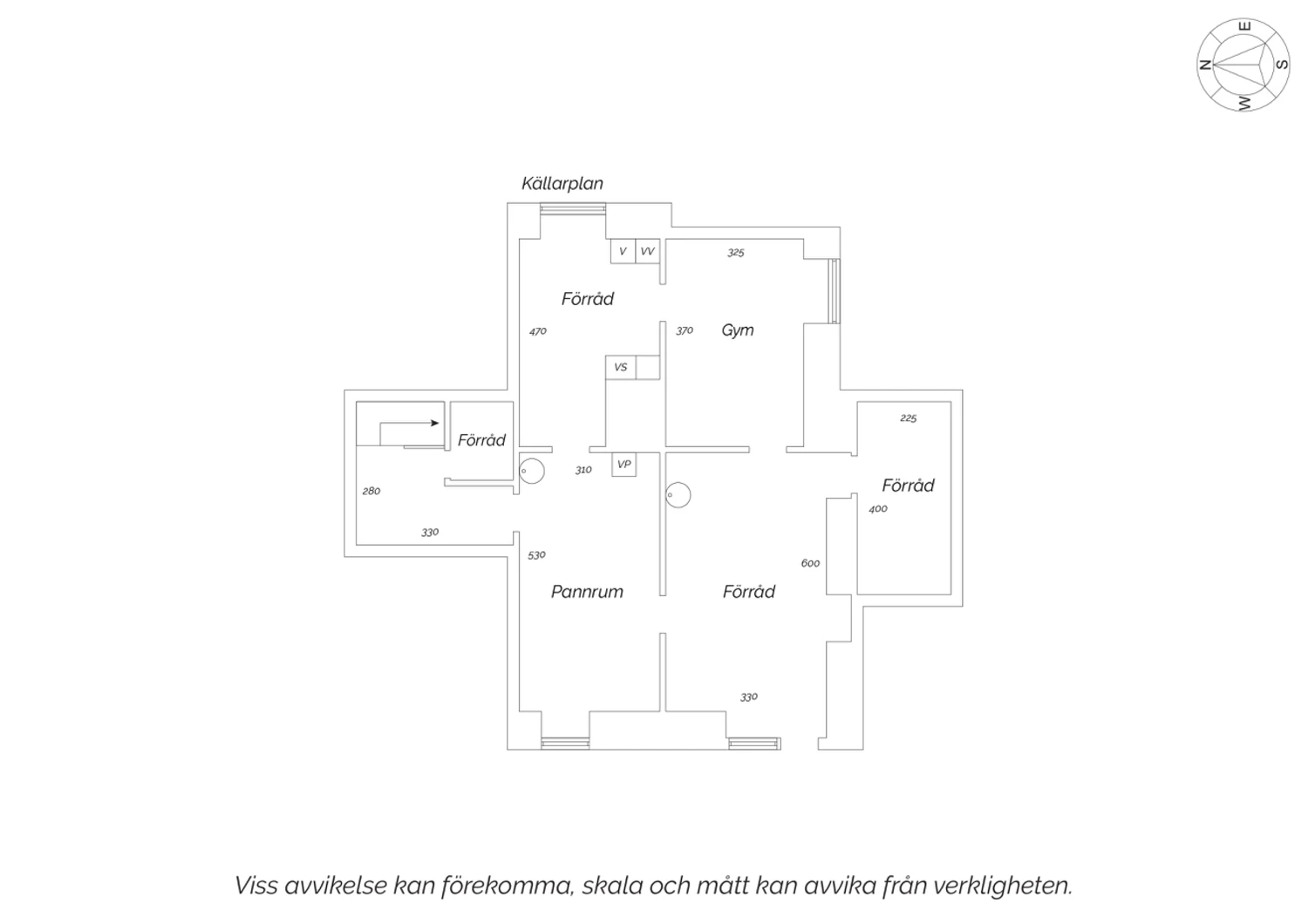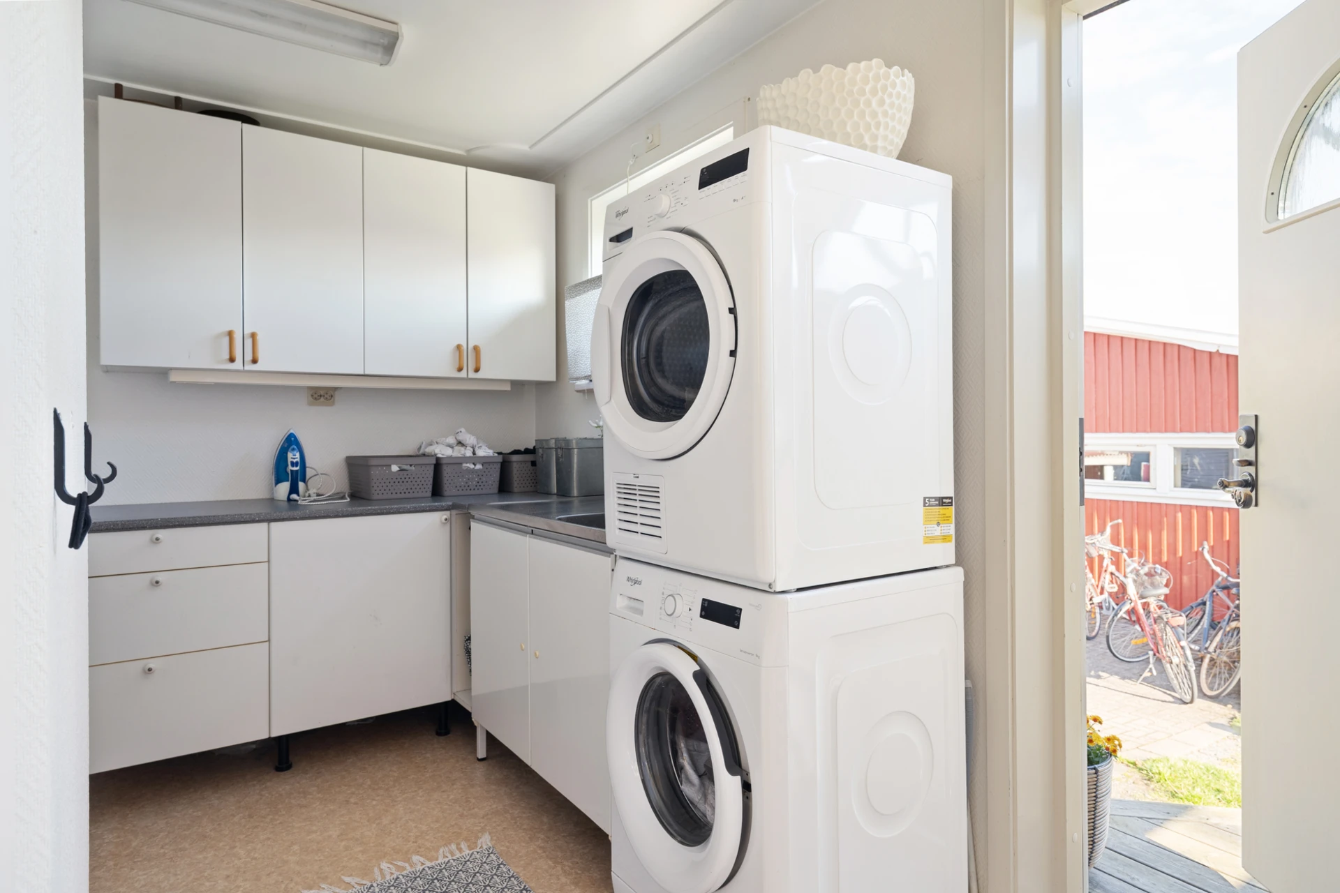Plastmatta och vitmålade väggar. Tvättstugan är utrustad med tvättmaskin, torktumlare samt arbetsyta med tvättho.