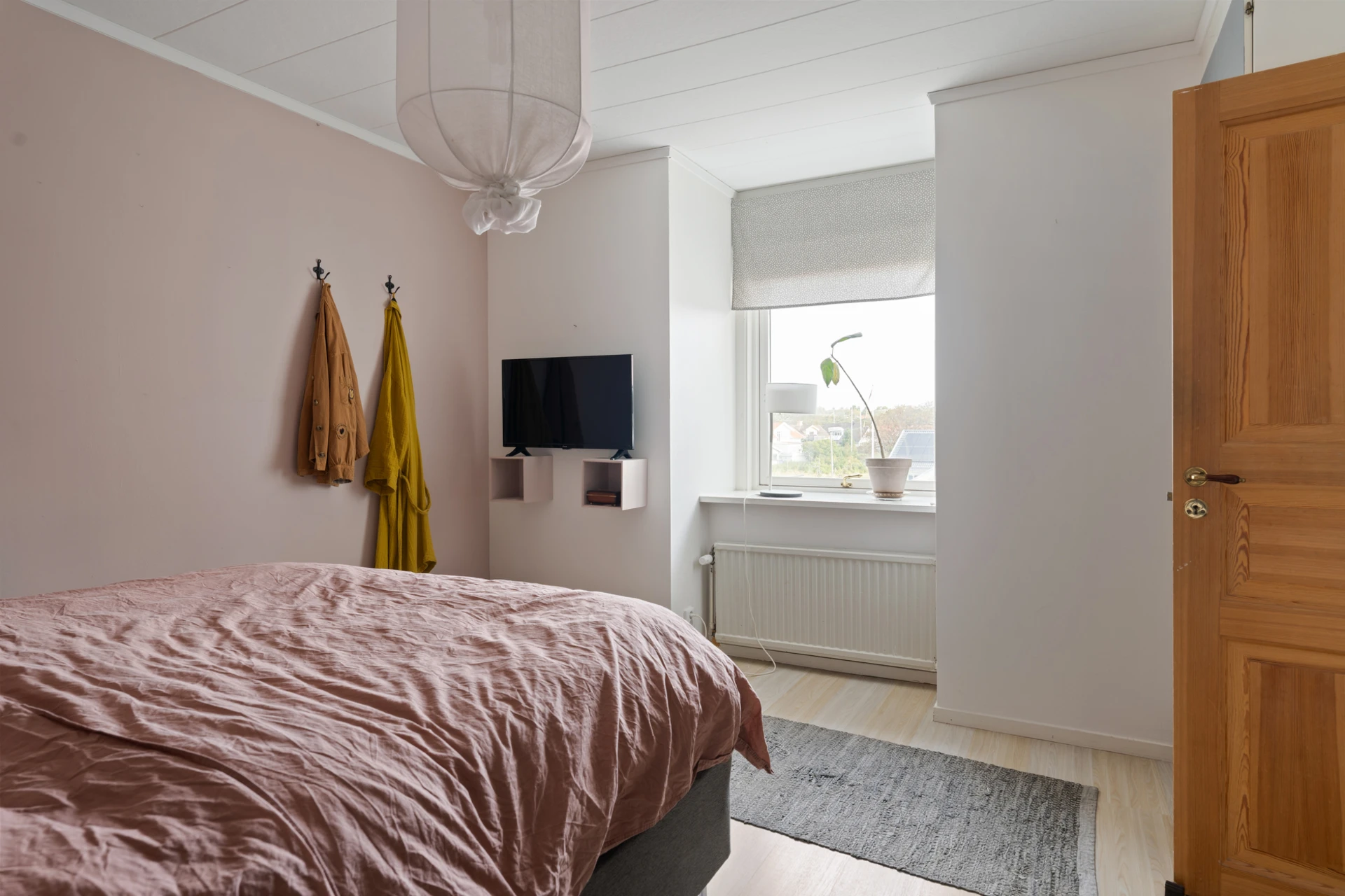 Laminatgolv och beigemålade väggar samt vit träpanel. Här finns plats för säng med tillhörande möblemang. Förvaring i en garderob.