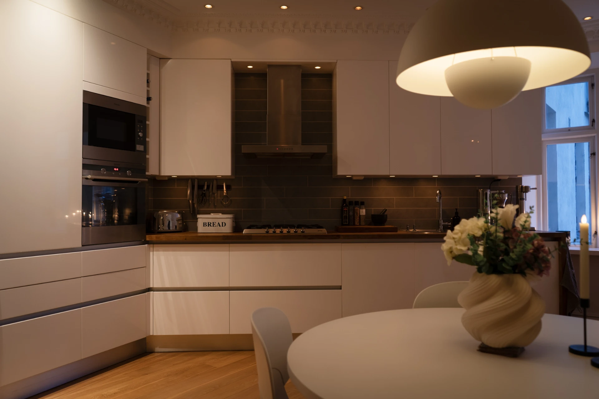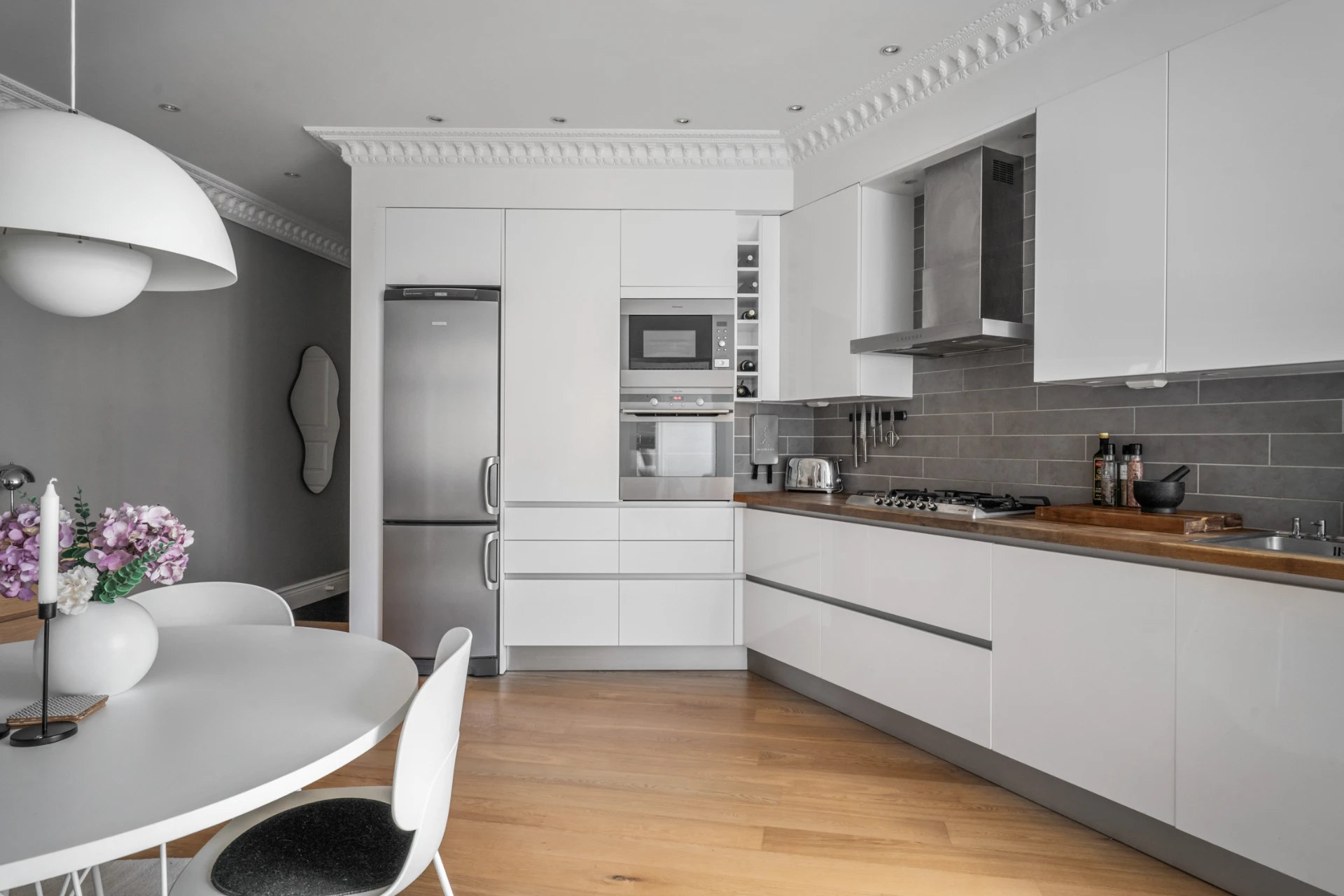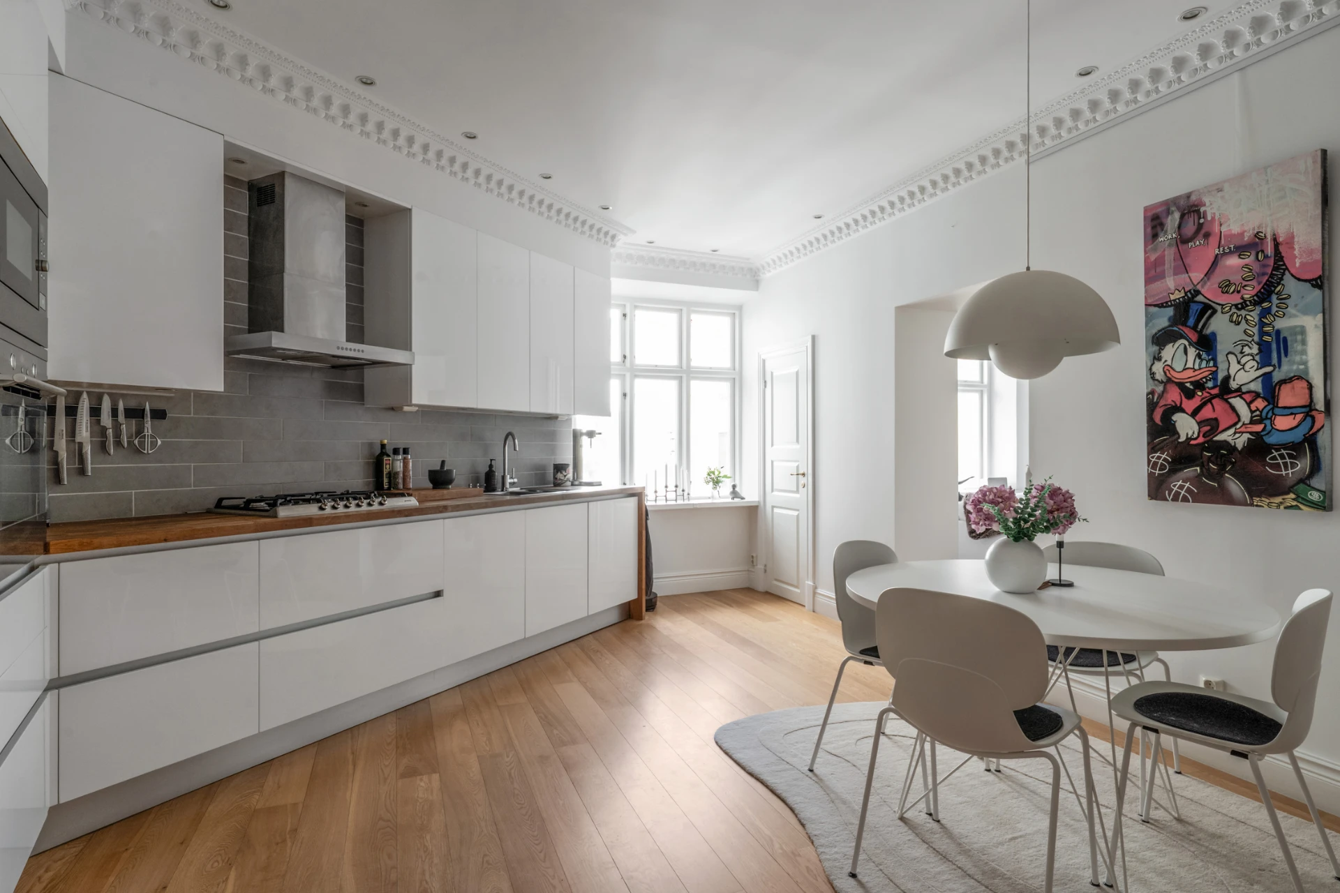 Ekparkett och ljust målade väggar. Vit köksinredning och ovanför köksbänken i ek sitter grått som stänkskydd. Köket är utrustat med kombinerad kyl/frys, inbyggd ugn och micro samt fläkt, gasspis (Smeg) integrerad diskmaskin (Electrolux) samt integrerad kombinerad tvättmaskin/torktumlare. Här finns gott om plats för stort matbord. I taket sitter infällda spotlights.