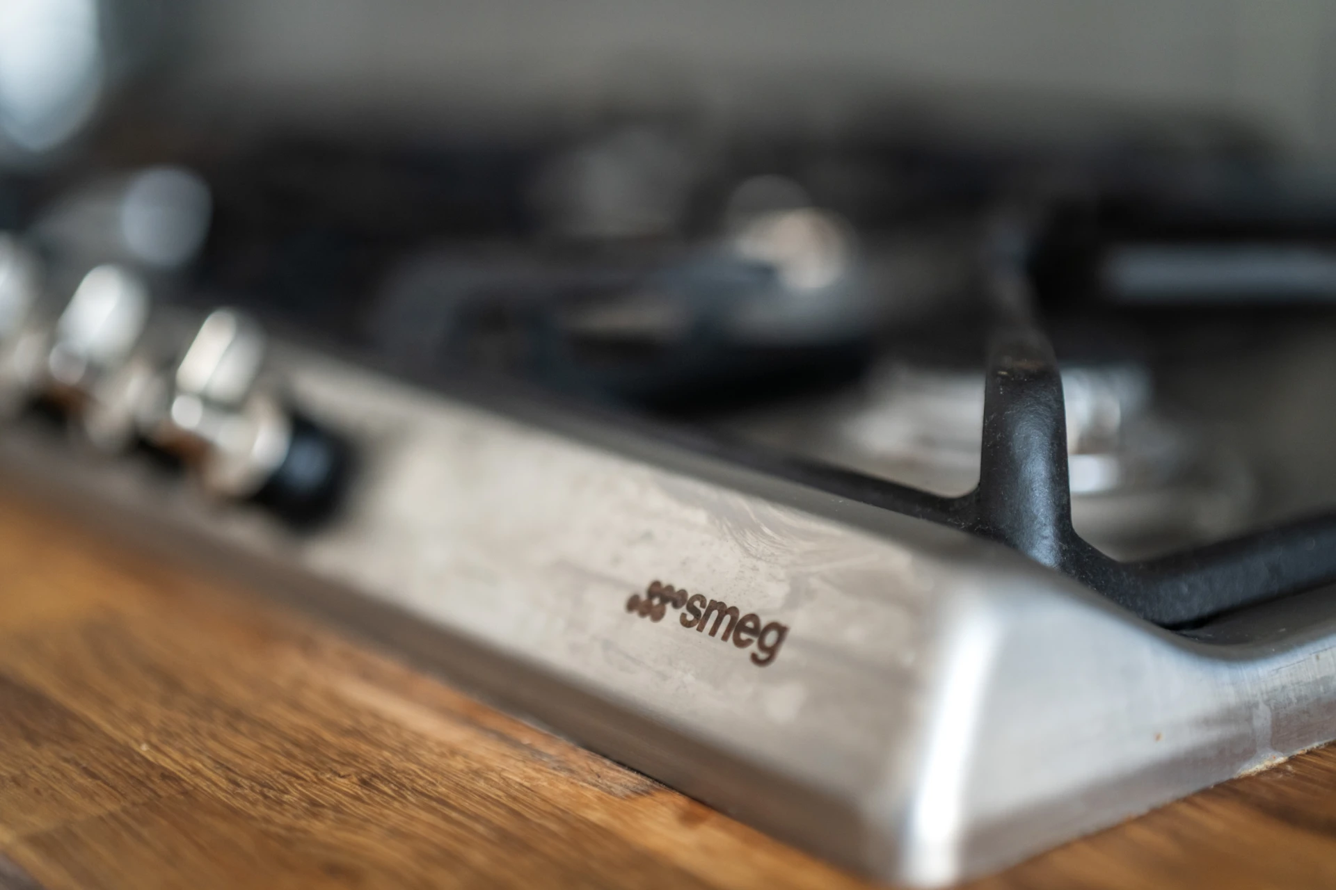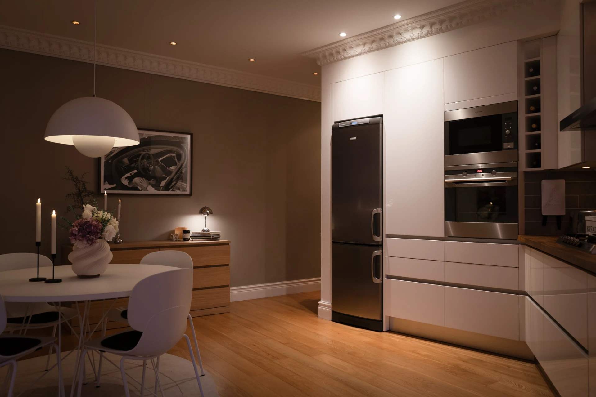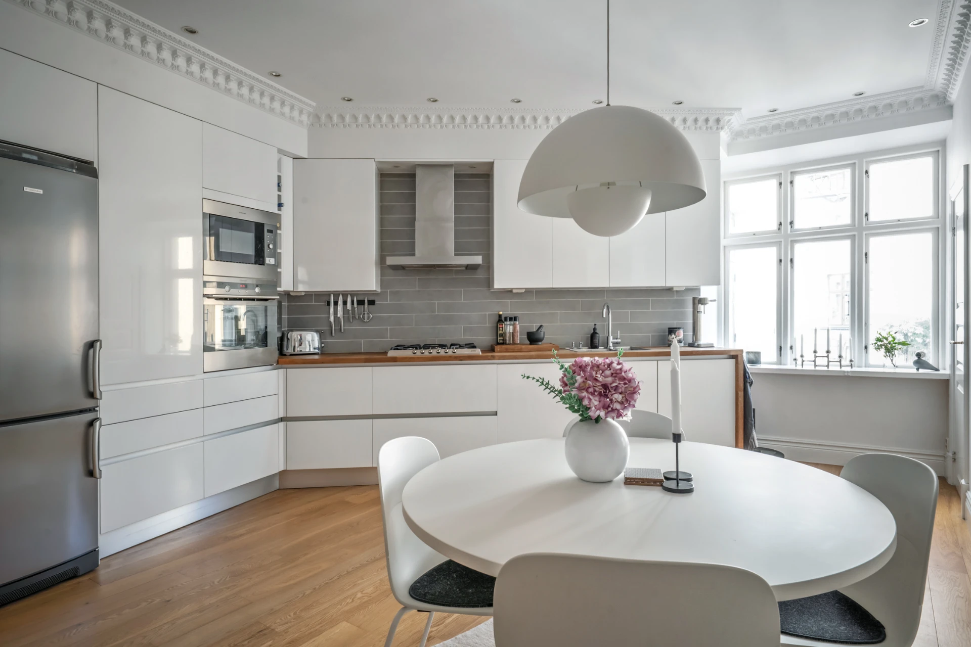 Ekparkett och ljust målade väggar. Vit köksinredning och ovanför köksbänken i ek sitter grått som stänkskydd. Köket är utrustat med kombinerad kyl/frys, inbyggd ugn och micro samt fläkt, gasspis (Smeg) integrerad diskmaskin (Electrolux) samt integrerad kombinerad tvättmaskin/torktumlare. Här finns gott om plats för stort matbord. I taket sitter infällda spotlights.