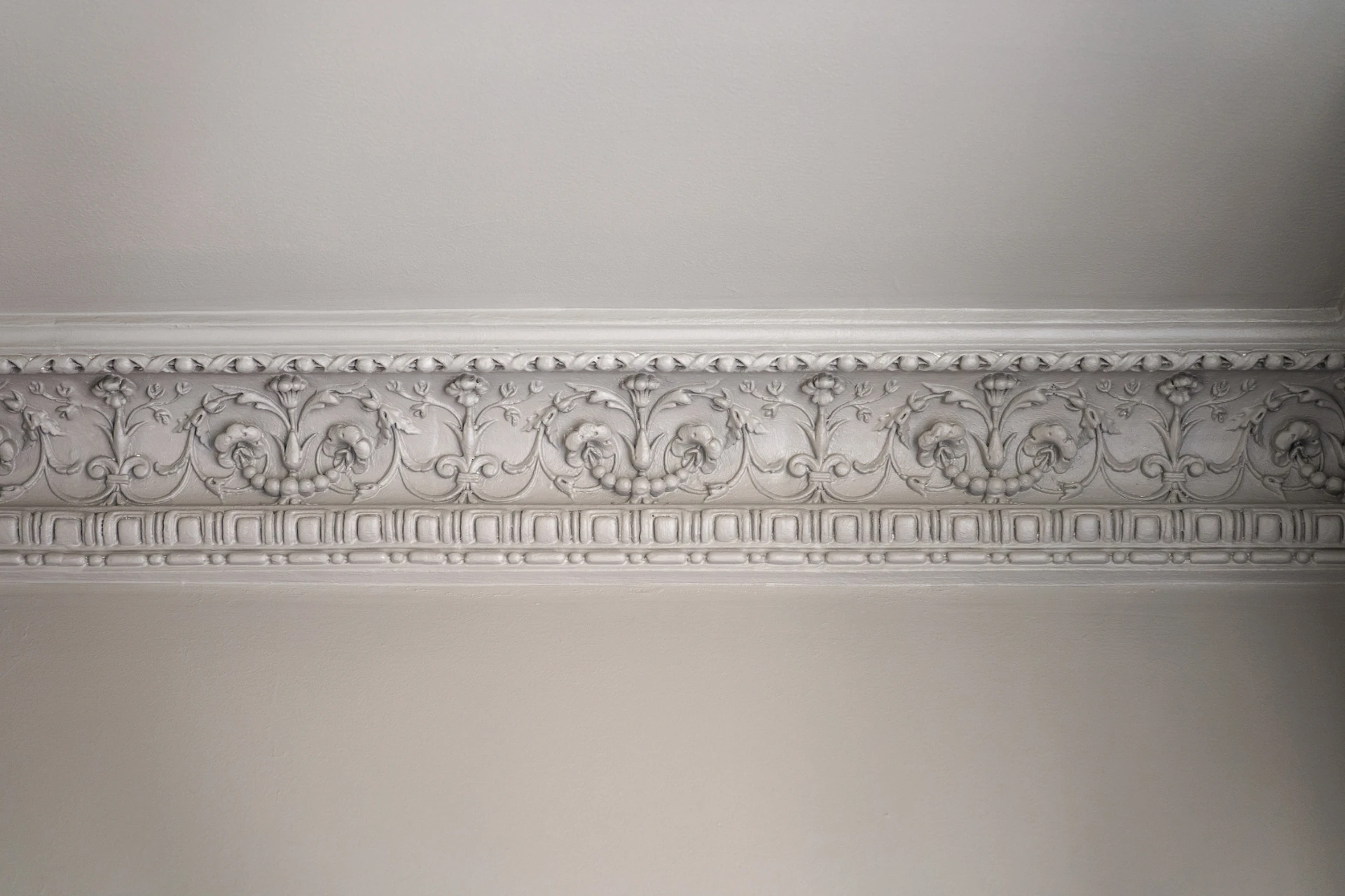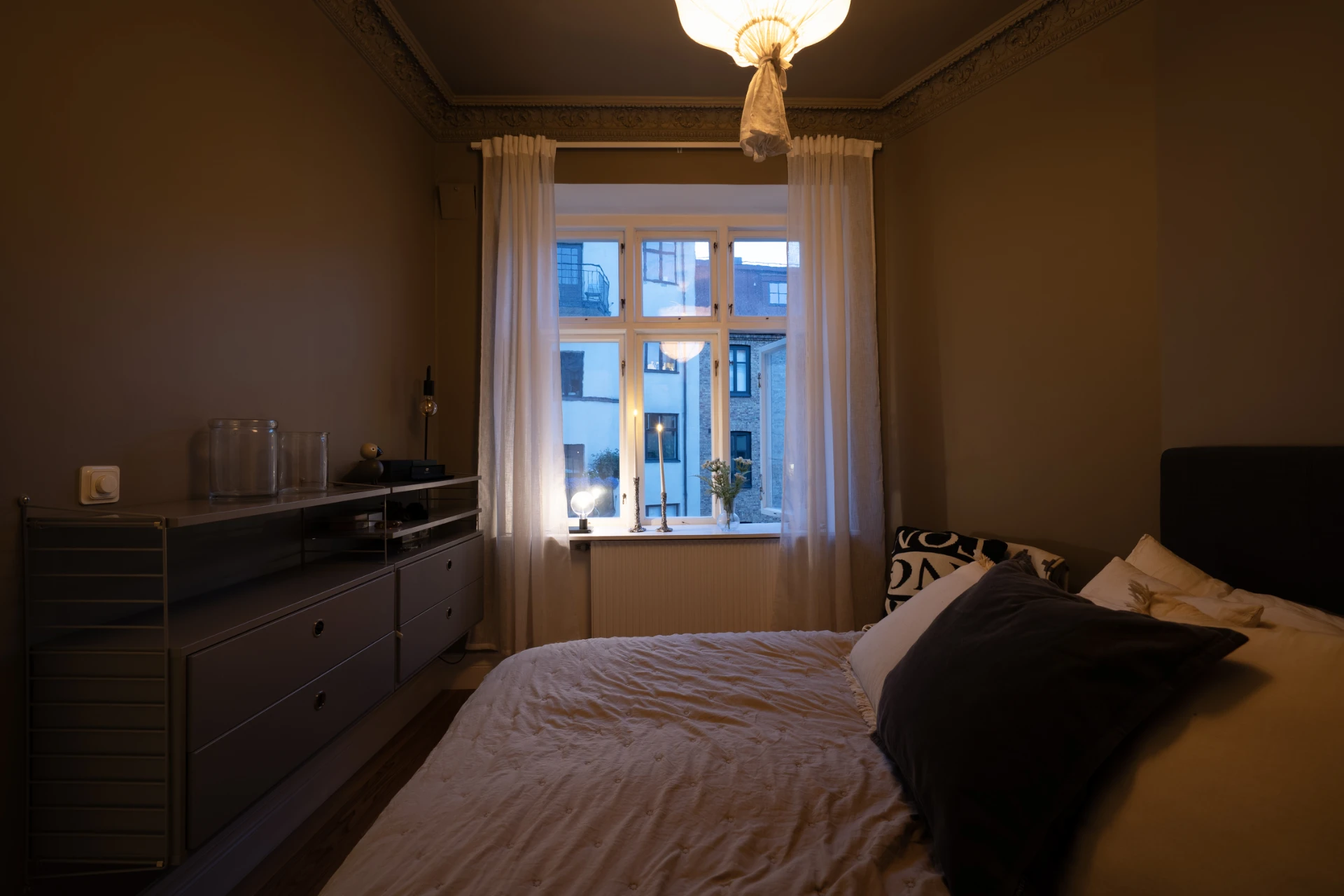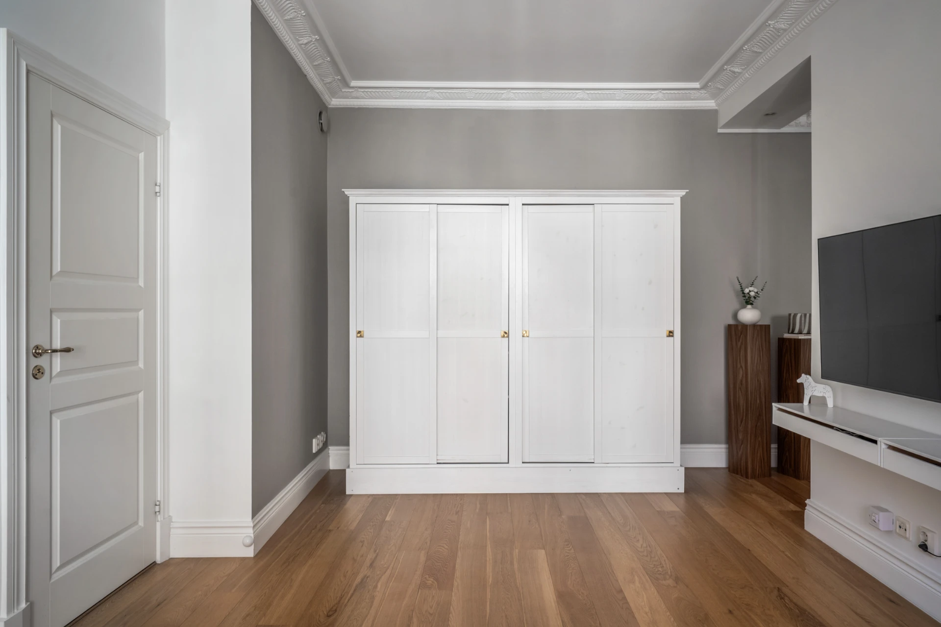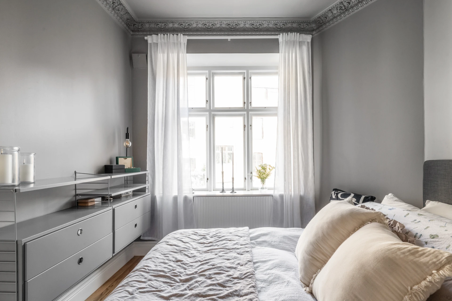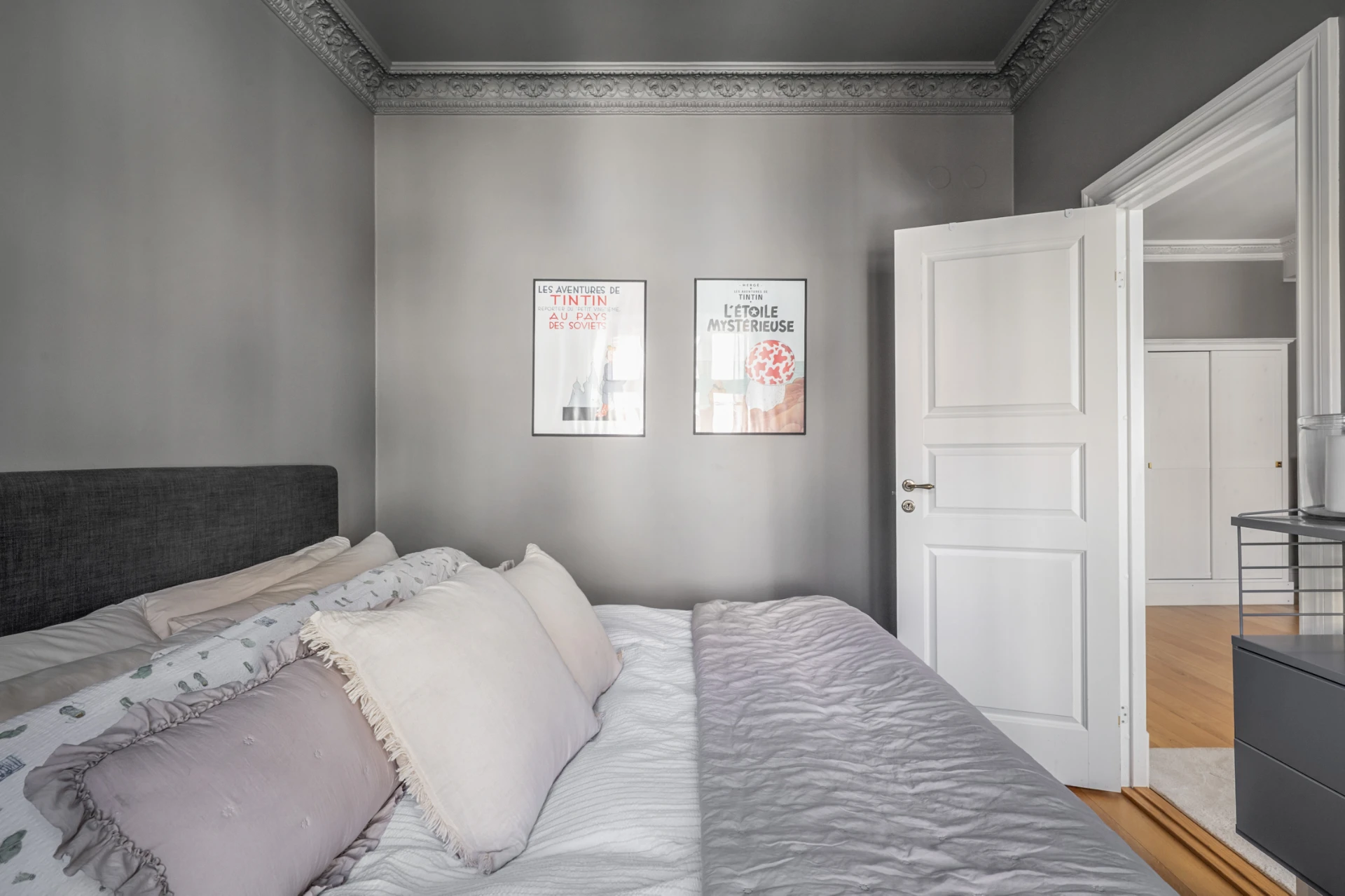 Ekparkett samt gråmålade väggar. Här finns plats för dubbelsäng med tillhörande sängbord. Det stora fönsterpartiet släpper generöst in ljus, medan väggarna ramas in av elegant stuckatur.
