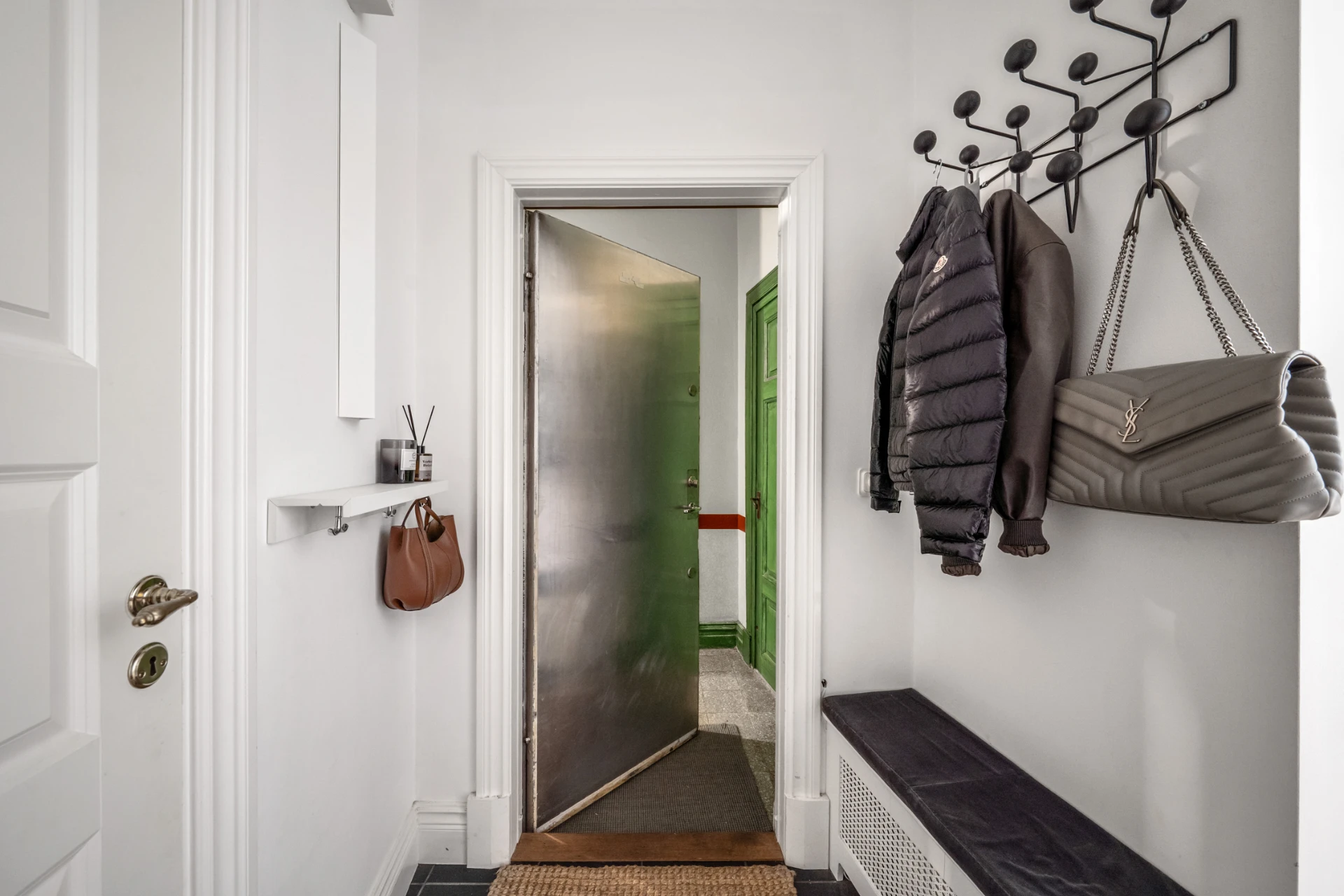 Klinkergolv i en mörkgrå färg samt ljust målade väggar. Här finns plats för avhängning samt ytterligare förvaring i en klädkammare. I taket sitter infällda spotlights.
