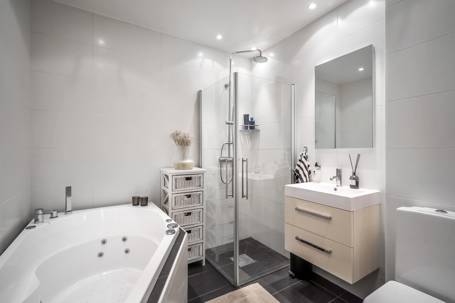 Klinkergolv med golvvärme och helkaklade väggar. Badrummet är inrett med WC, handfat med kommod, bubbelbadkar samt separat takdusch med vikbara glasväggar.