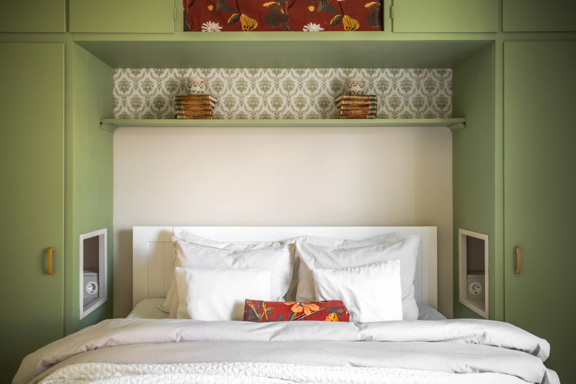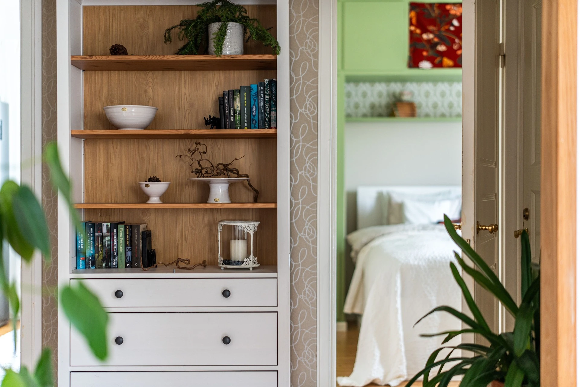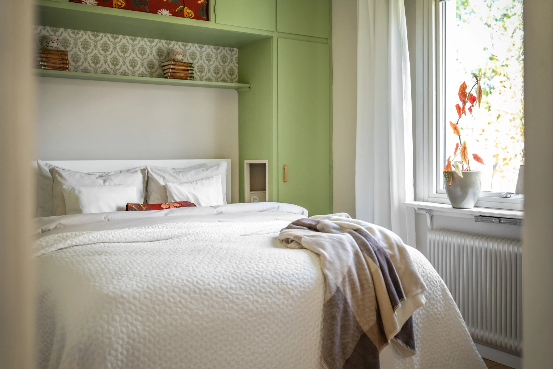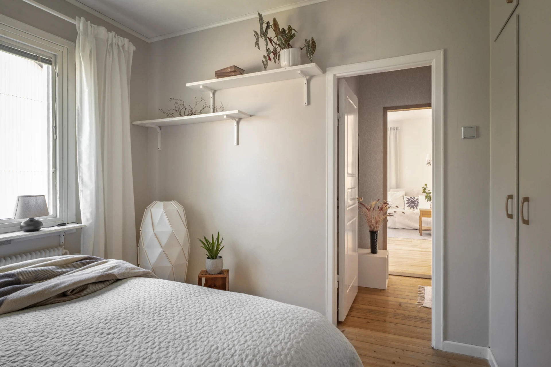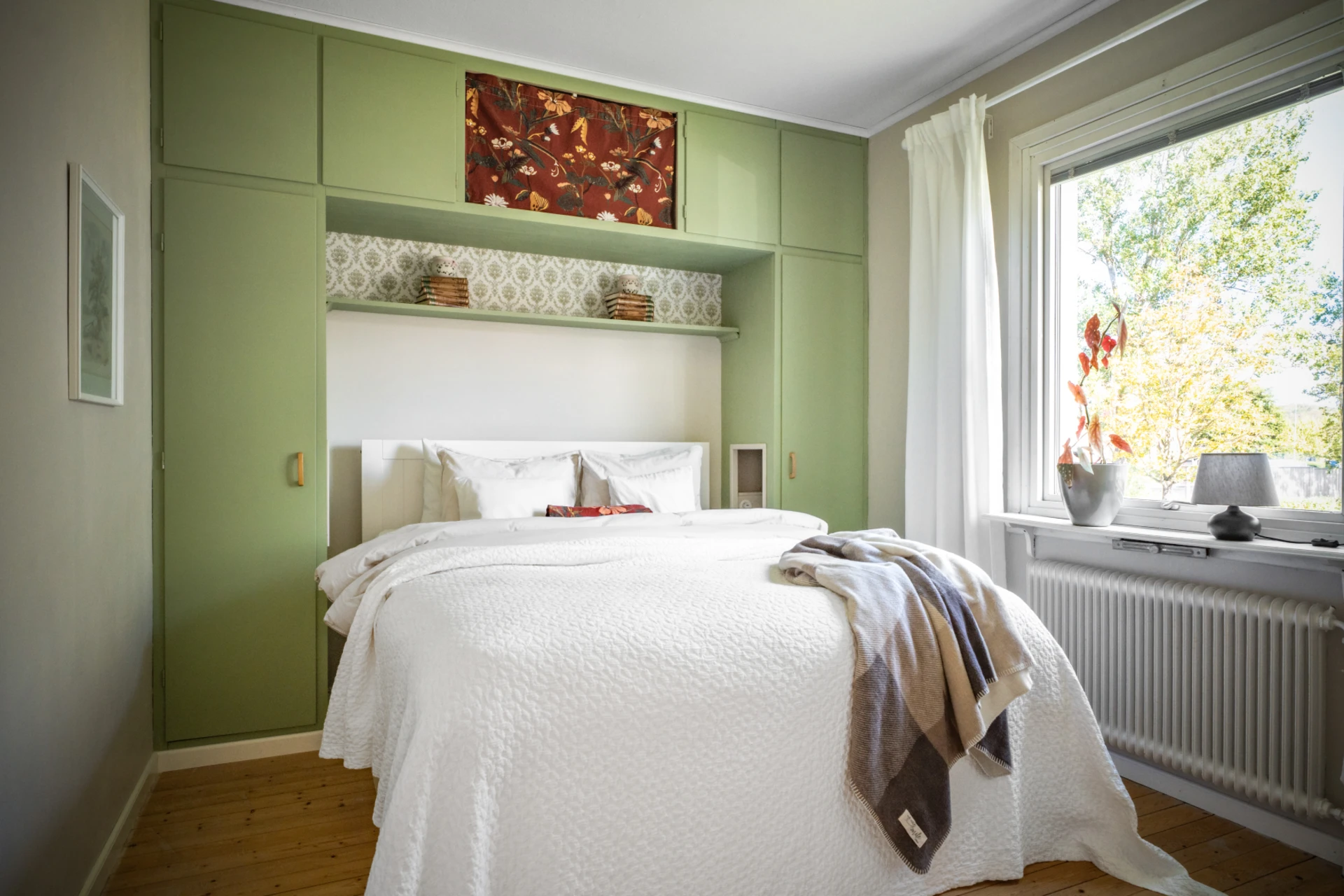 Sovrummet går i ljusa toner tillsammans med ett charmigt plankgolv. Här finns plats för en dubbelsäng och goda förvaringsmöjligheter i form av garderob.