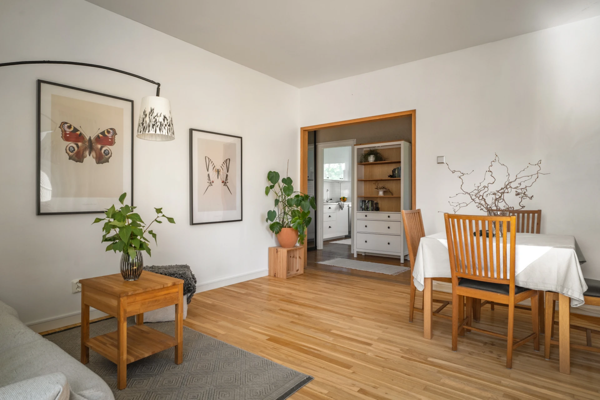Vardagsrummet går i ljusa toner med ekparkett och erbjuder en öppen planlösningen med rikligt ljusinsläpp från fönsterpartierna. Här finns plats för soffgrupp och övrig möblemang som önskas.
