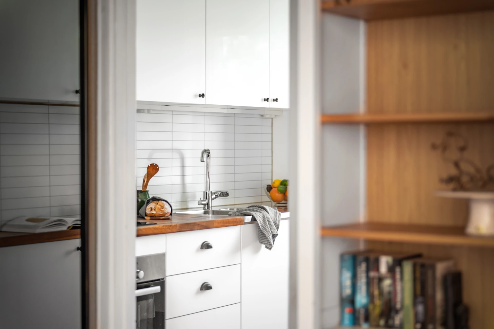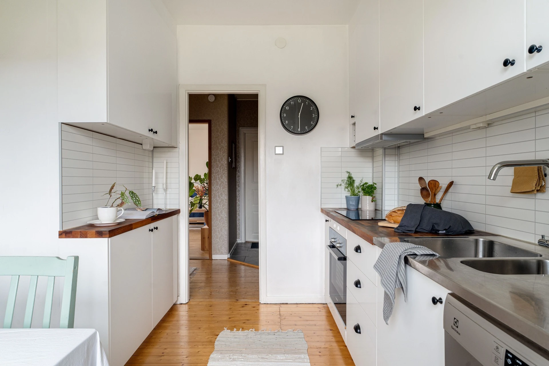 Ljusa köksluckor kombinerat med rejäl bänkyta i trä ger köket en känsla av klassisk design. Utrustningen består av spis/ugn, spisfläkt, diskmaskin, samt kyl och frys. Planlösningen erbjuder en matplats invid fönstret.