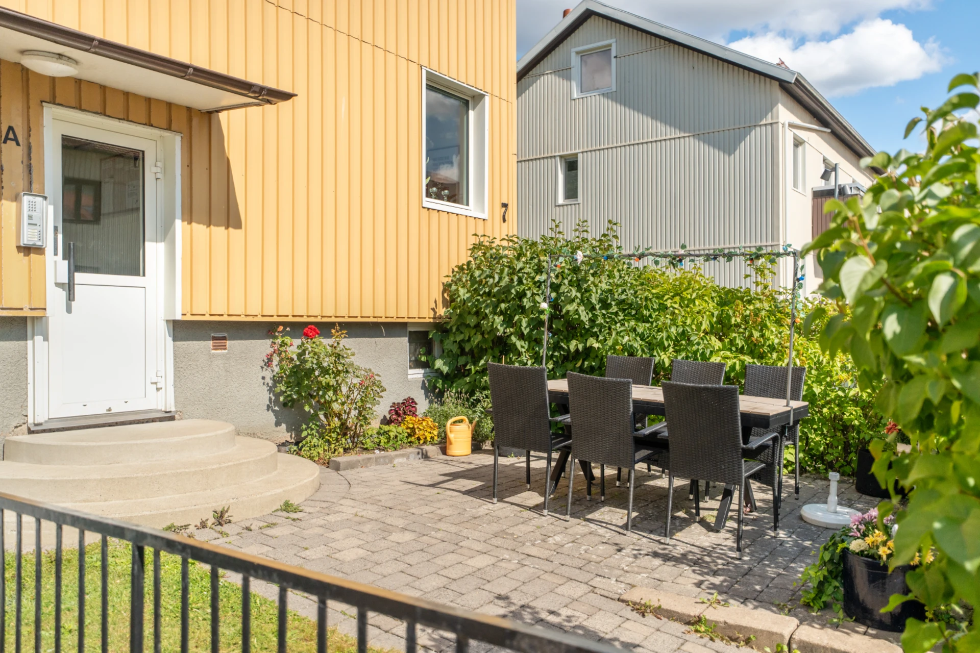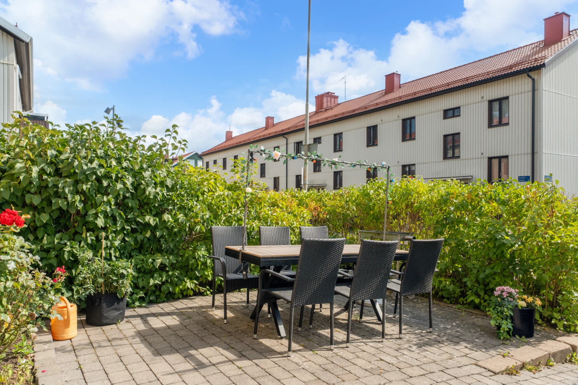Gemensam förgård med utemöbler.