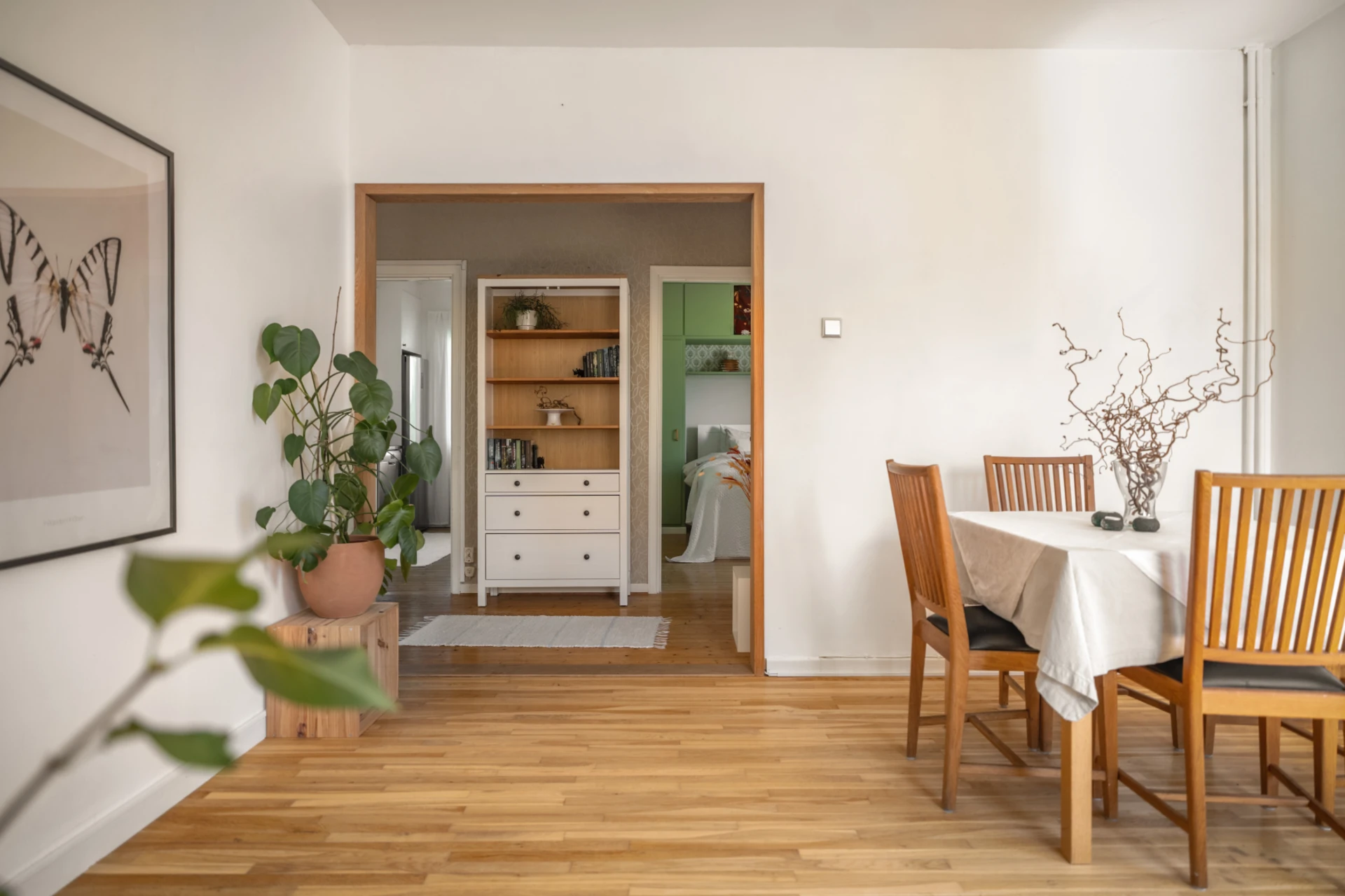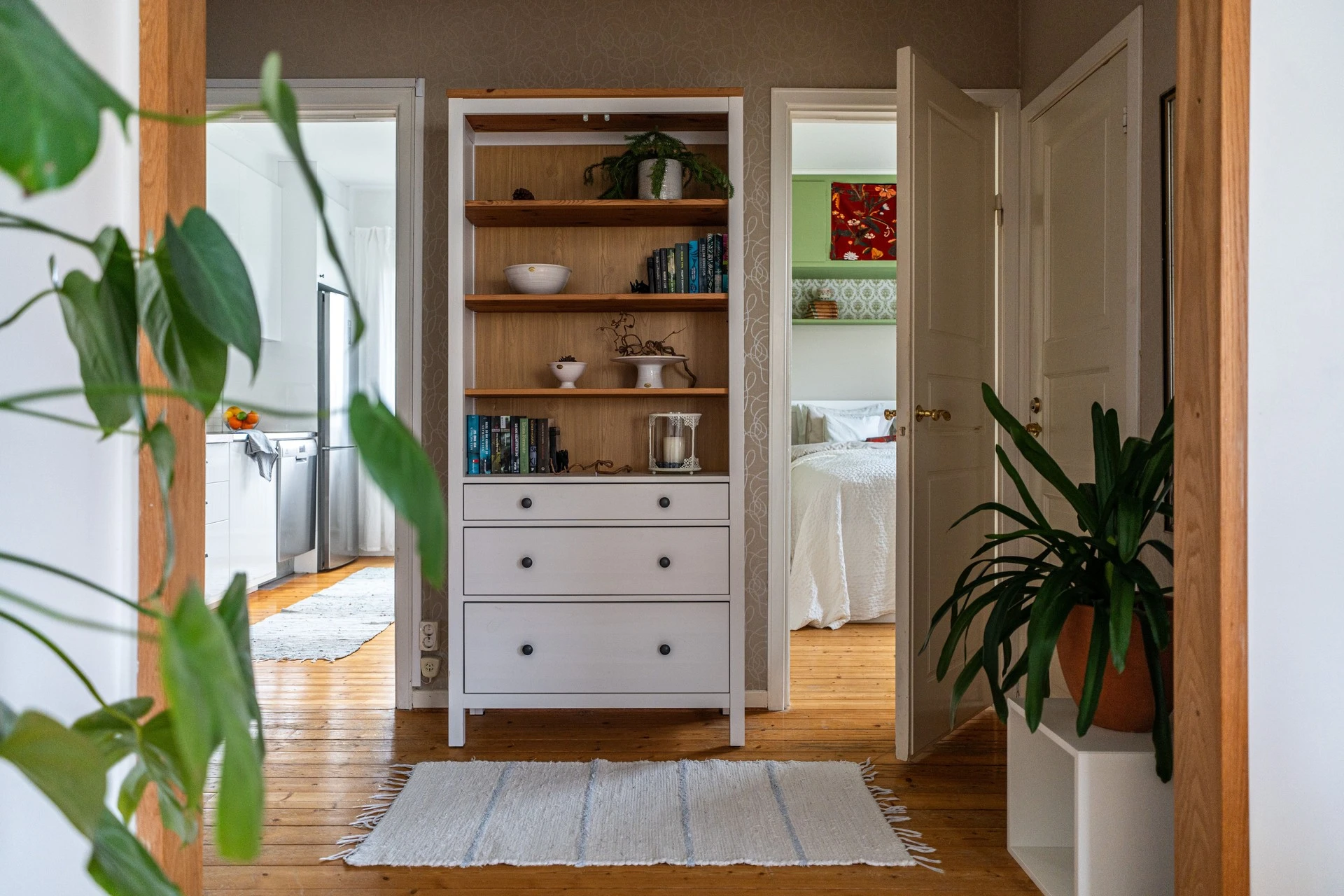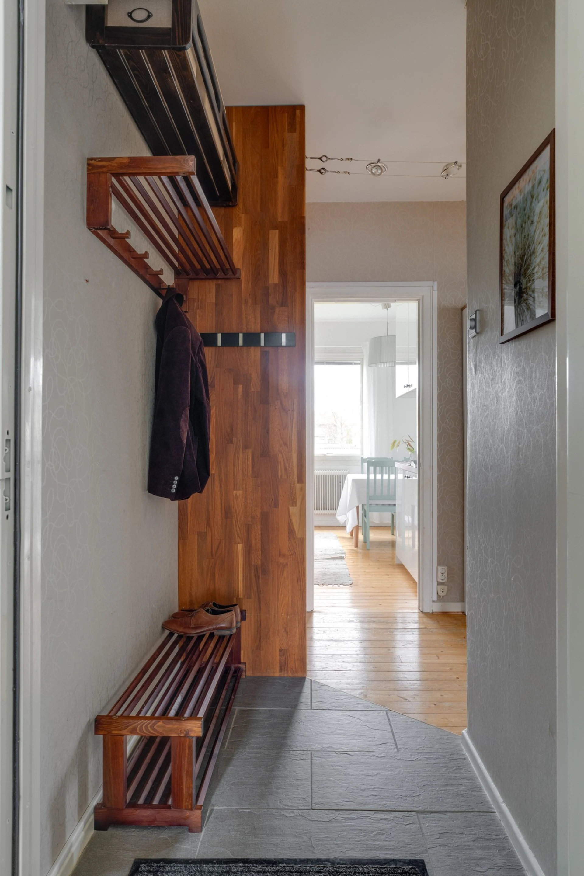Här välkomnas du av en ljus och rymlig hall med mycket goda förvaringsmöjligheter. Ljusa väggar och ett fint klinkergolv ger en trivsam känsla. Från hallen nås bostadens alla rum.