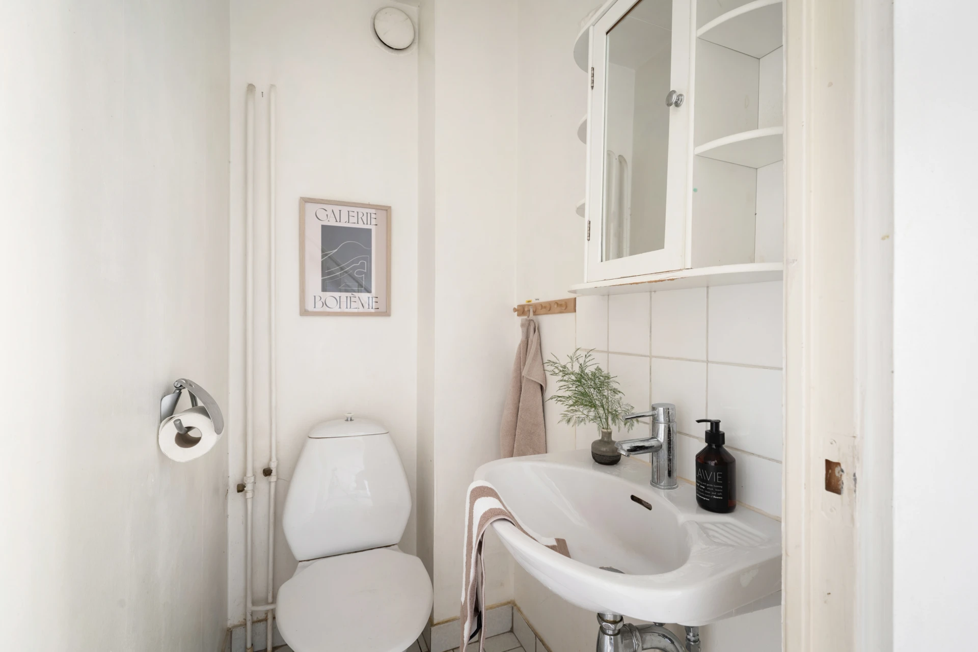 Klinkergolv och ljusa väggar. Här finns WC-stol, spegelskåp och handfat.