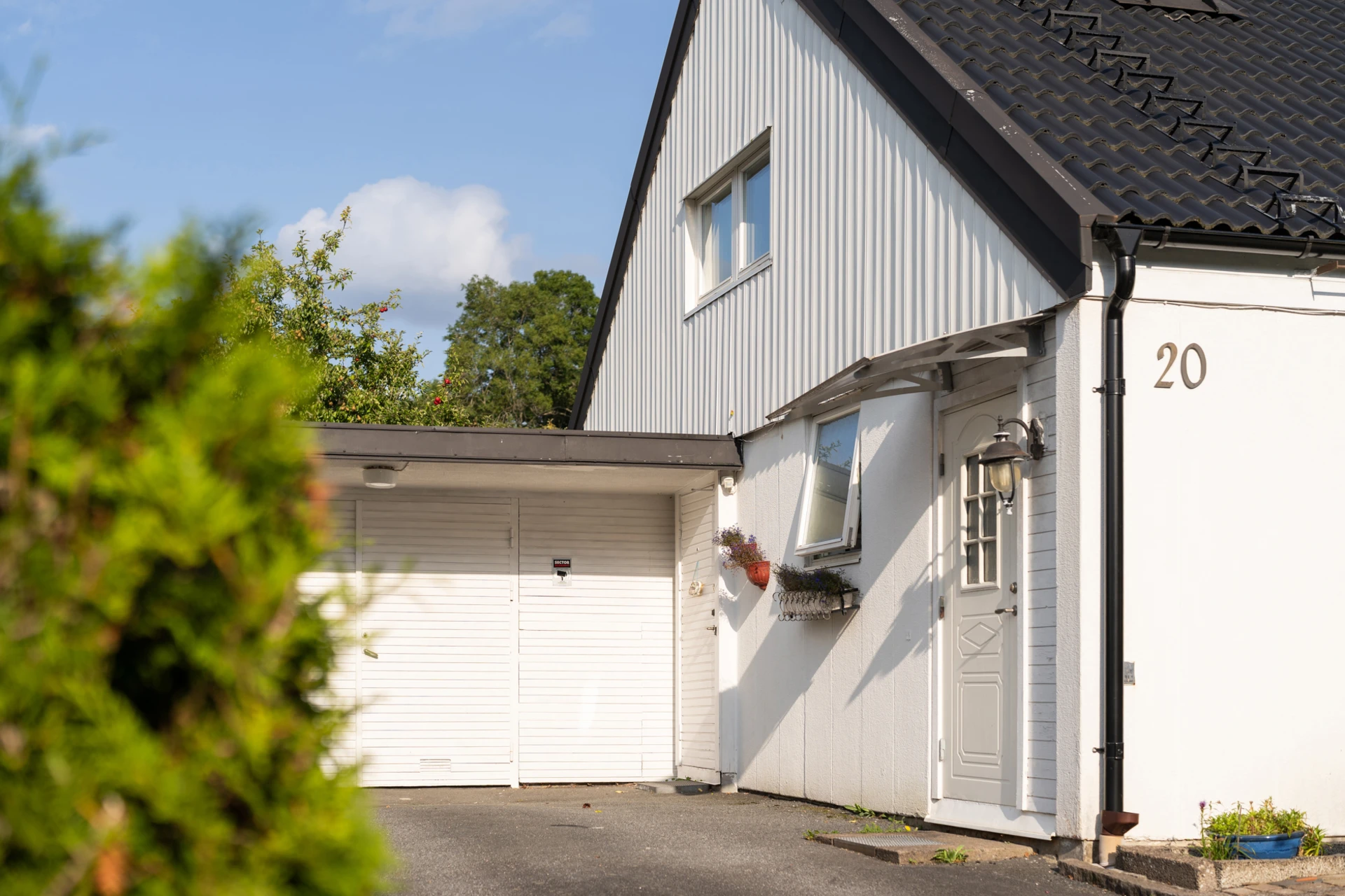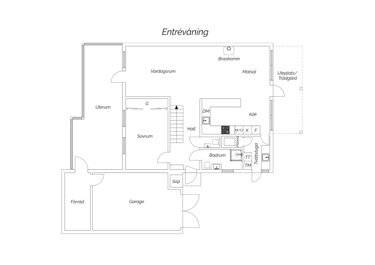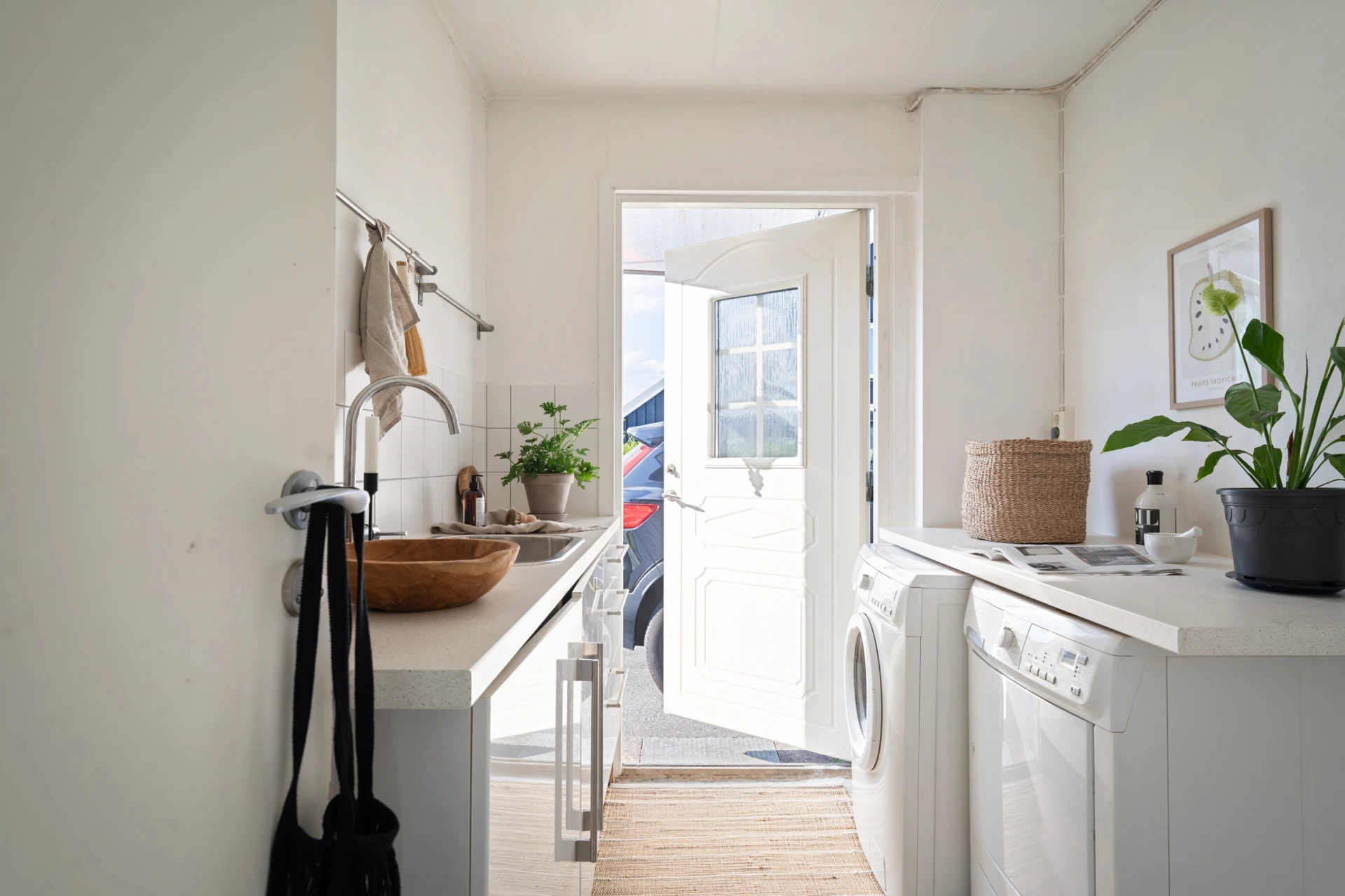 Här finns tvättho med bänkyta, förvaring samt tvättmaskin och torktumlare. Groventré till bostadens uppfart.
