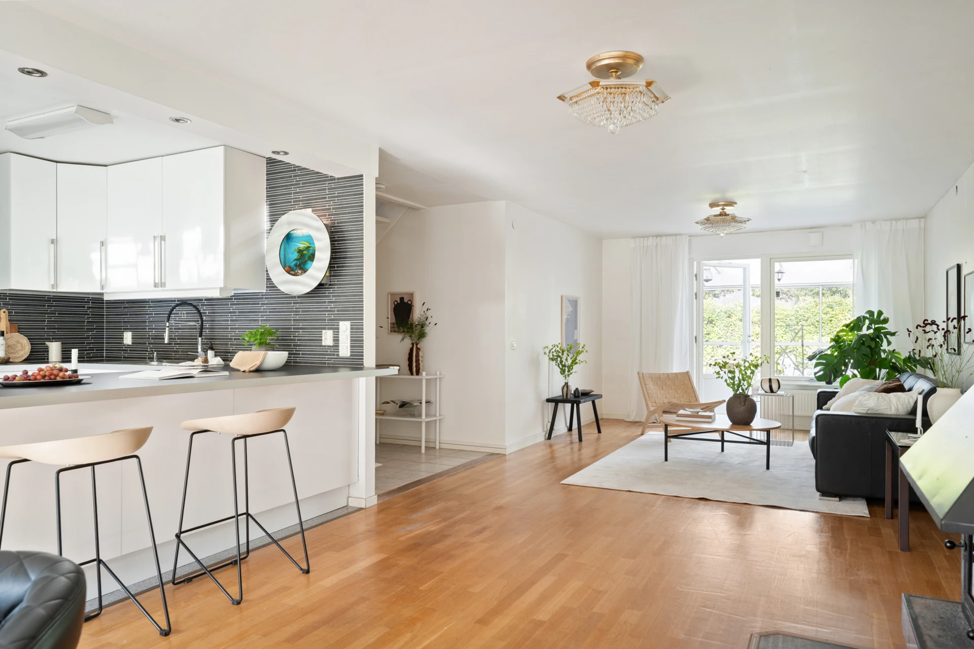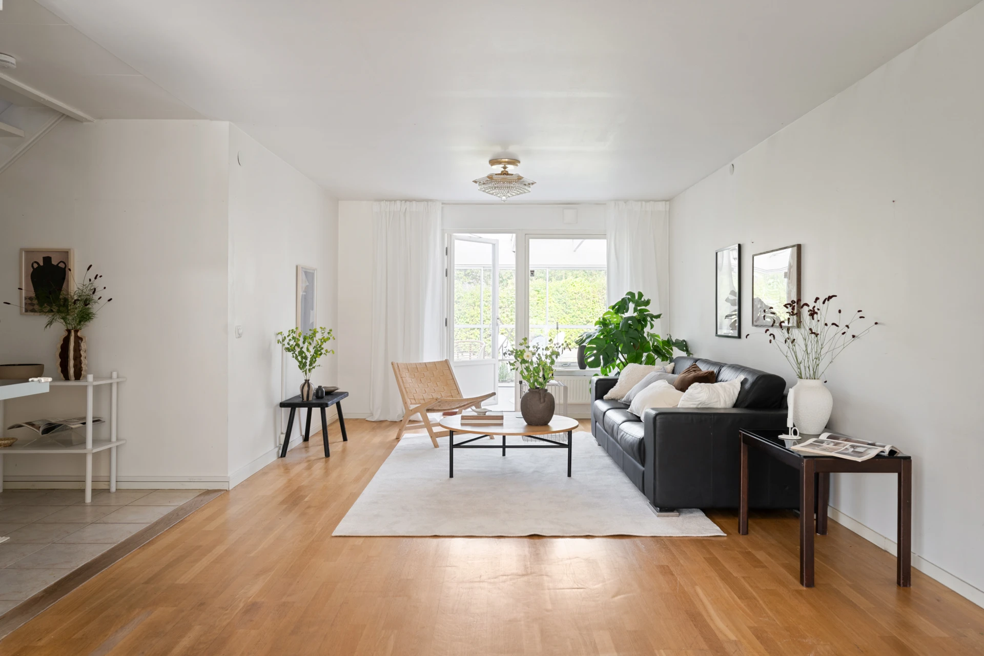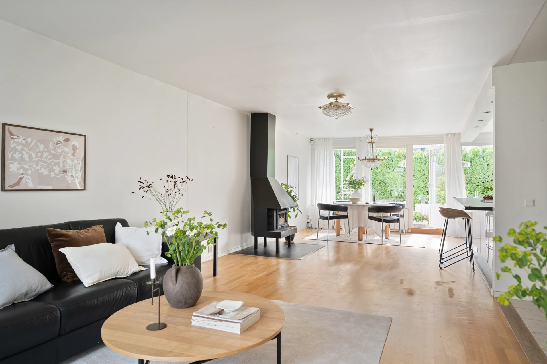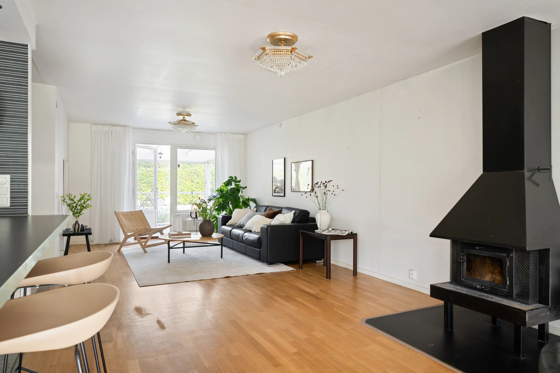 Parkettgolv och ljusa väggar. Stor öppen miljö med plats för stor soffgrupp med tillhörande möblemang och matsalsbord intill köket. Här finns även en eldstad. Från vardagsrumsdelen nås bostadens inglasade uterum och innergård.