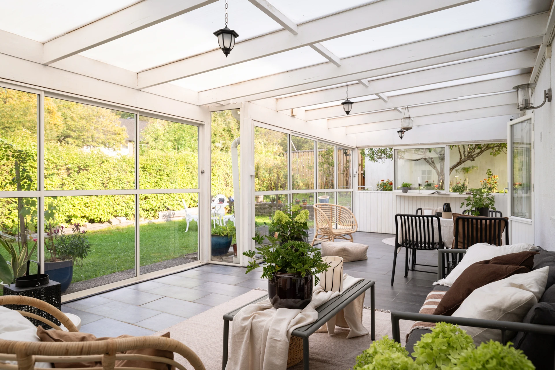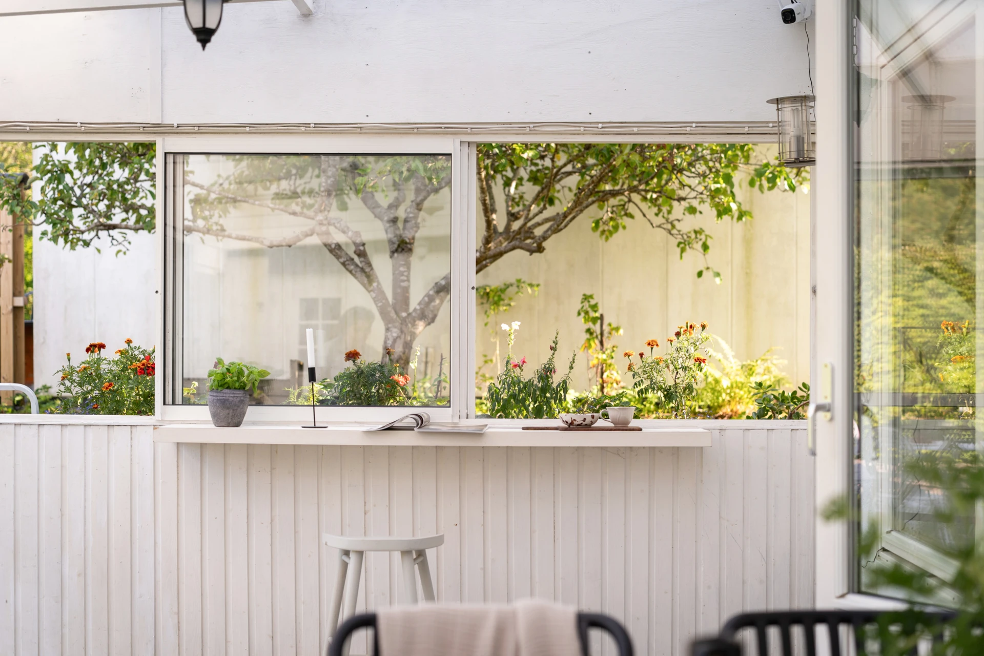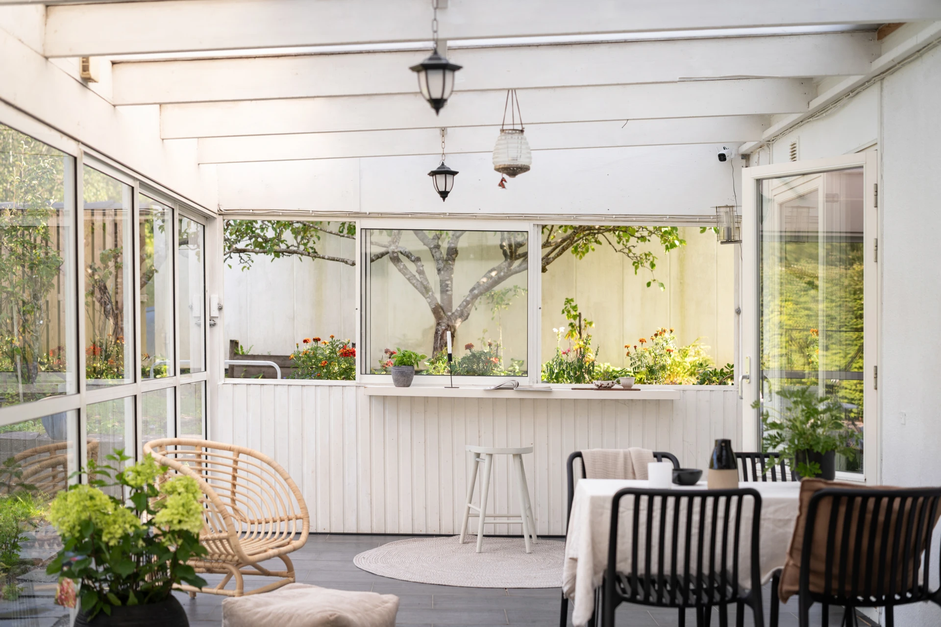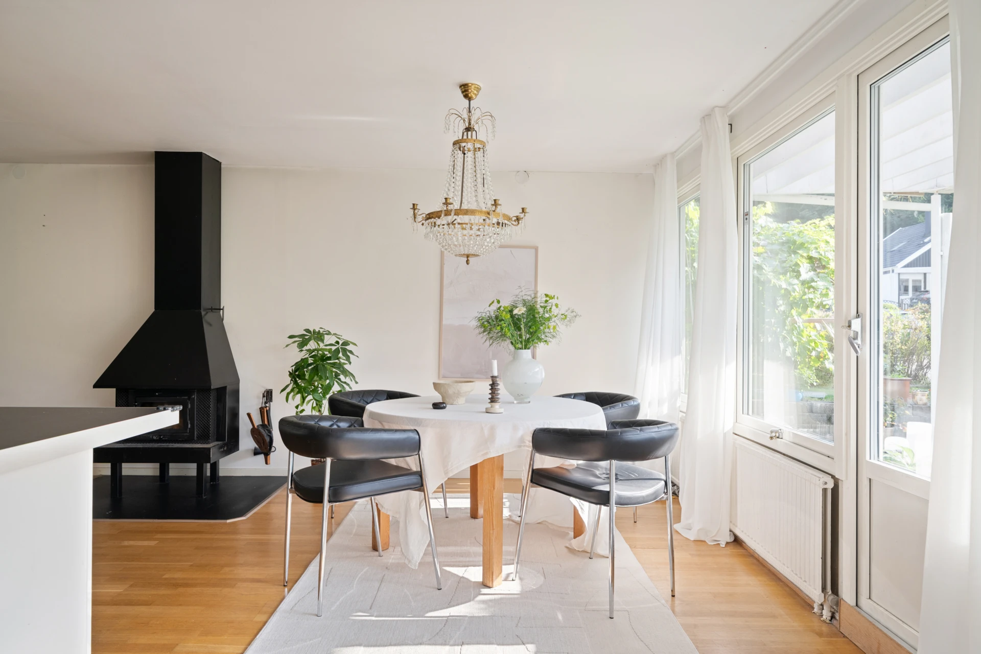 Klinkergolv och skjutbara glaspartier. Här ryms gott om sällskapsmöblemang och garaget ligger i direkt anslutning.