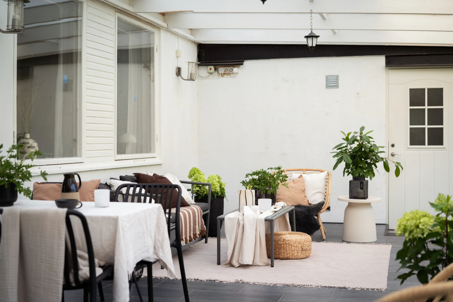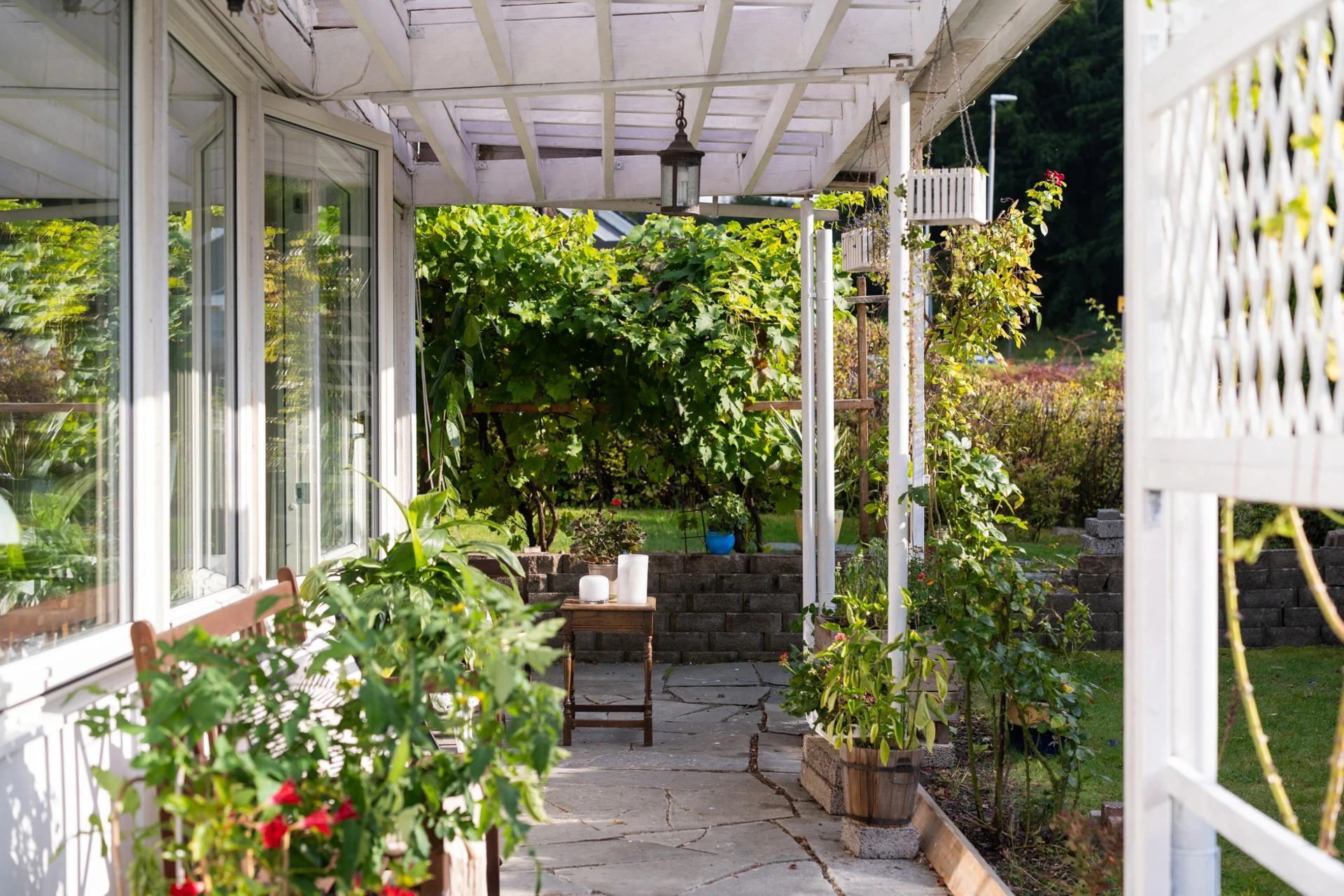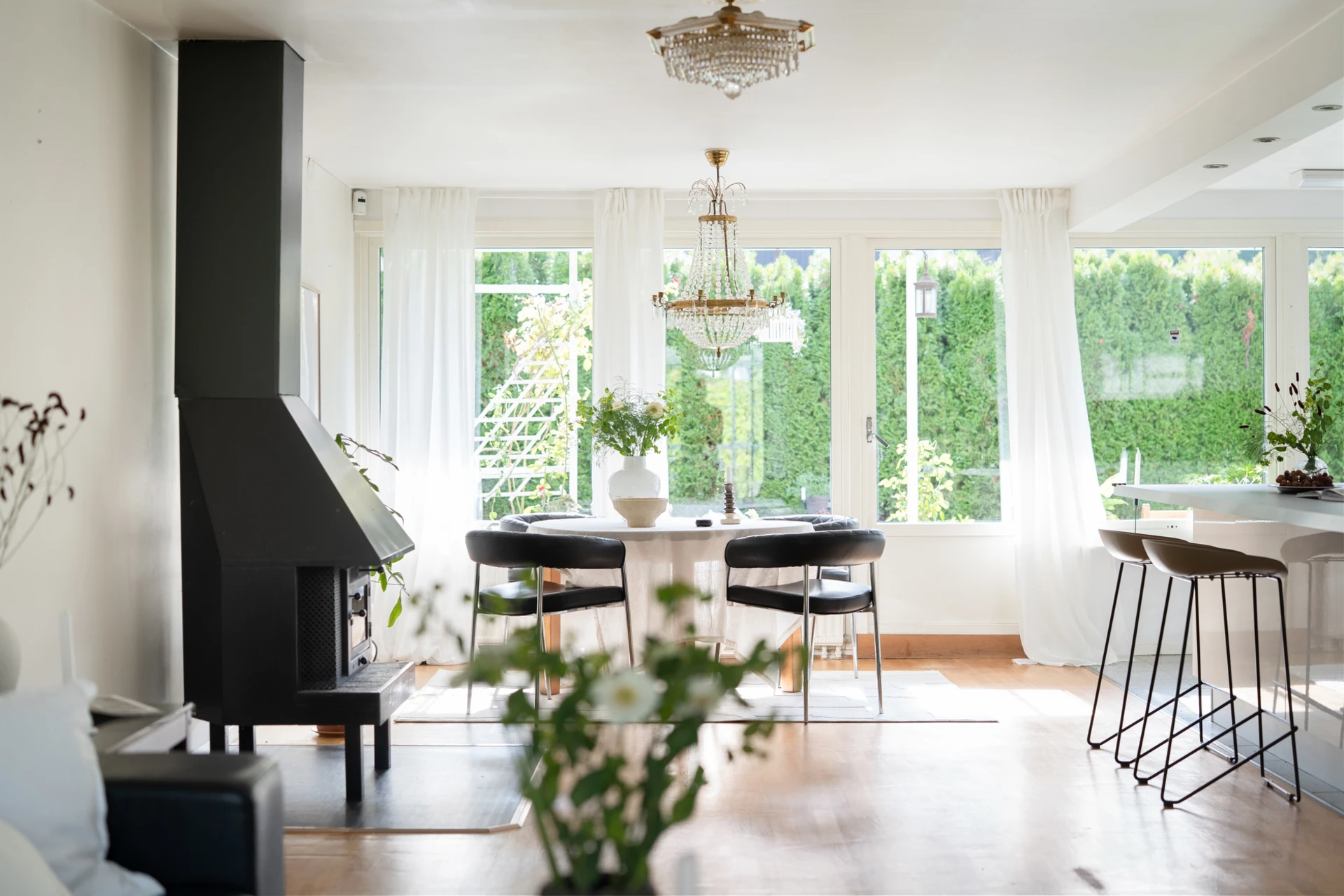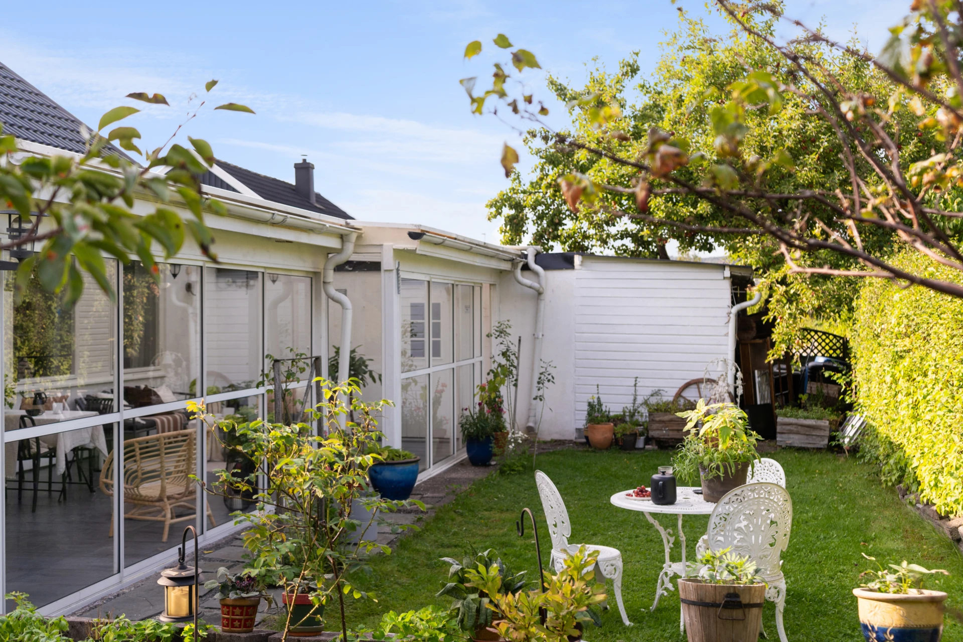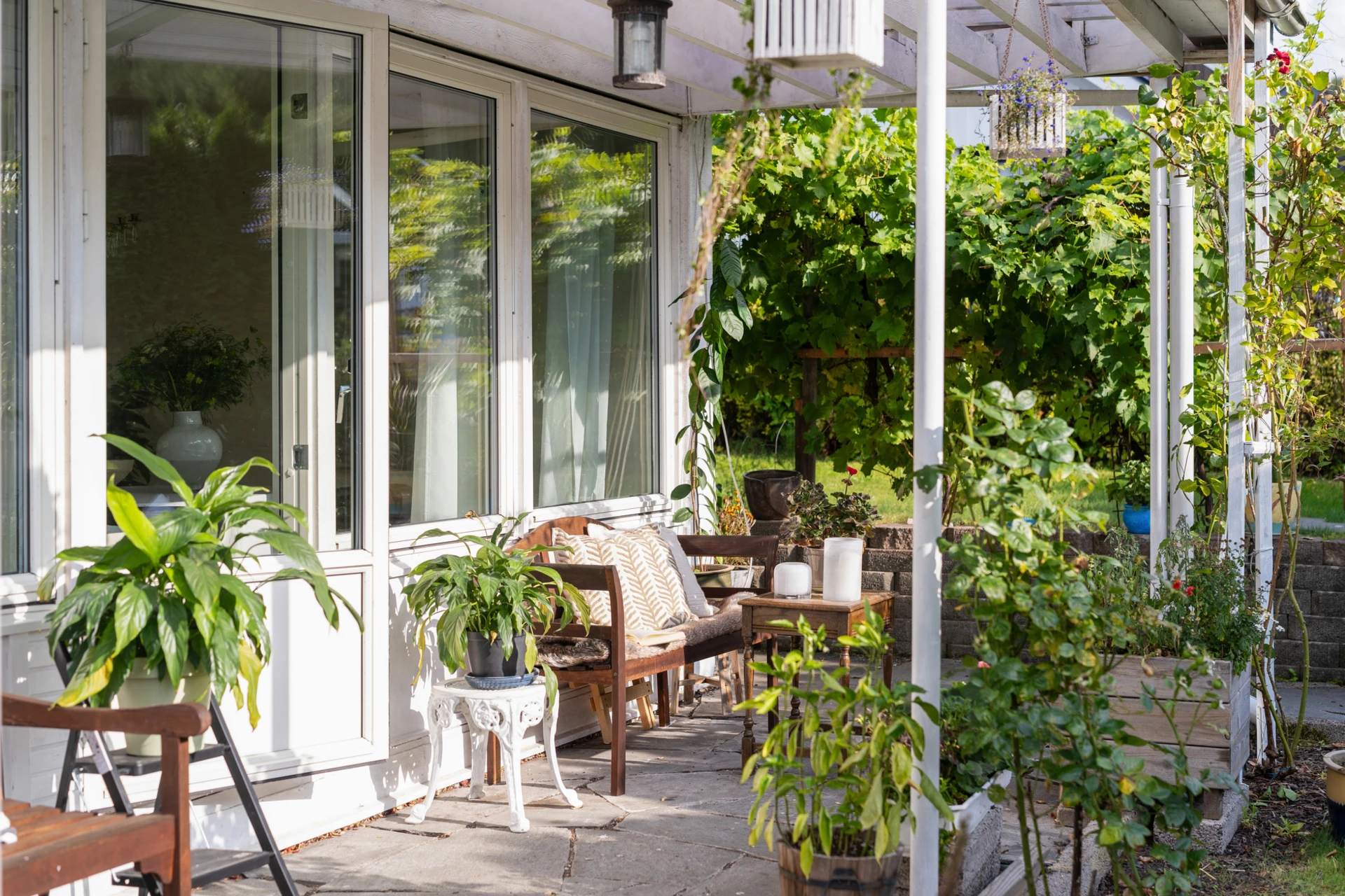 Klinkergolv och skjutbara glaspartier. Här ryms gott om sällskapsmöblemang och garaget ligger i direkt anslutning.