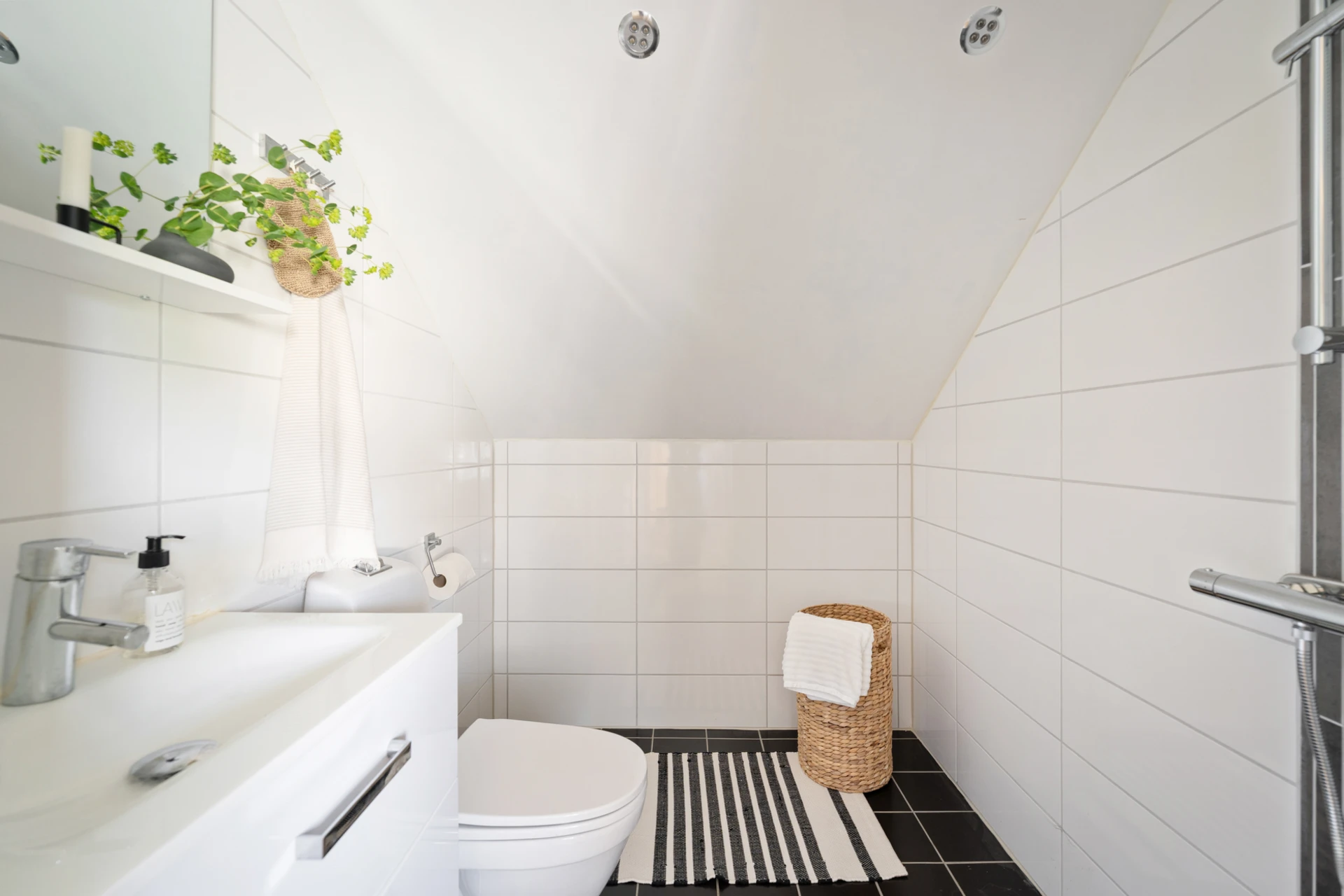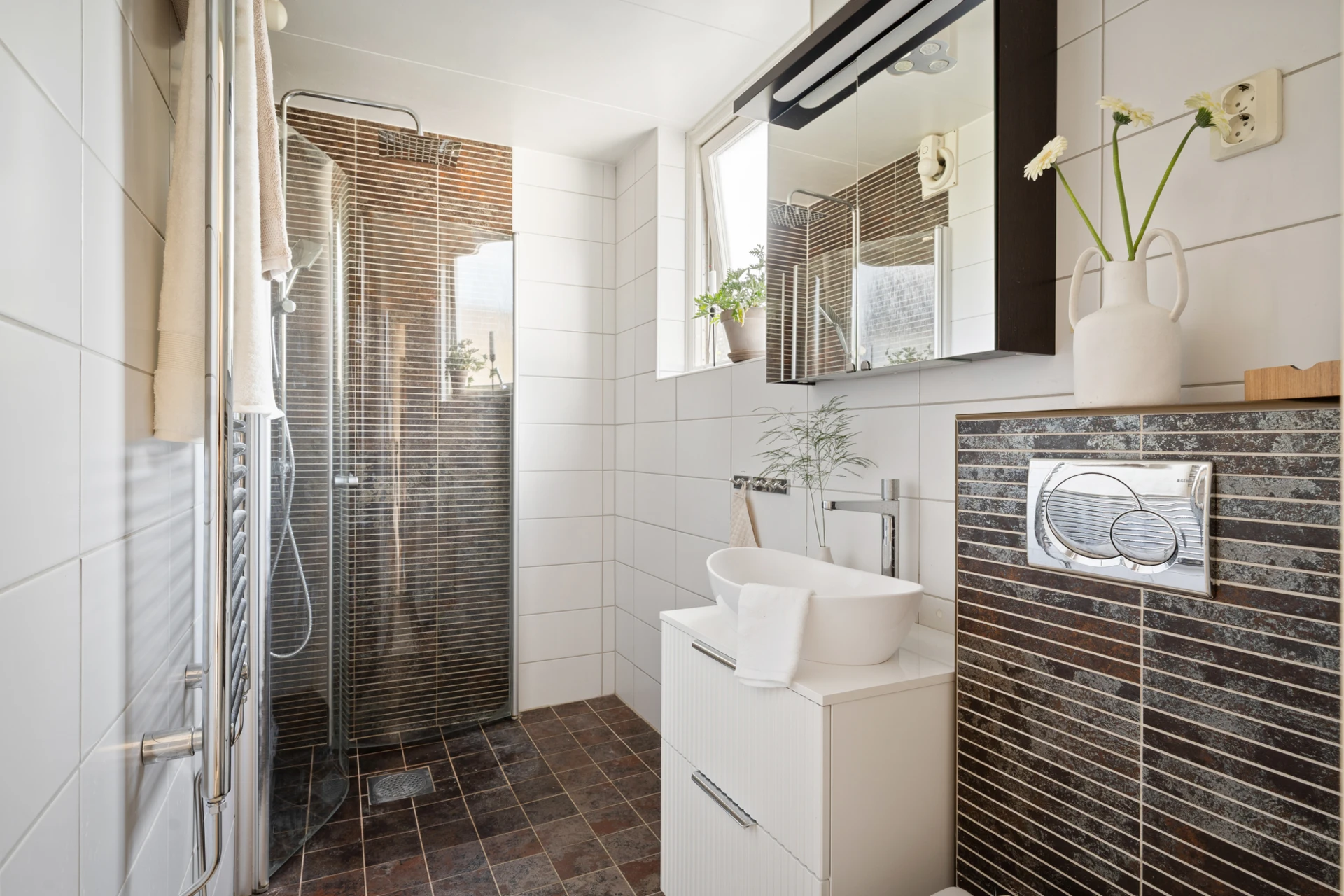 Klinkergolv med vattenburen golvvärme och helkaklade väggar. Badrumsinredningen består av WC-stol, handfat med kommod, spegelskåp, dusch med glasdörrar och handdukstork.