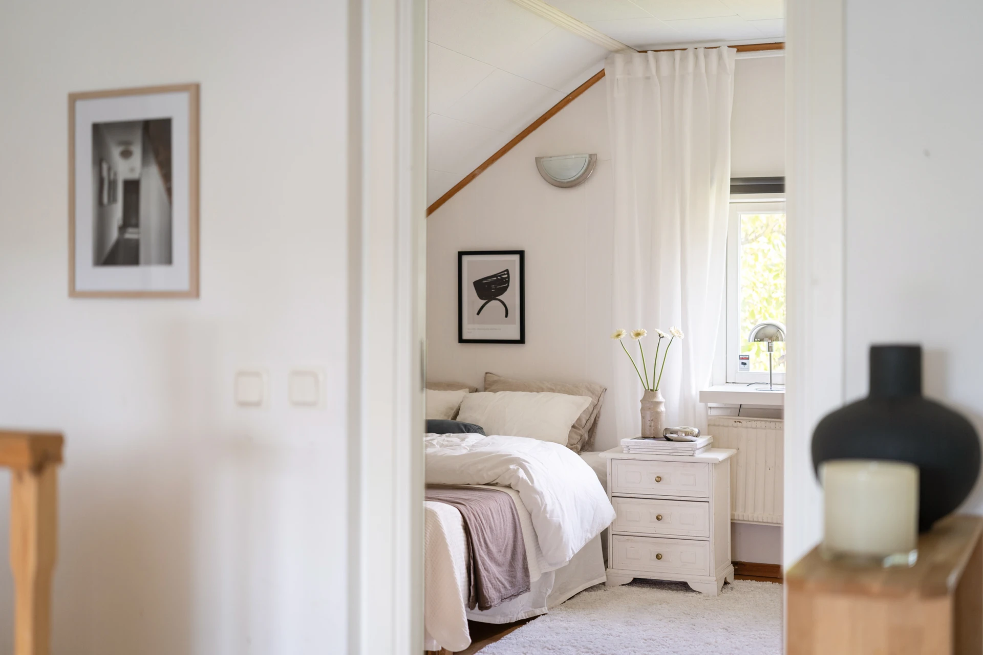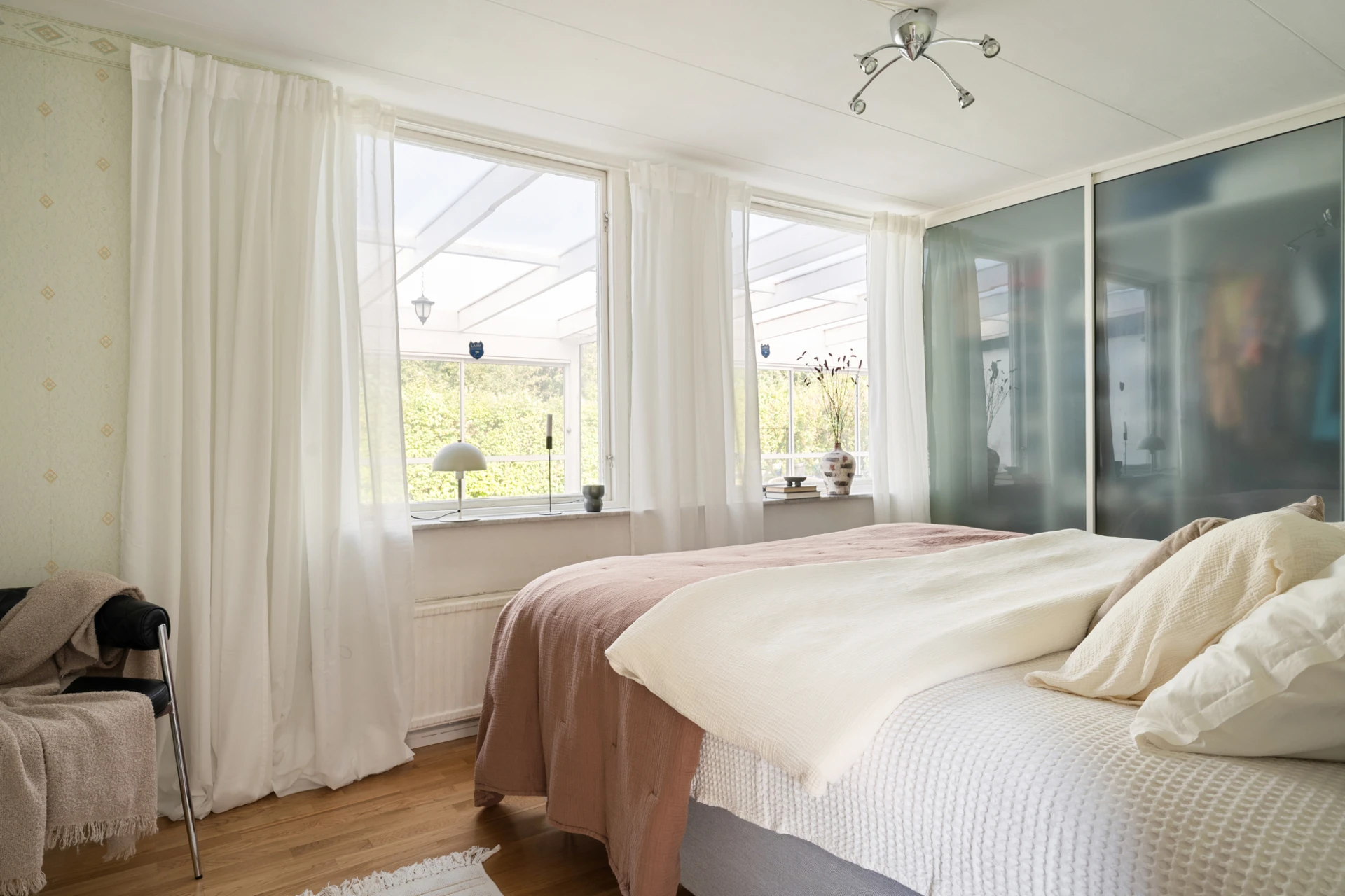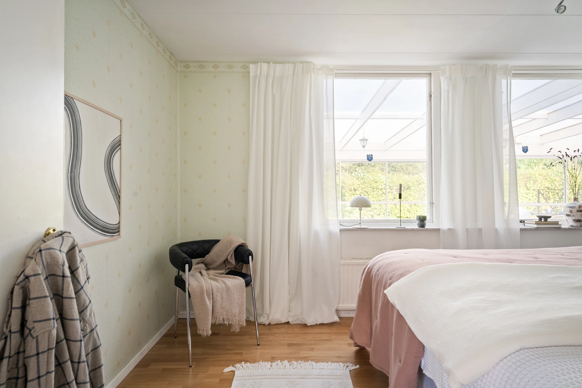 Parkettgolv och tapetserade väggar. Plats för dubbelsäng med tillhörande möblemang. Förvaringsutrymme i en stor skjutdörrsgarderob.