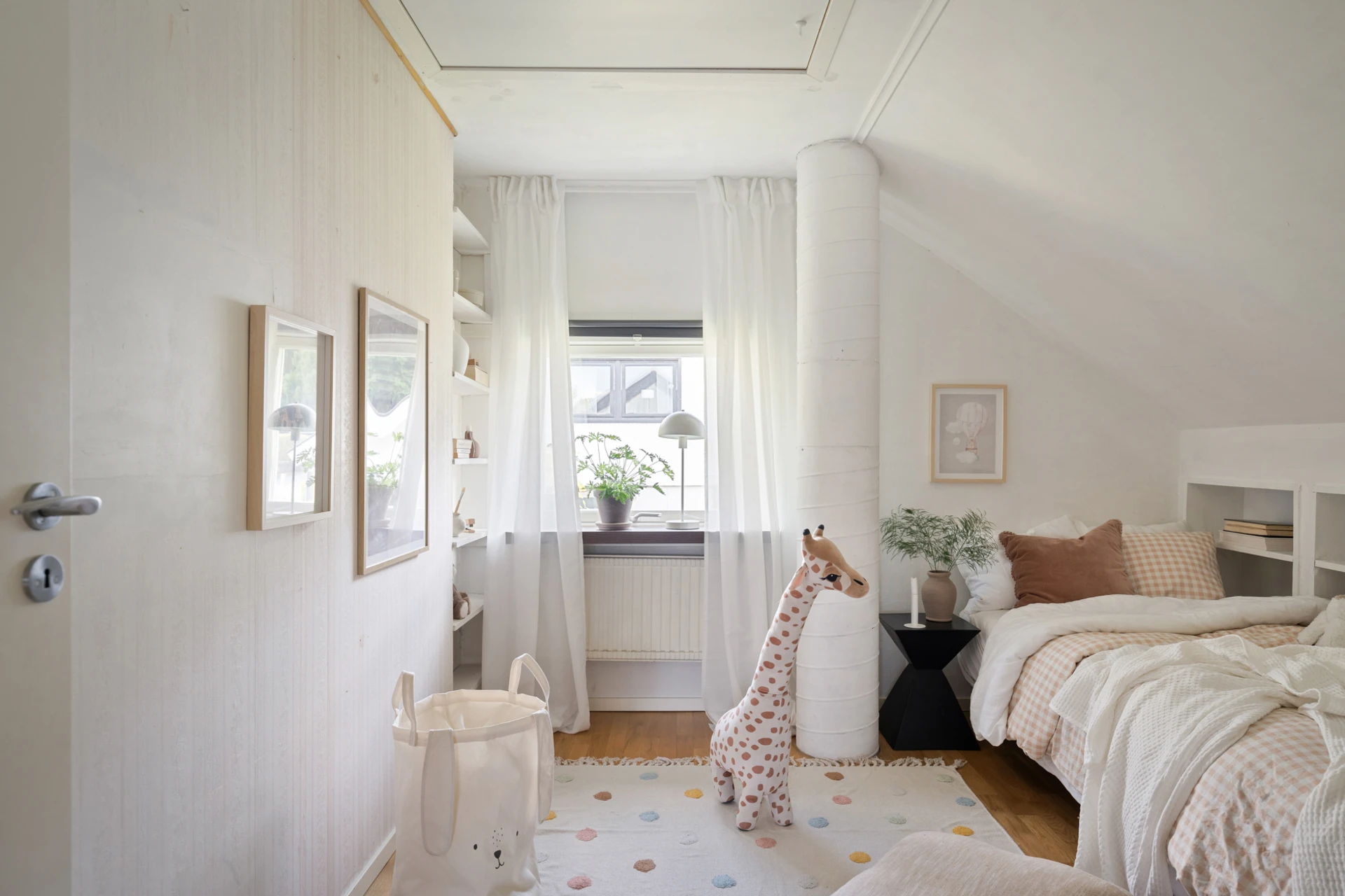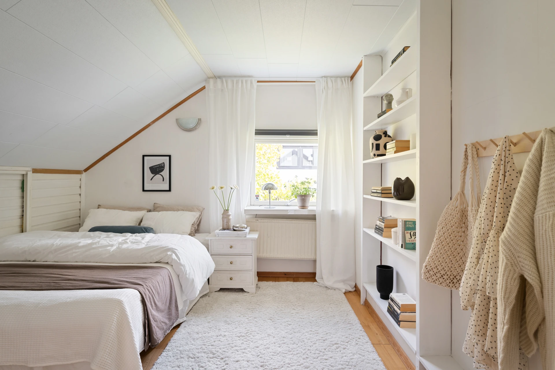 Parkettgolv och ljusa väggar. Plats för säng med tillhörande sidobord och önskvärt möblemang.