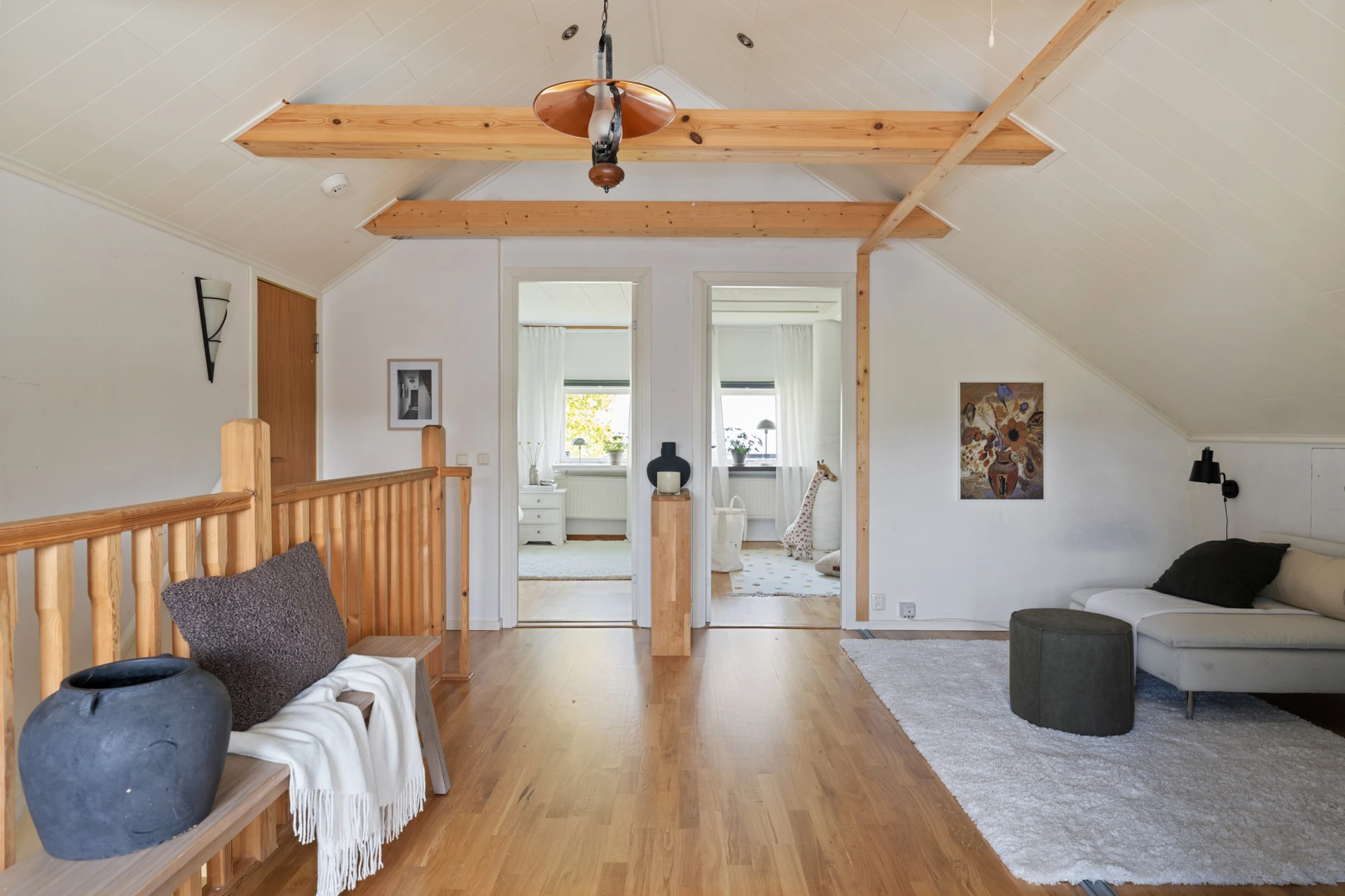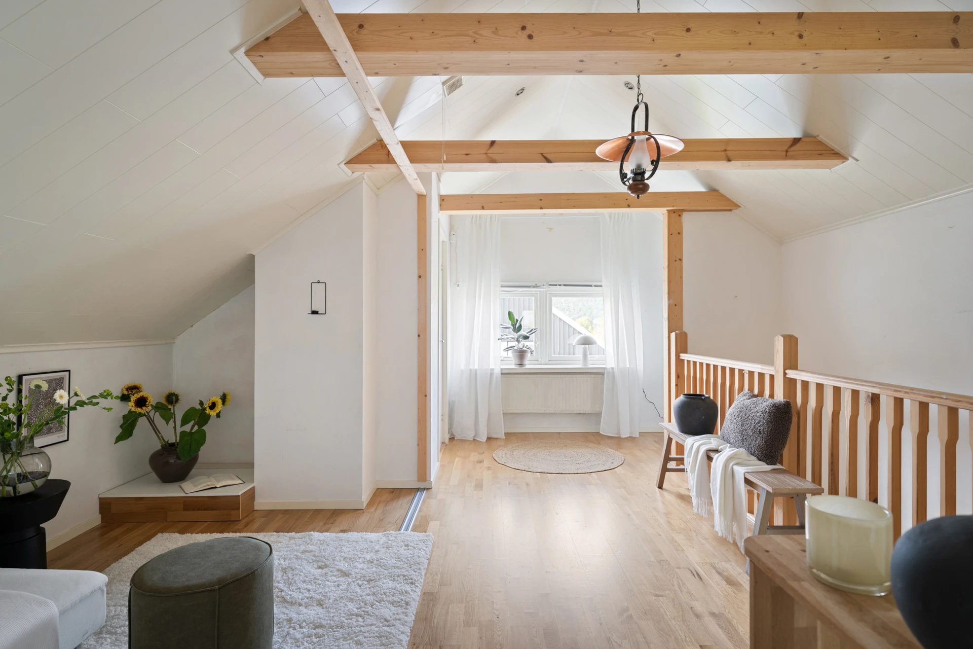 Parkettgolv och ljusa väggar. Plats för önskvärt sällskapsmöblemang. Här finns även möjlighet att bygga ytterligare ett sovrum.