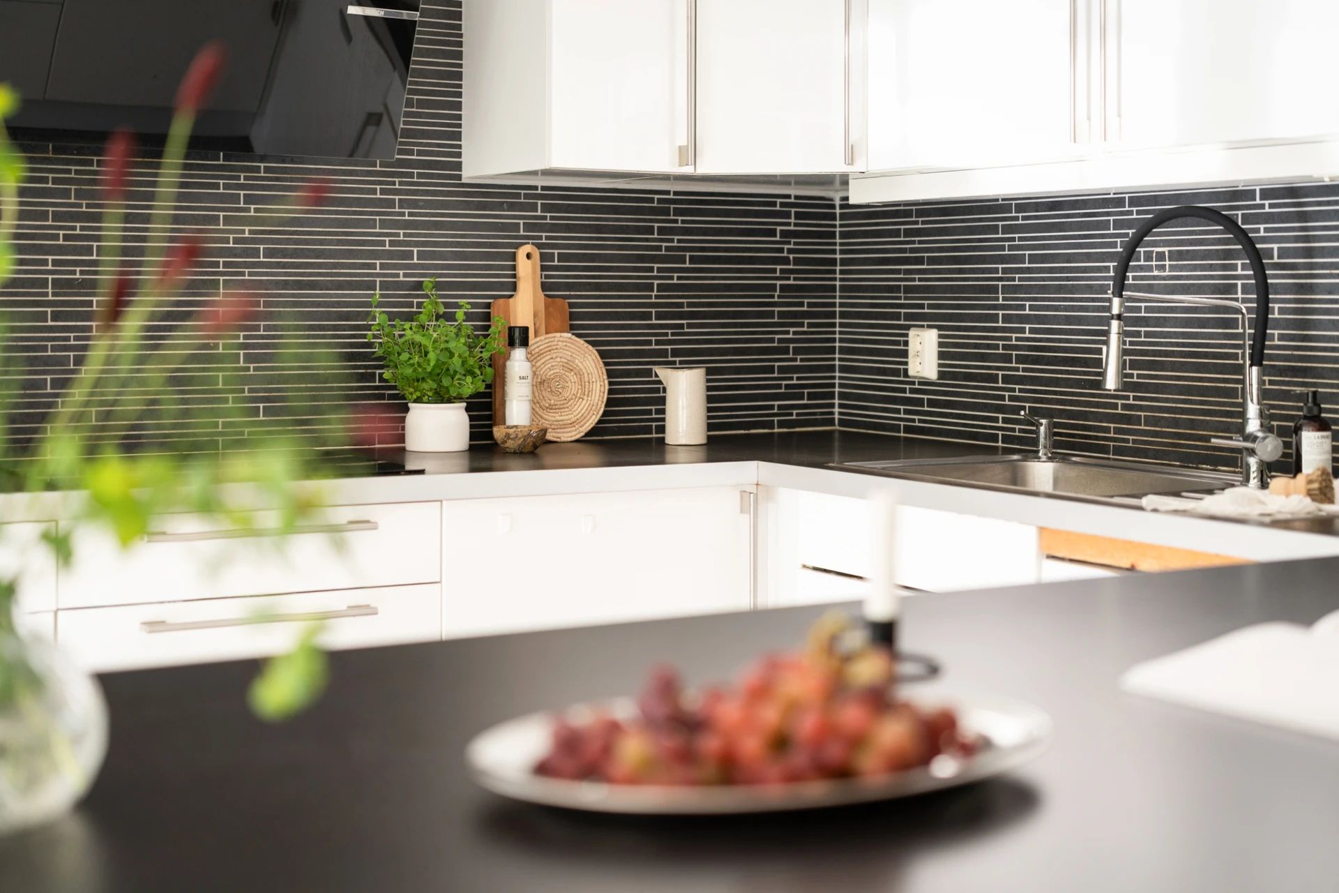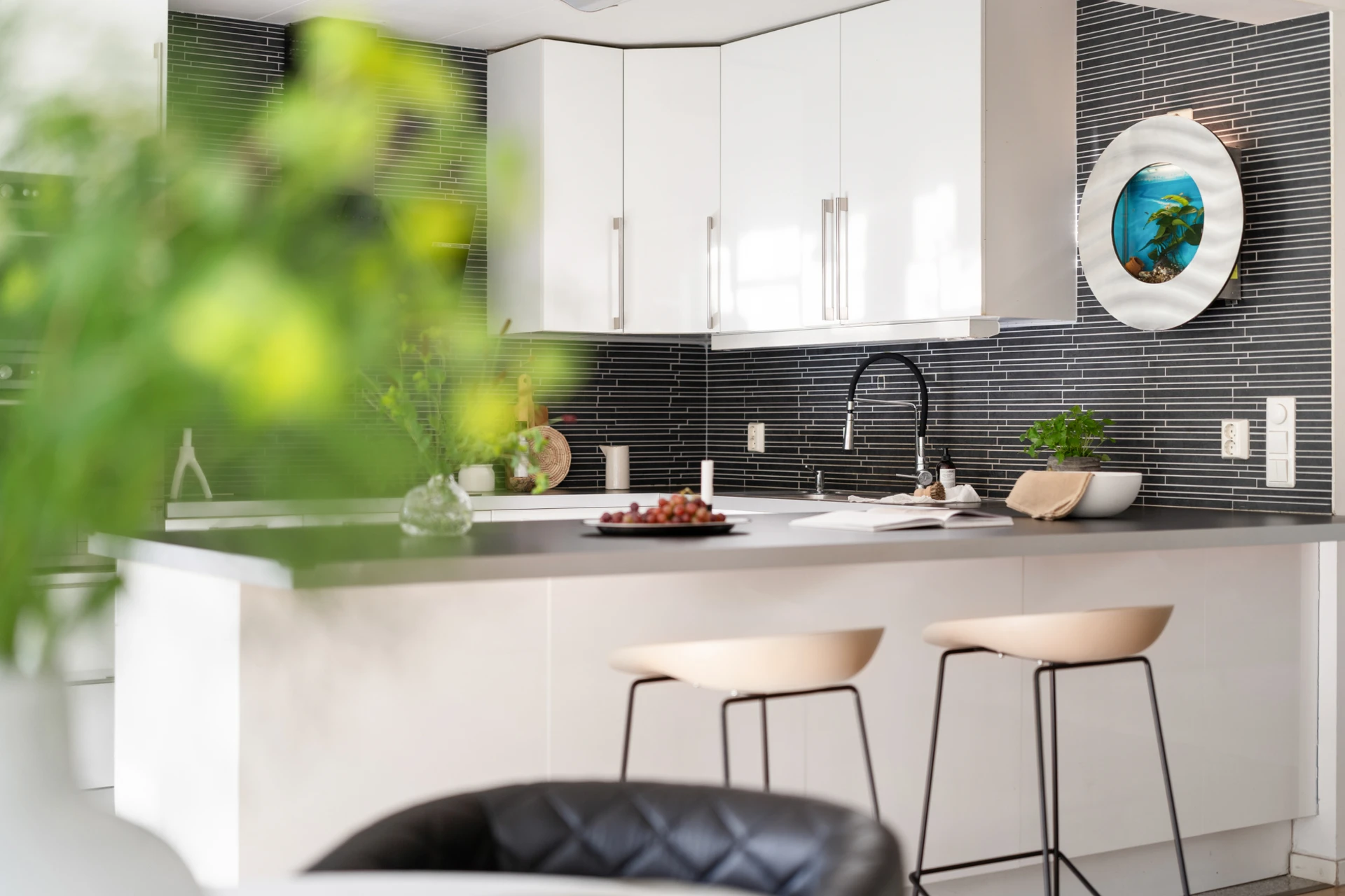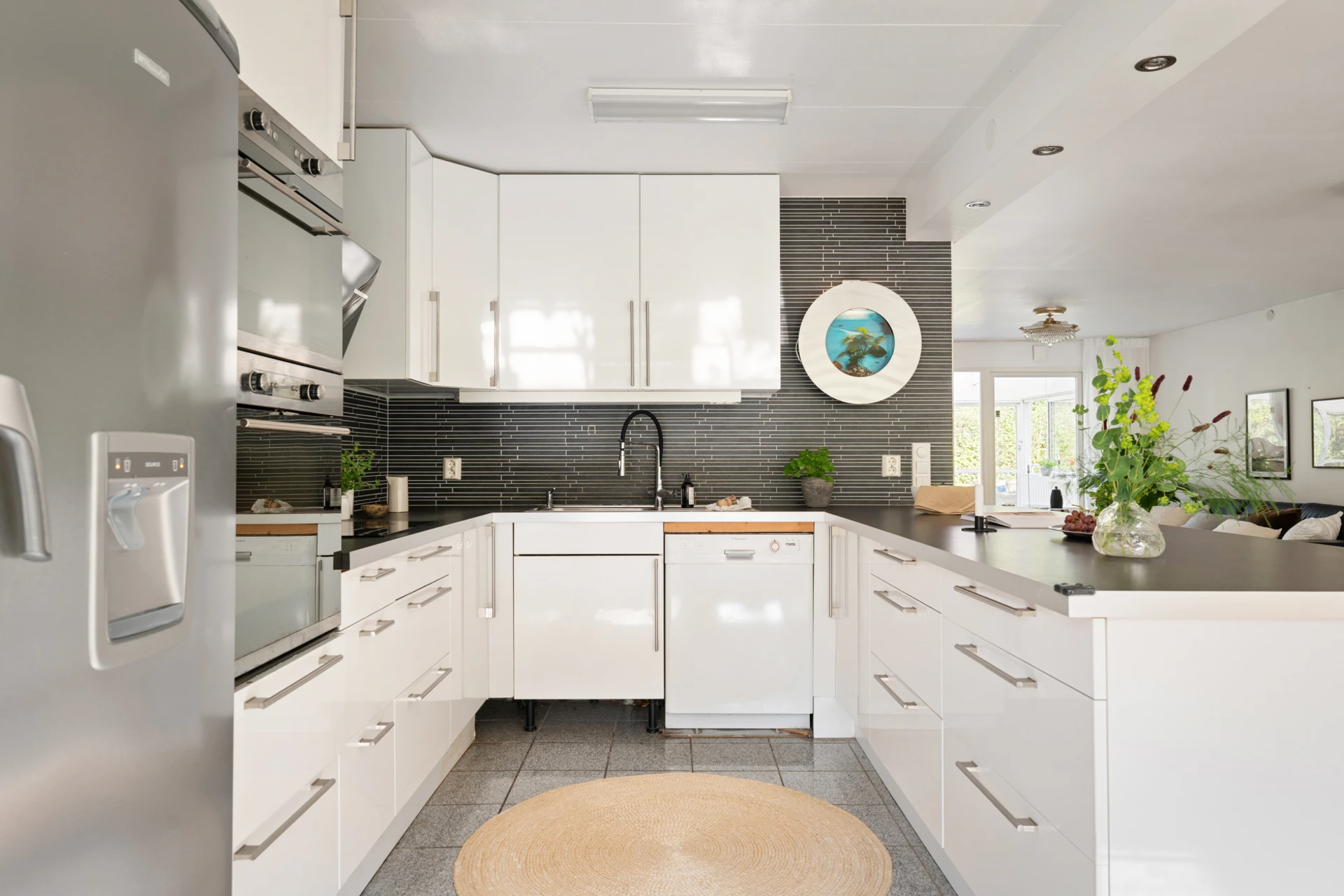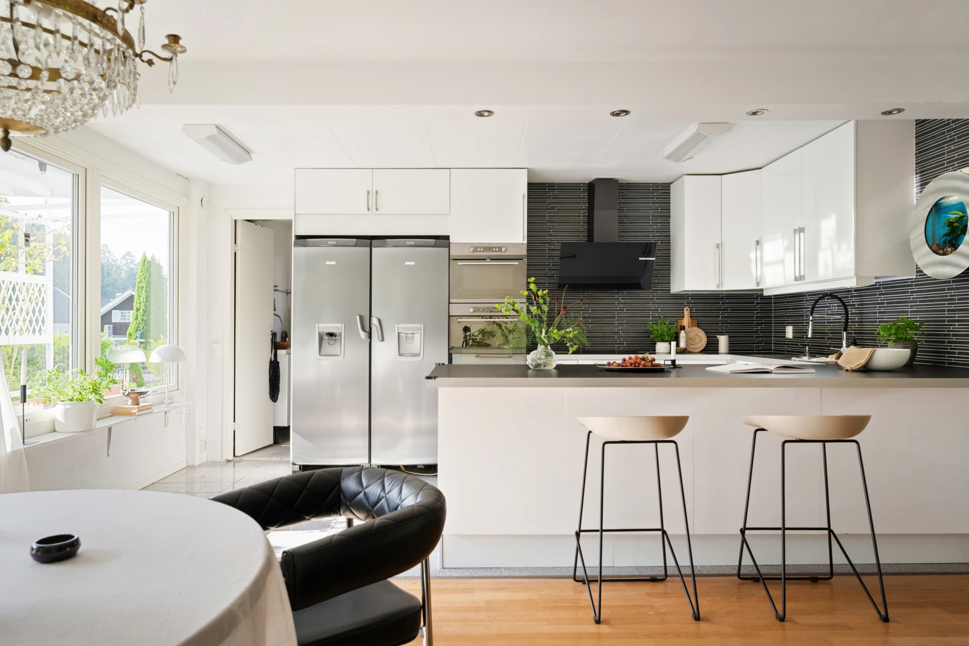 Klinkergolv med vattenburen golvvärme och ljusa väggar. Köksinredning i vitt med rostfria beslag och ovan arbetsbänken sitter svart kakel som stänkskydd. Den maskinella utrustningen består av kyl och frys, inbyggd ugn och mikro, spishäll, köksfläkt och diskmaskin. Kökshalvö med plats för barstolar och öppen yta mot matsal. Härifrån nås även uteplatsen på husets framsida.