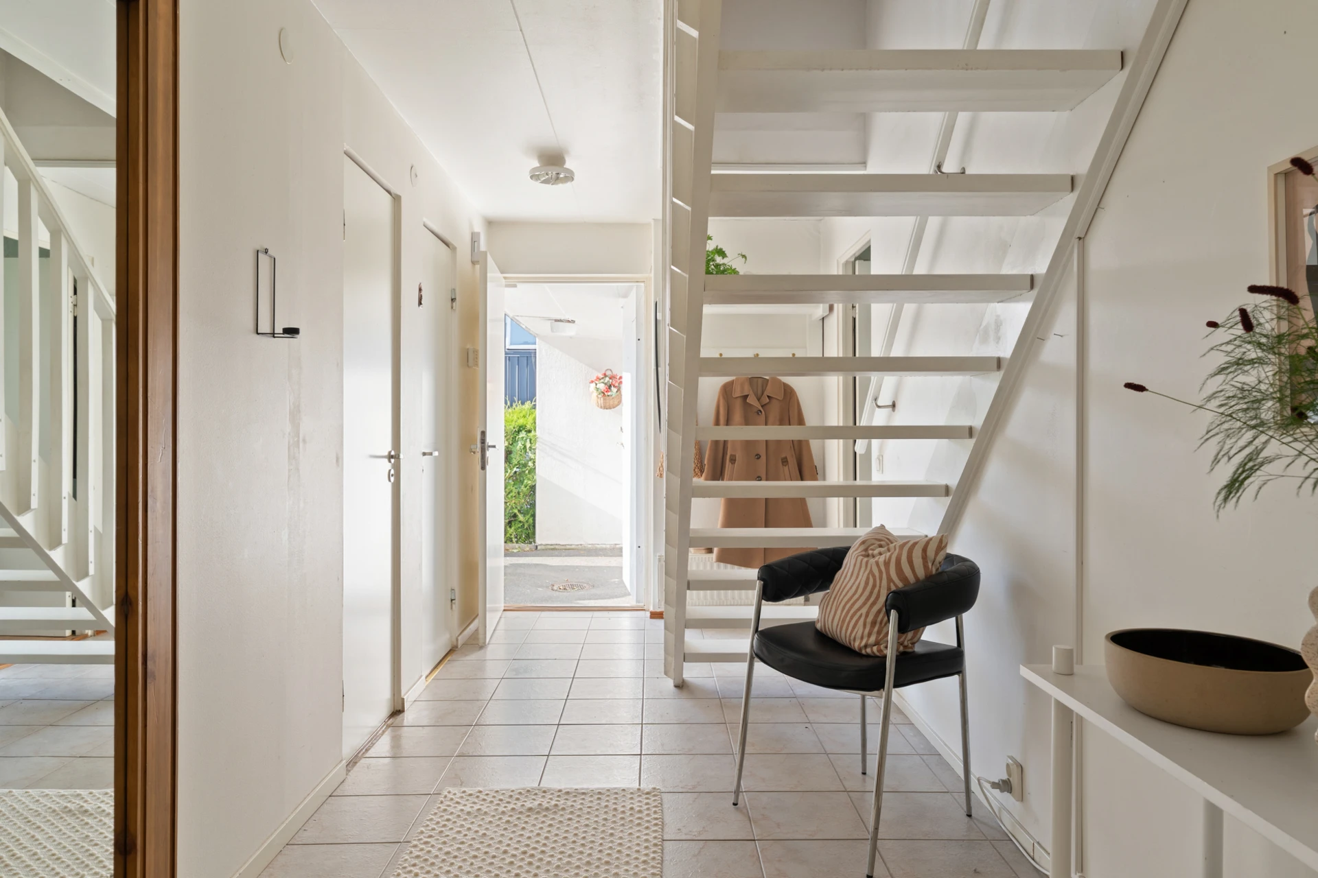 Klinkergolv och ljusa väggar. Luftig och välkomnande hall med plats för kappavhängning intill entrén.
