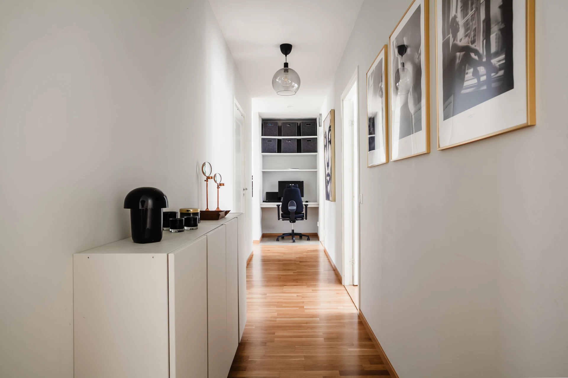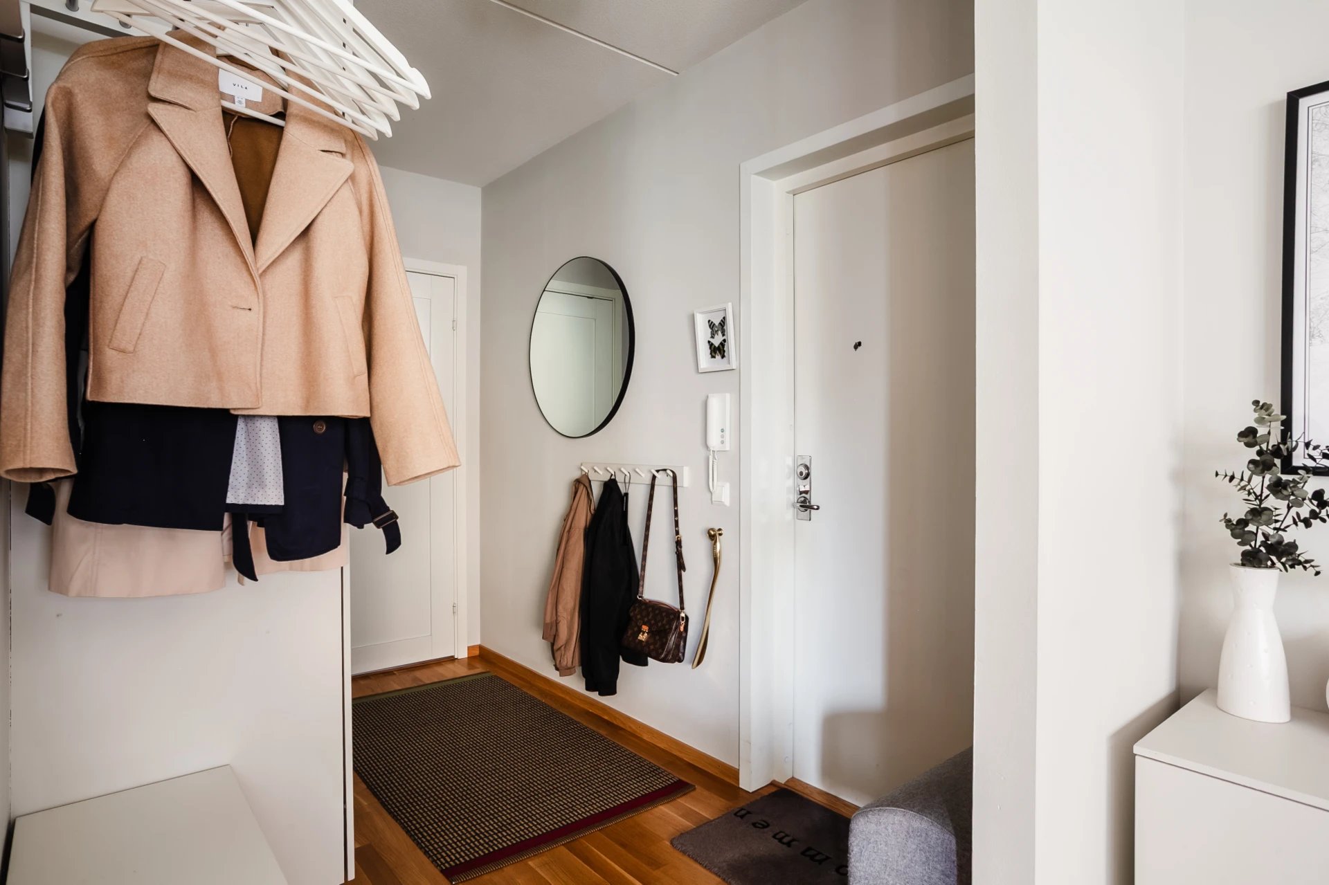 Parkettgolv och ljust målade väggar. Här finns plats för avhängning av ytterkläder och skor samt förvaring i en platsbyggd garderob. Längre fram i hallen finns ytterligare förvaring i form av en walk-in-closet och den avslutas med en platsbyggd arbetsplats med förvaring.