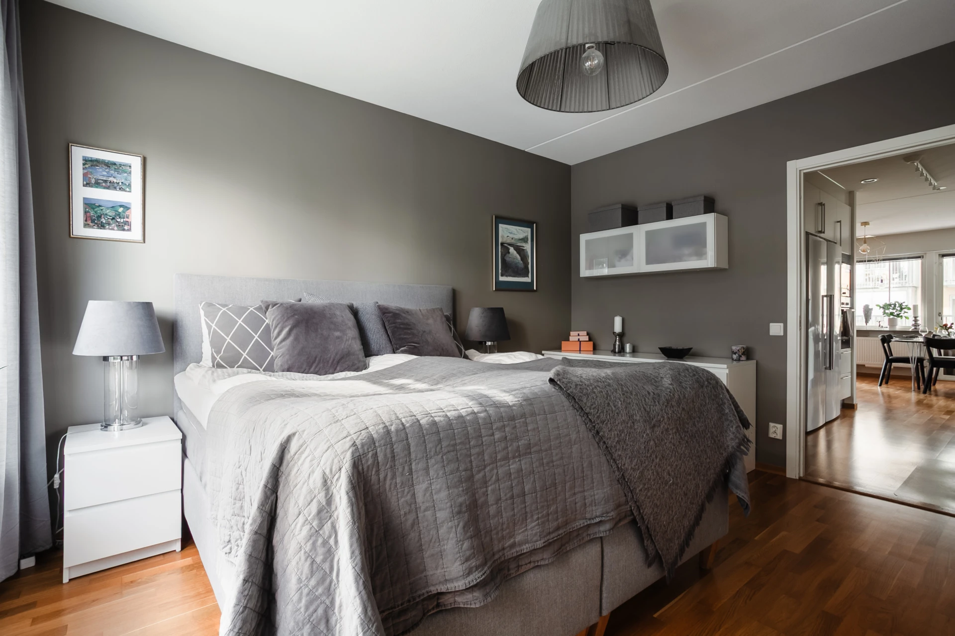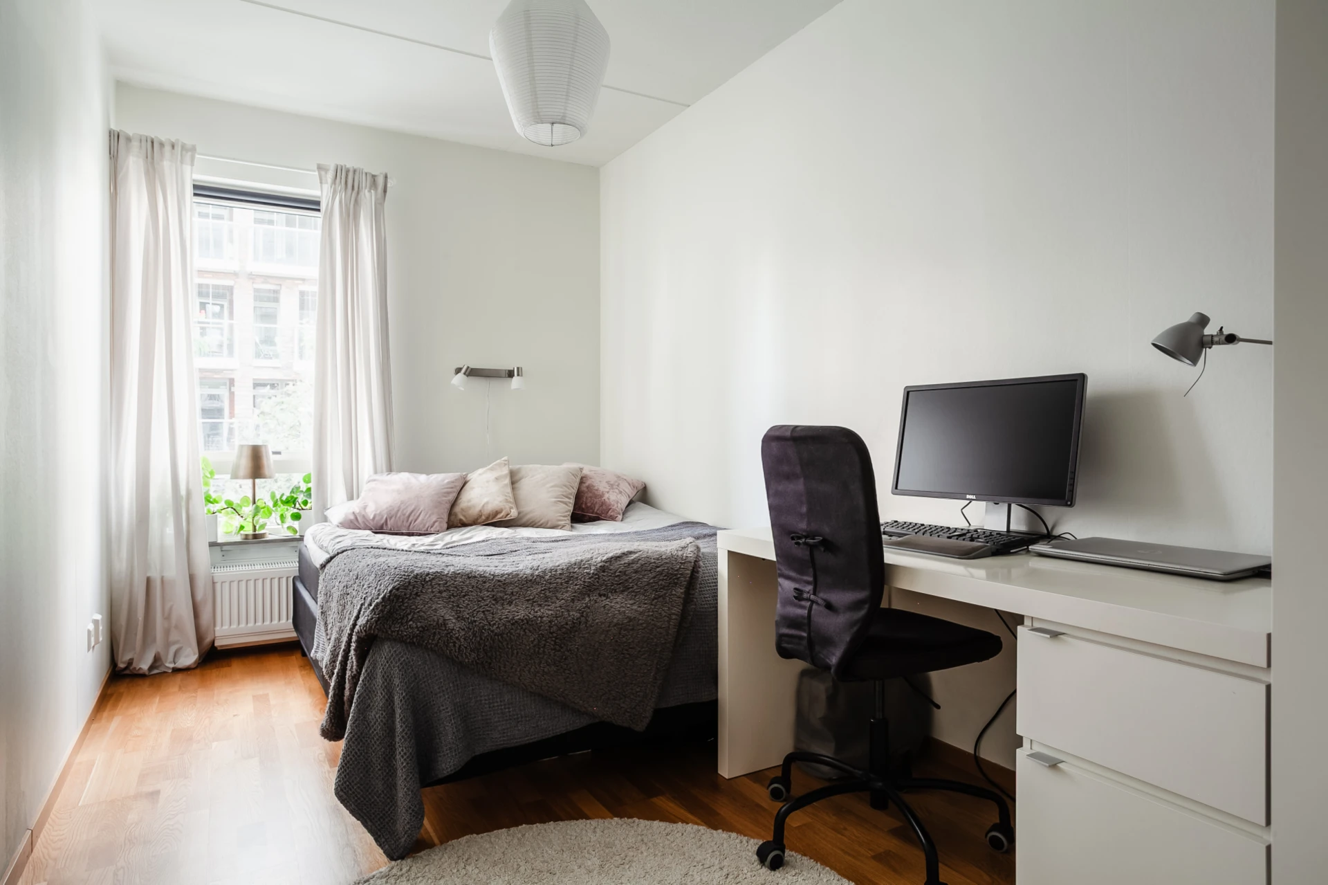 Parkettgolv och vitmålade väggar. Här finns plats för dubbelsäng med tillhörande sängbord samt skrivbord.