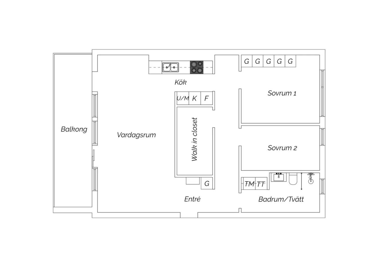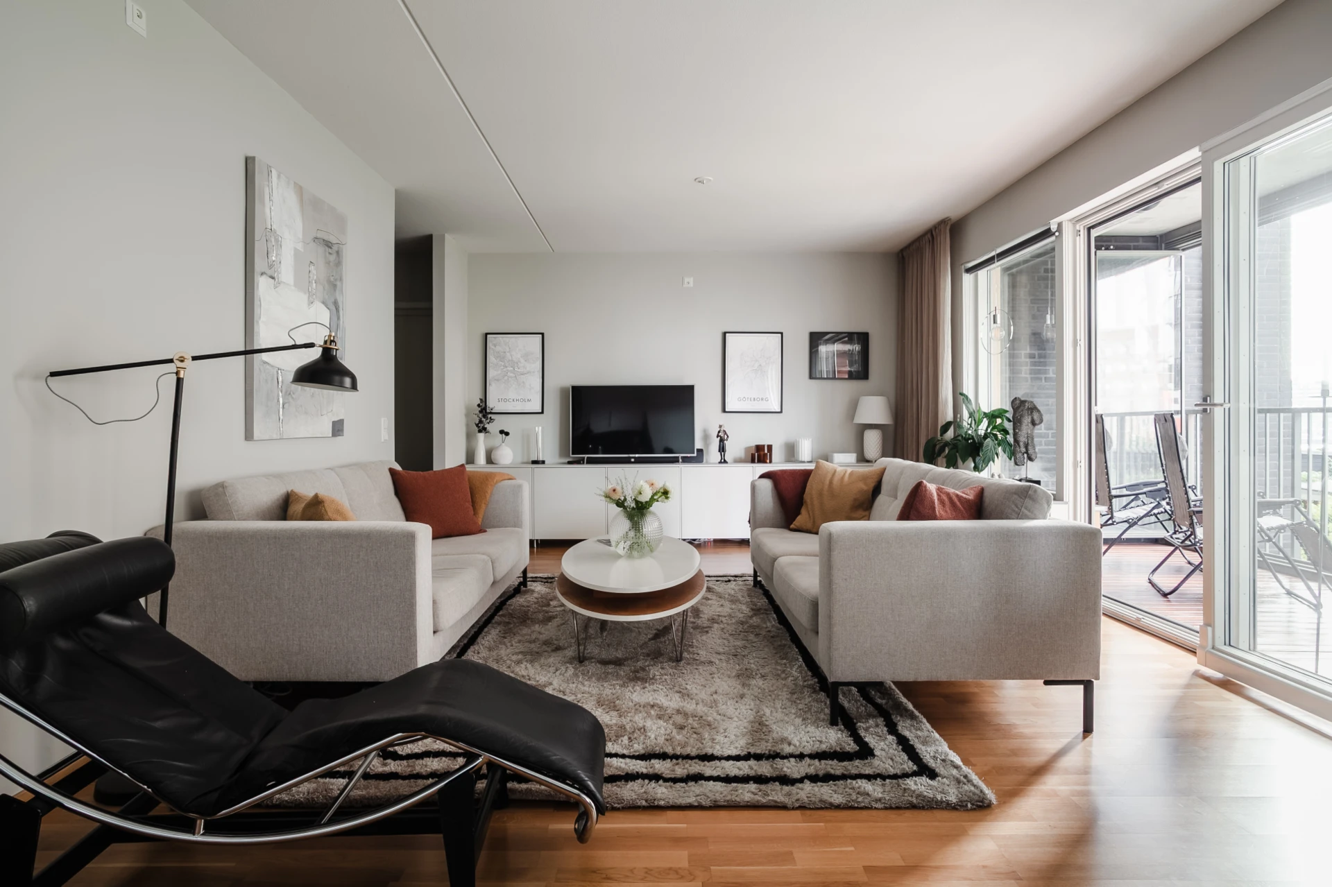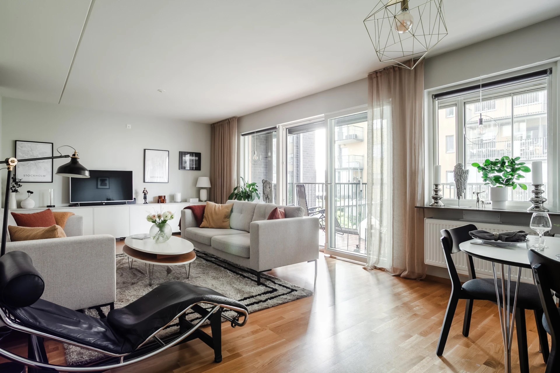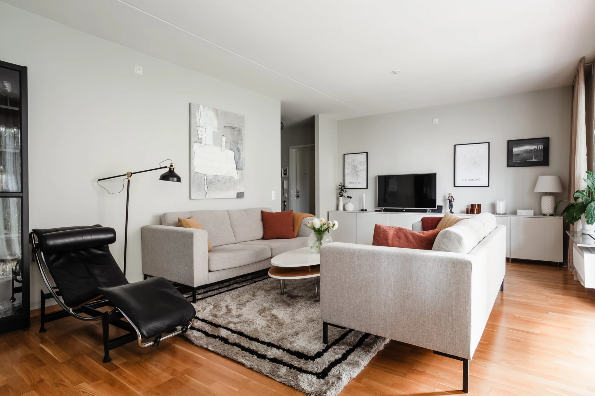 Parkettgolv och ljust målade väggar. Här finns plats för soffgrupp med tillhörande möblemang. Även härifrån nås den inglasade balkongen via ett skjutdörrsparti.