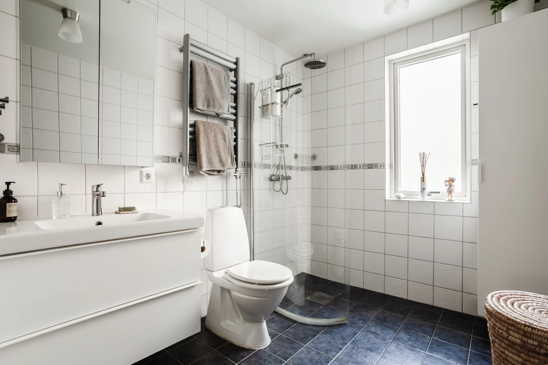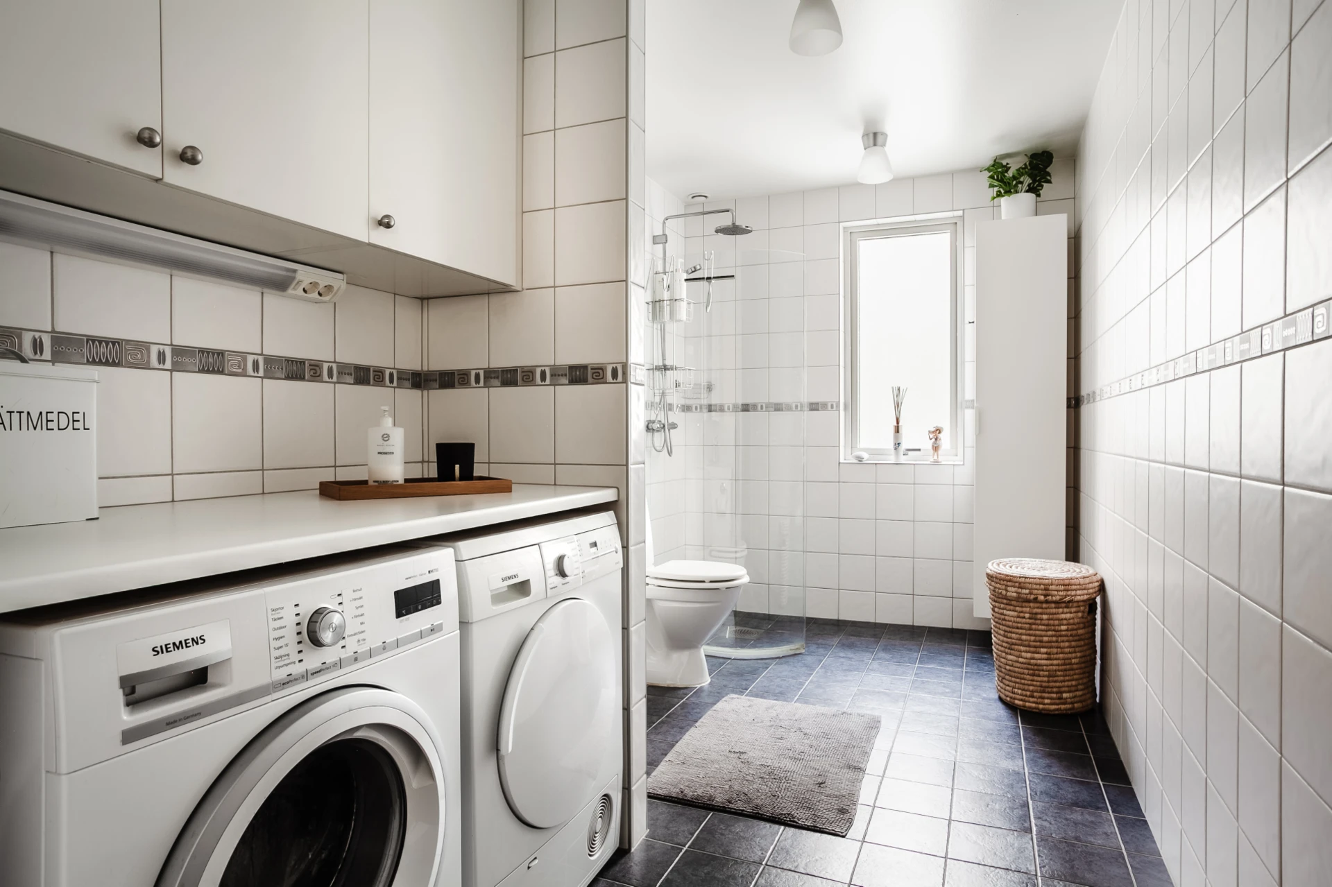 Klinkergolv i blågrått med golvvärme och vita helkaklade väggar med en dekorativ grå bård i mitten. Badrummet är utrustat med WC, handfat med kommod, spegelskåp med dimbar belysning, värmande handdukstork, tvättmaskin, torktumlare, väggskåp samt dusch med vikdörr i glas. Ett generöst badrum som underlättar vardagens bestyr, och som dessutom förhöjs av ett fönster som släpper in härligt ljus och ger möjlighet till vädring.