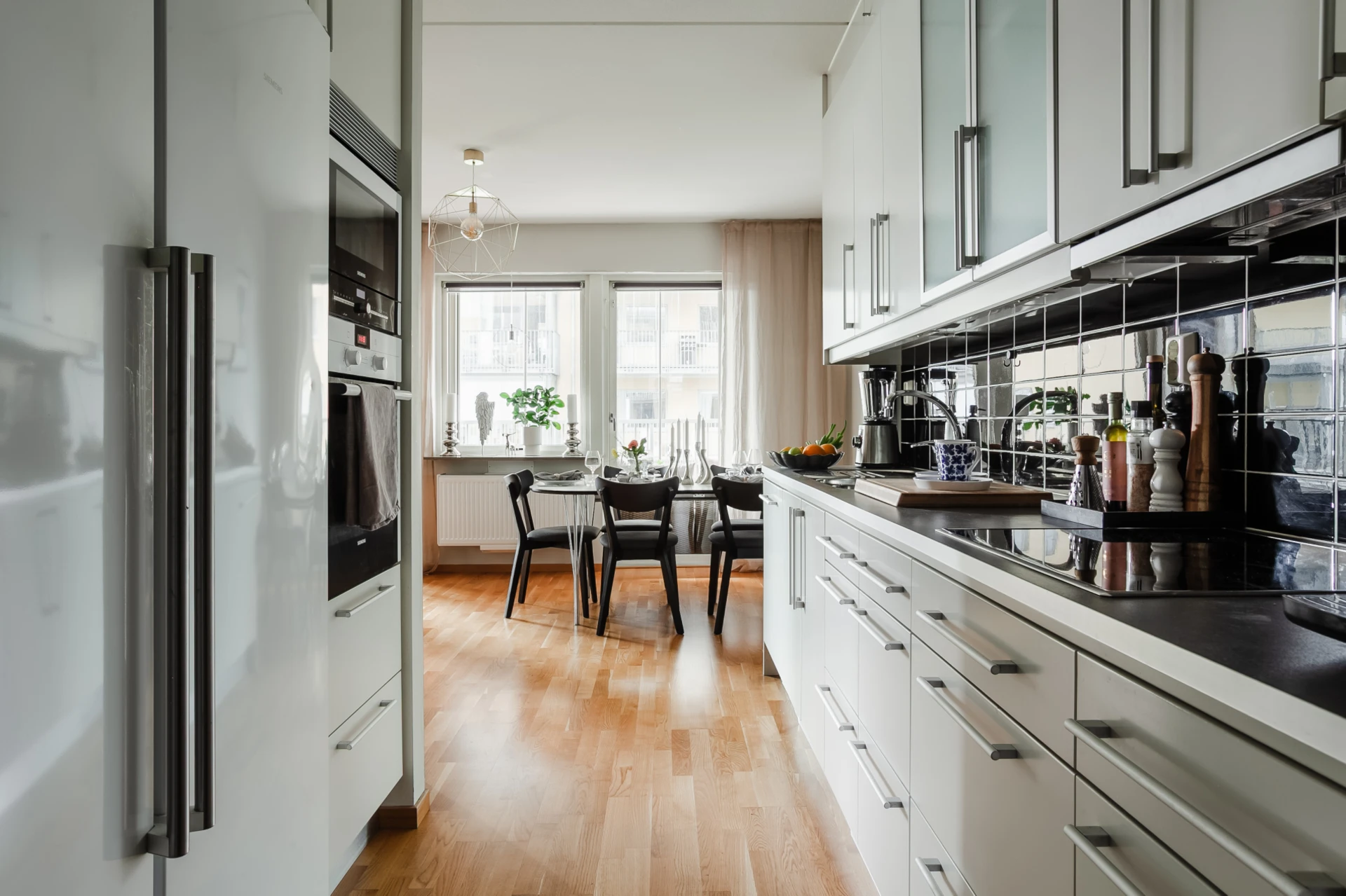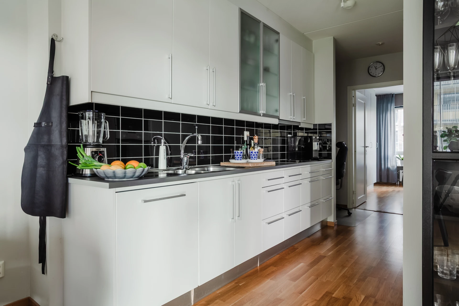 Parkettgolv och ljust målade väggar. Köksinredning i vitt och ovanför köksbänken i grå laminat sitter svart kakel samt spotlights. Köket är utrustat med keramisk häll, inbyggd ugn och mikro, spisfläkt, kyl och frys i fullhöjd samt diskmaskin. Köket nås från två håll som gör att vardagsrum och kök får en naturlig kontakt. Här finns goda arbetsytor och bra med förvaring i över och underskåp samt matplats för ca 10 personer. Från matplatsen nås utgång till den inglasade balkongen.