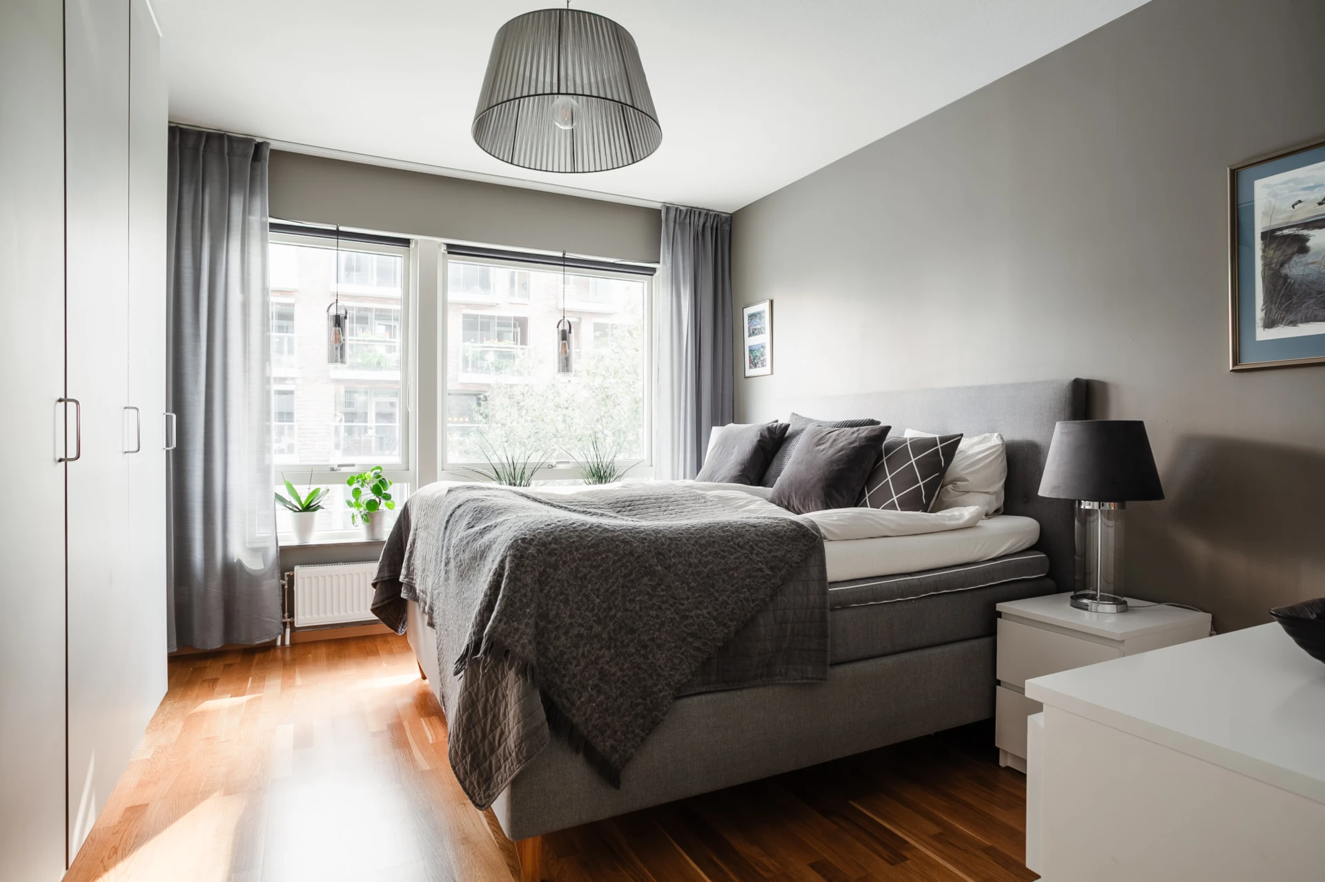 Parkettgolv och beigegråa väggar med stora fönsterpartier där ljuset flödar in. Här finns plats för dubbelsäng med tillhörande sängbord. Förvaring finns i en platsbyggd garderobsvägg.