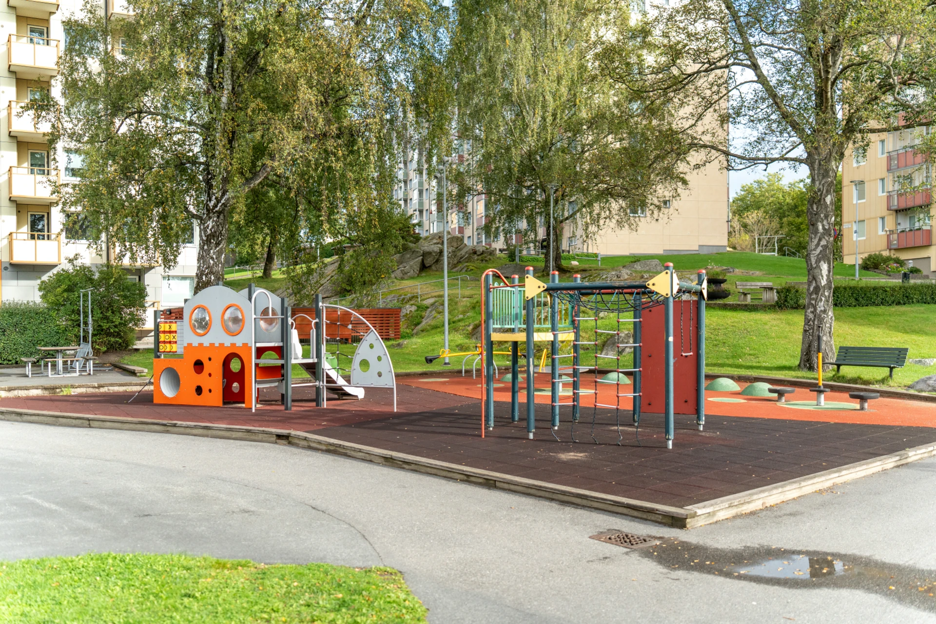 Bilfri grönskande innergård med utemöbler och lekplats.