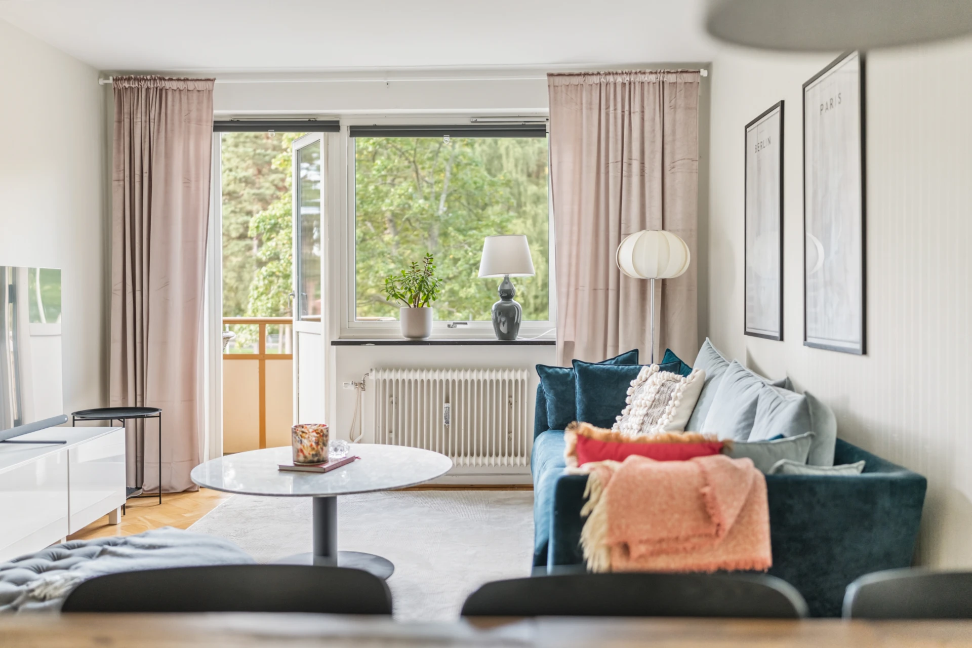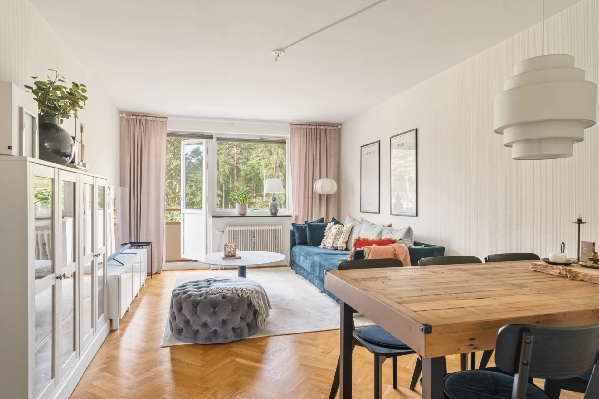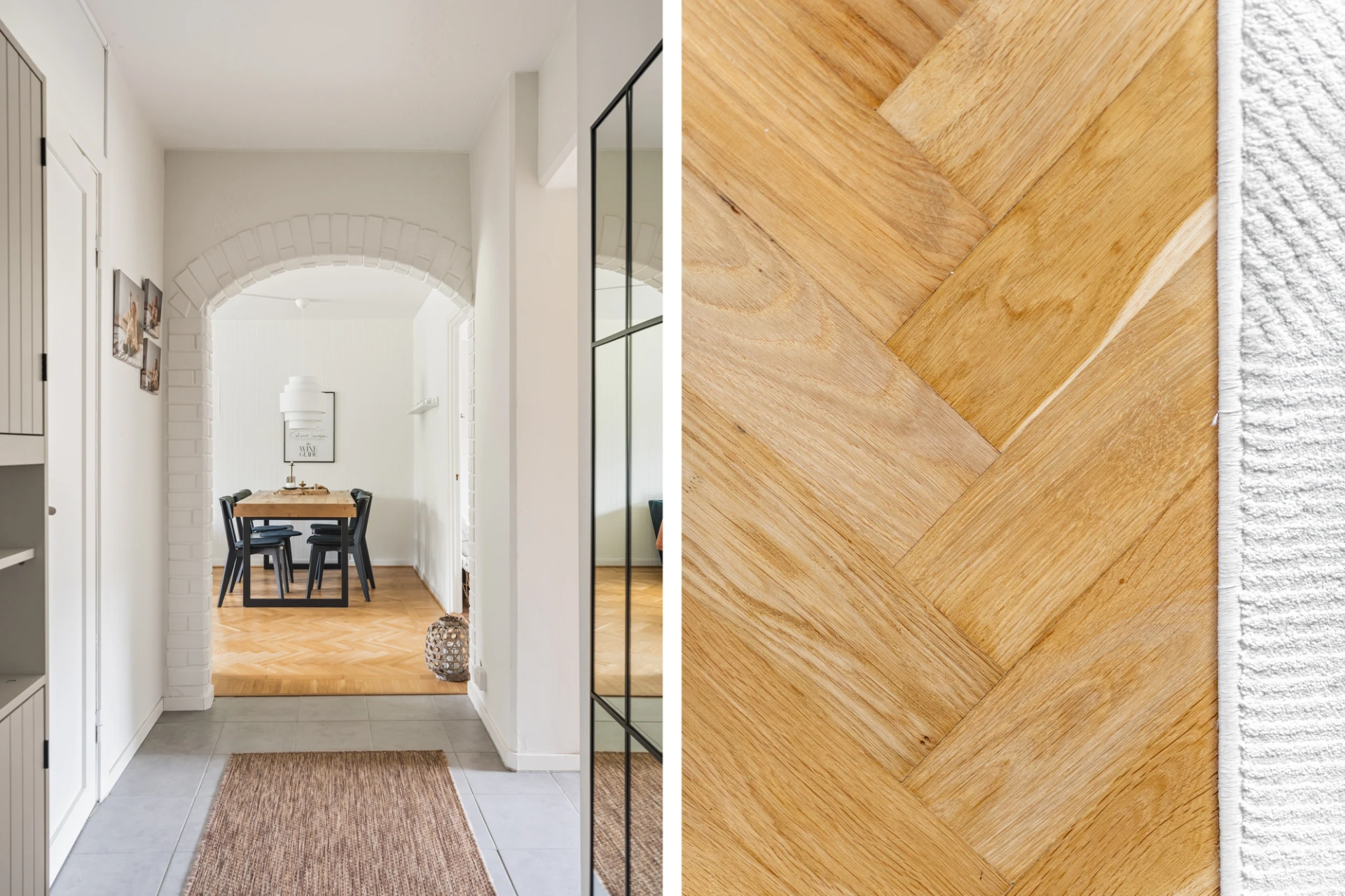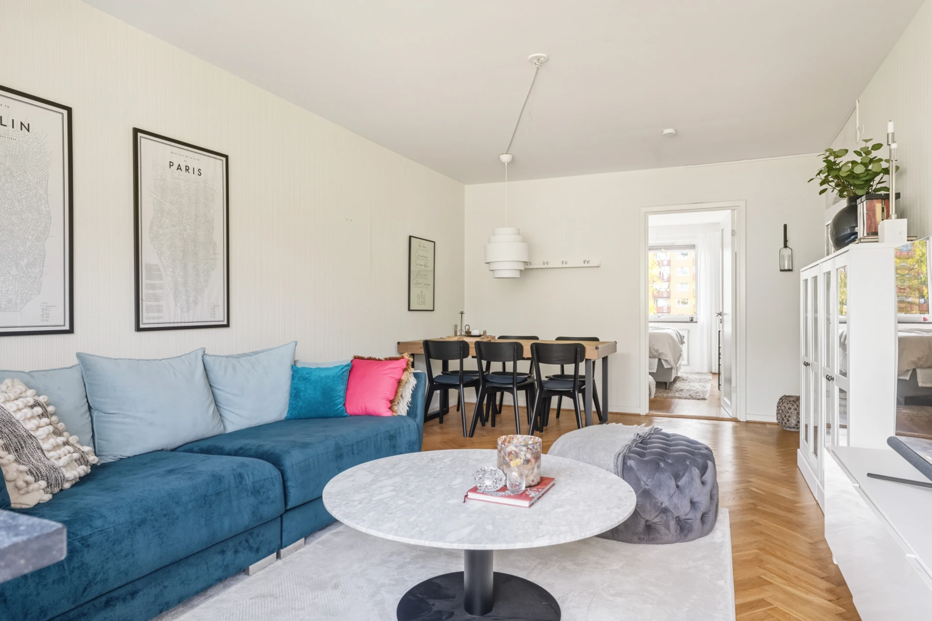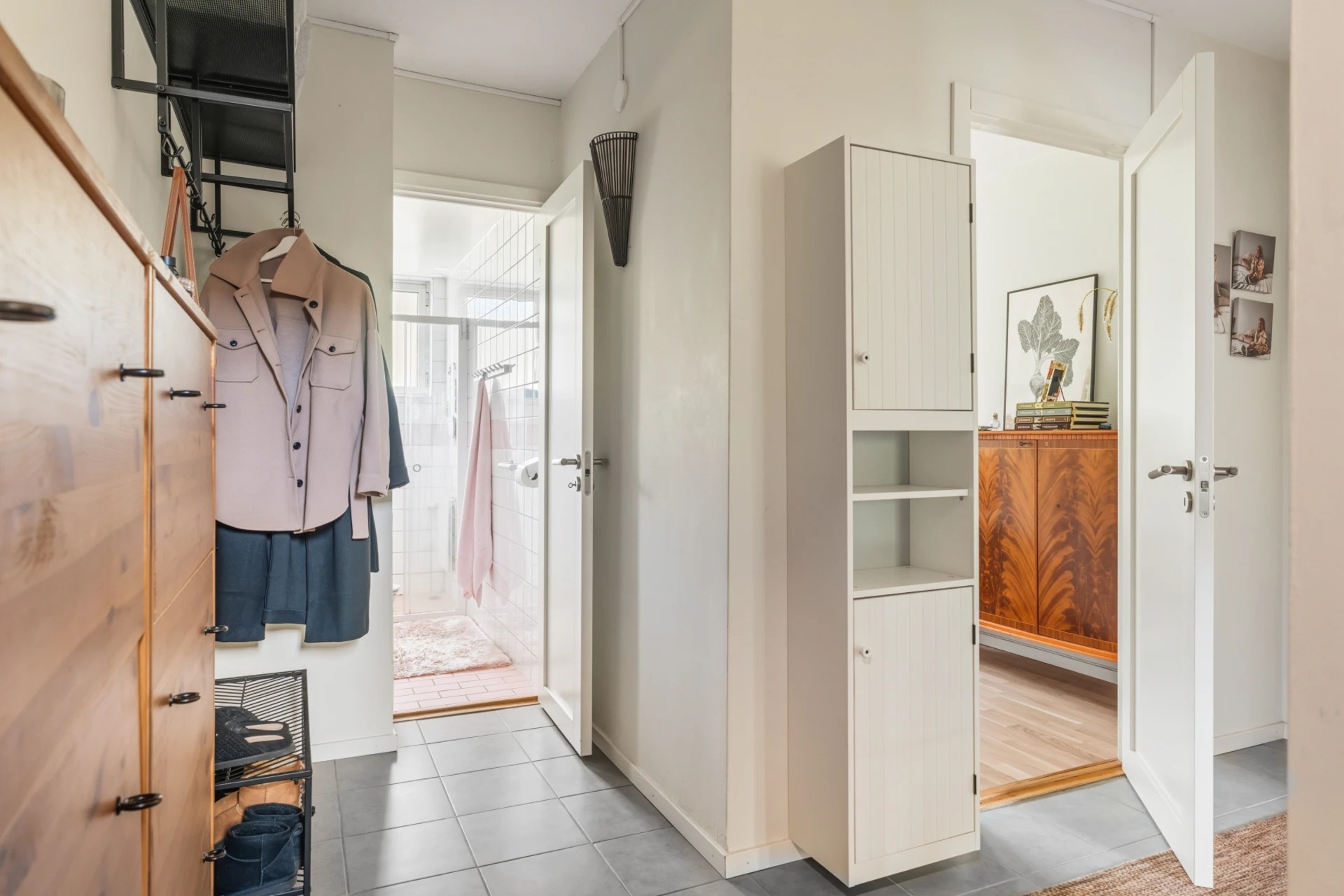Välkommen hem till en ljus och trivsam bostad där detaljer som fiskbensparkett och en härlig balkong skapar den rätta känslan. I hallen finns klinkergolv och gott om plats för avhängning. Köket har ljus inredning, bra arbetsytor och gott om förvaring – en naturlig plats för matlagning och vardagsliv. Det rymliga vardagsrummet bjuder på vackert golv, generöst ljusinsläpp och plats för både matsalsbord och soffgrupp. Härifrån nås bostadens balkong. Det större sovrummet rymmer dubbelsäng och har tre garderober, medan det mindre fungerar perfekt som barnrum, gästrum eller arbetsrum. Badrummet är helkaklat och utrustat med dusch, kommod, spegelskåp och handdukstork.