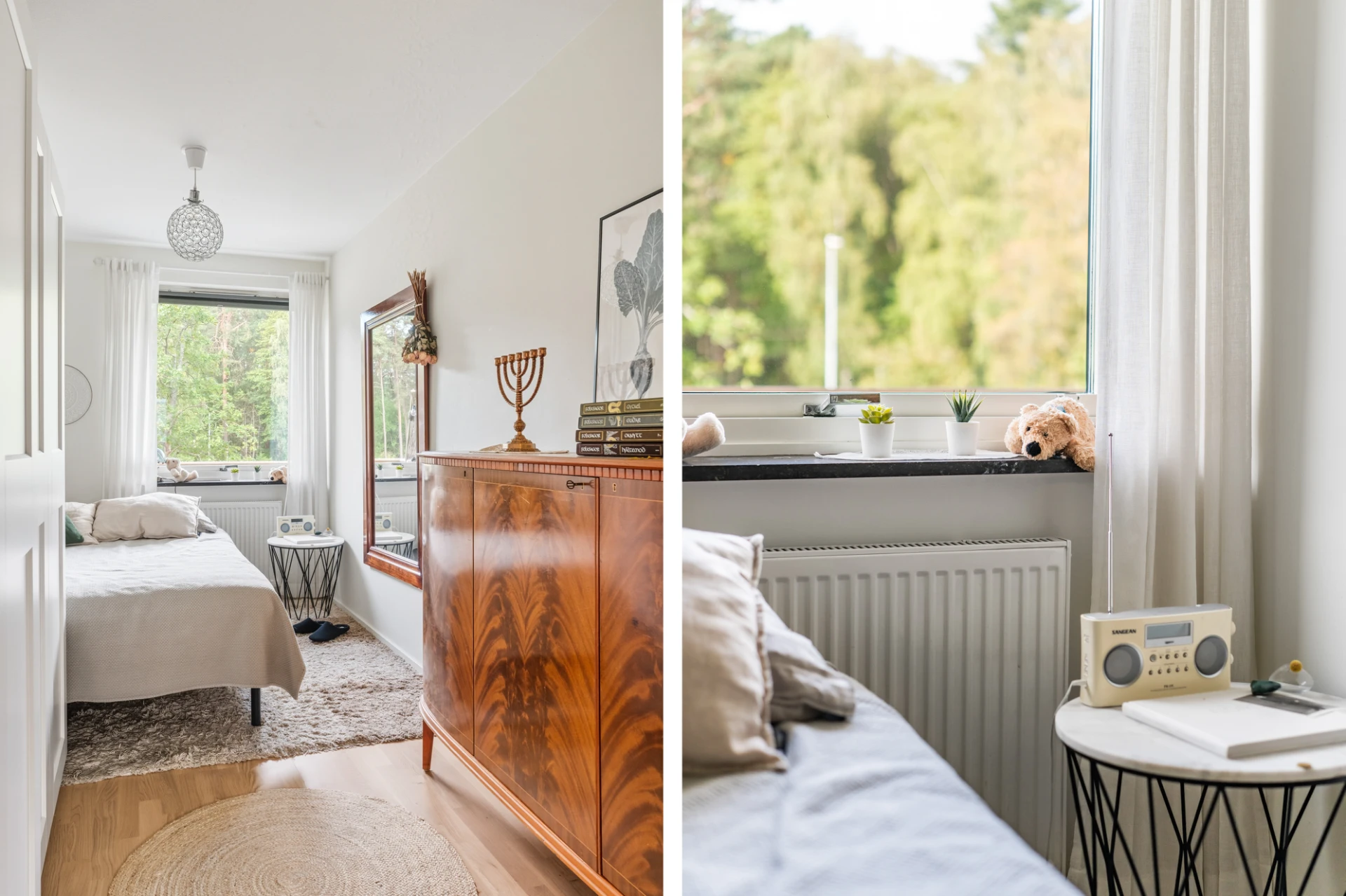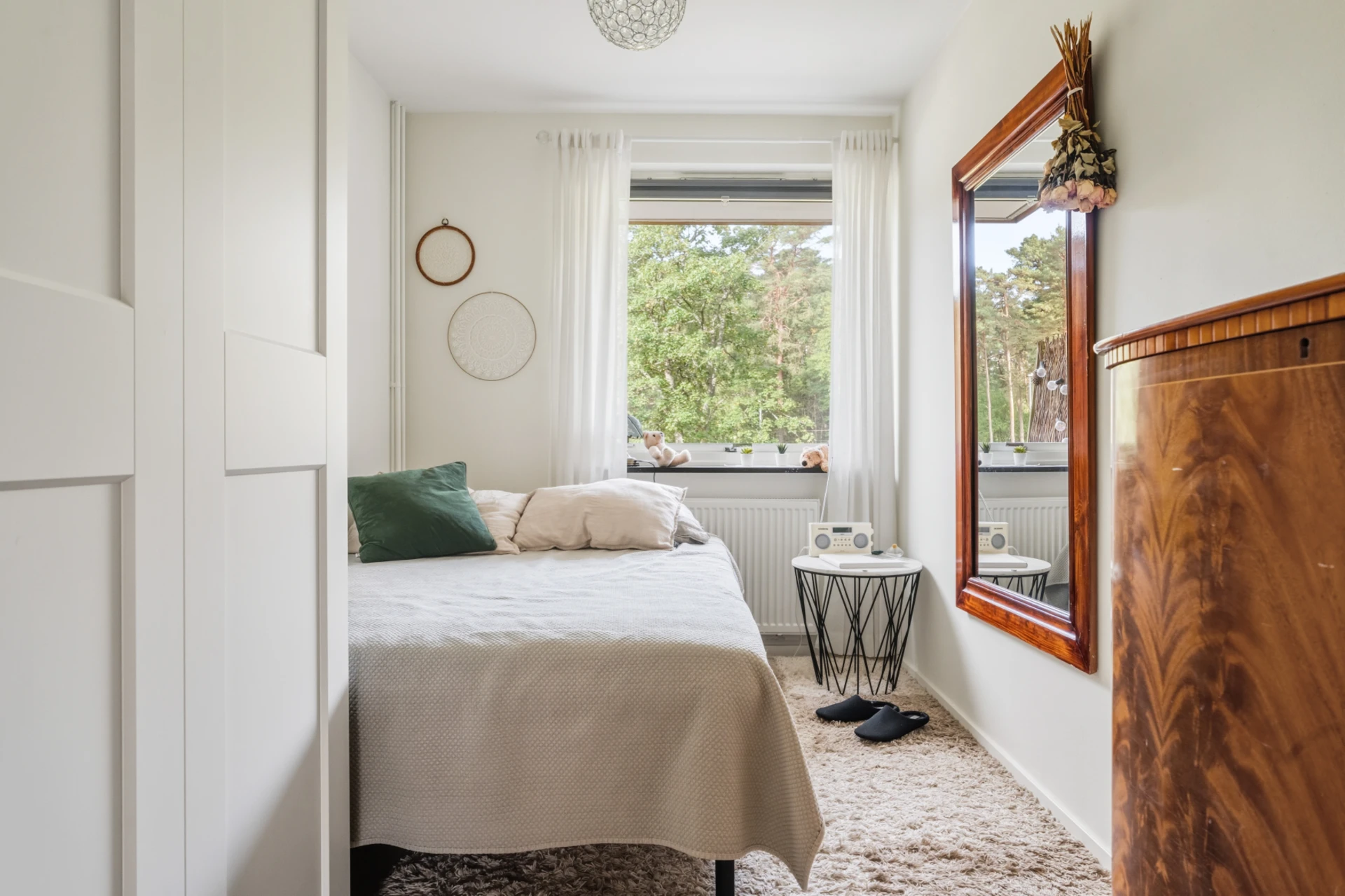 Laminatgolv och vita väggar. Här finns plats för enkelsäng med tillhörande sängbord. Förvaring i två garderober.