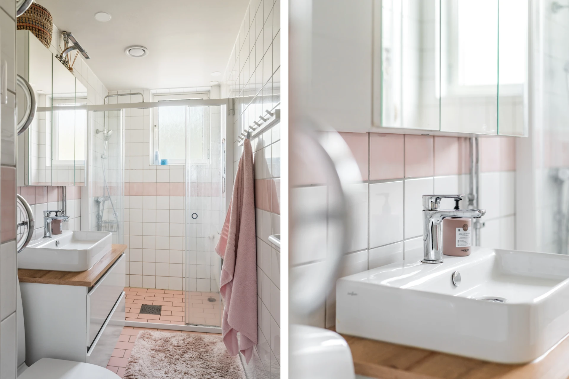 Klinkergolv och kaklade väggar. Badrummet är inrett med WC, handfat med kommod, spegelskåp, dusch samt handdukstork.