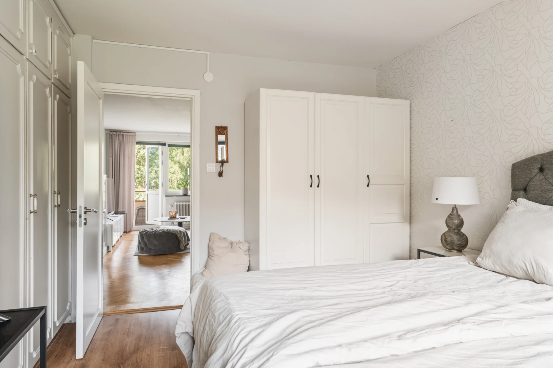Laminatgolv och vita väggar. Här finns plats för dubbelsäng med tillhörande sängbord. Förvaring i tre garderober.