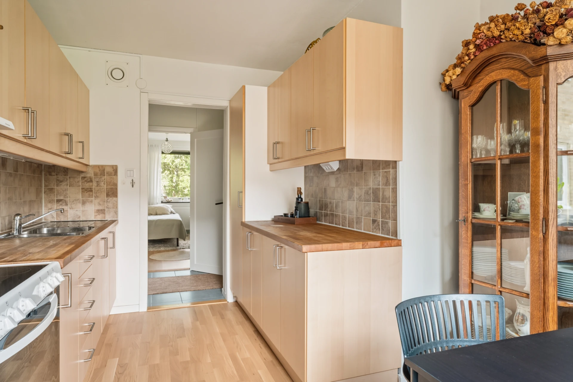 Laminatgolv och vita väggar. Köksinredning i ljust trä och ovanför köksbänken i laminat sitter kakel som stänkskydd. Köket är utrustat med kombinerad kyl och frys, spis med ugn, samt gott om förvaring.