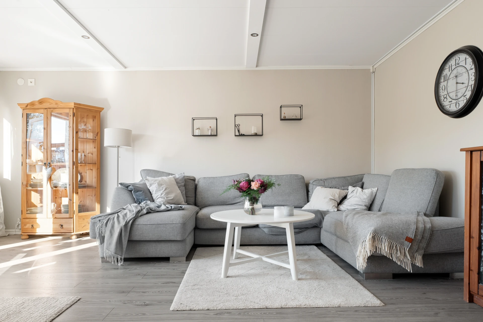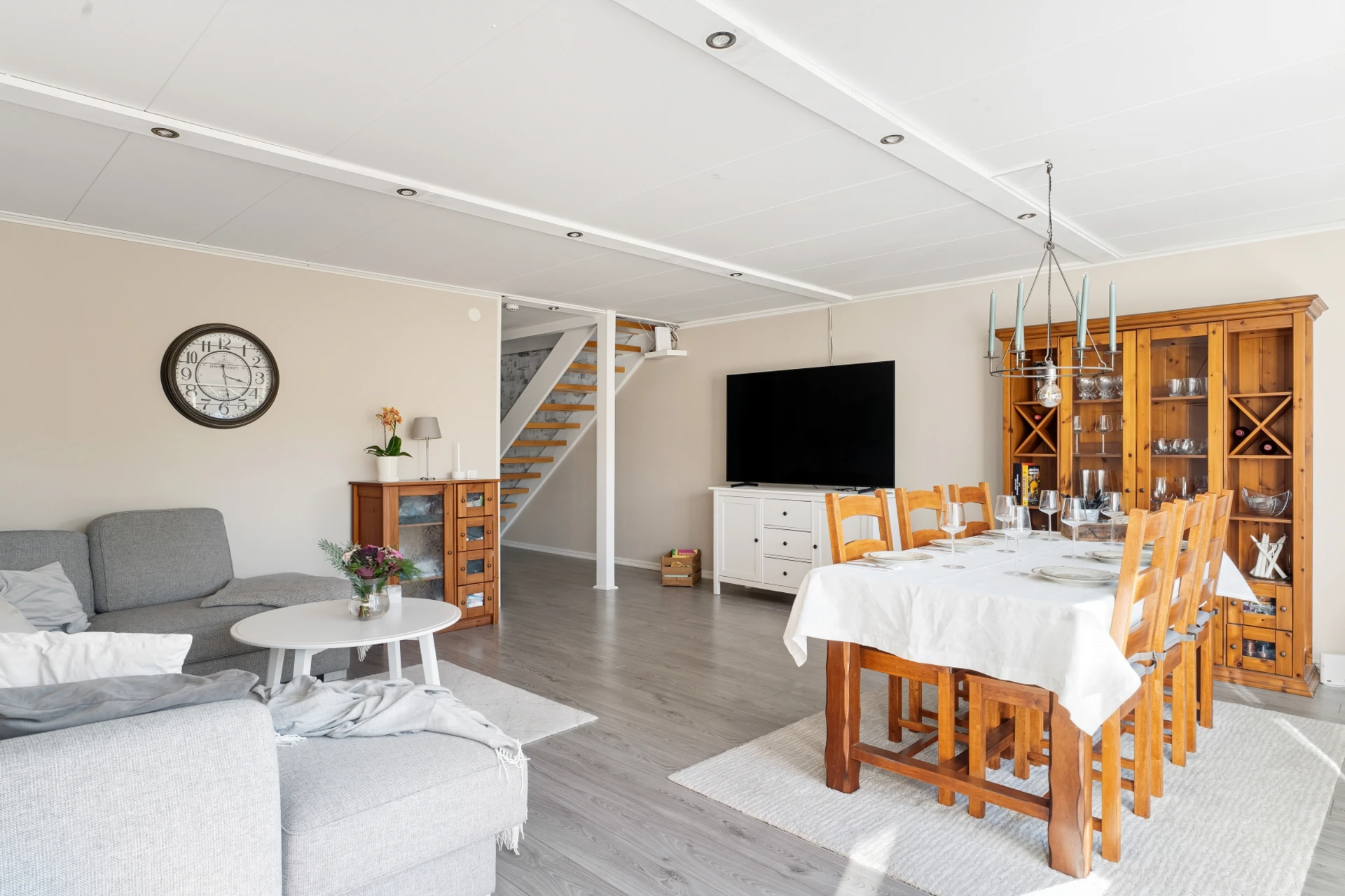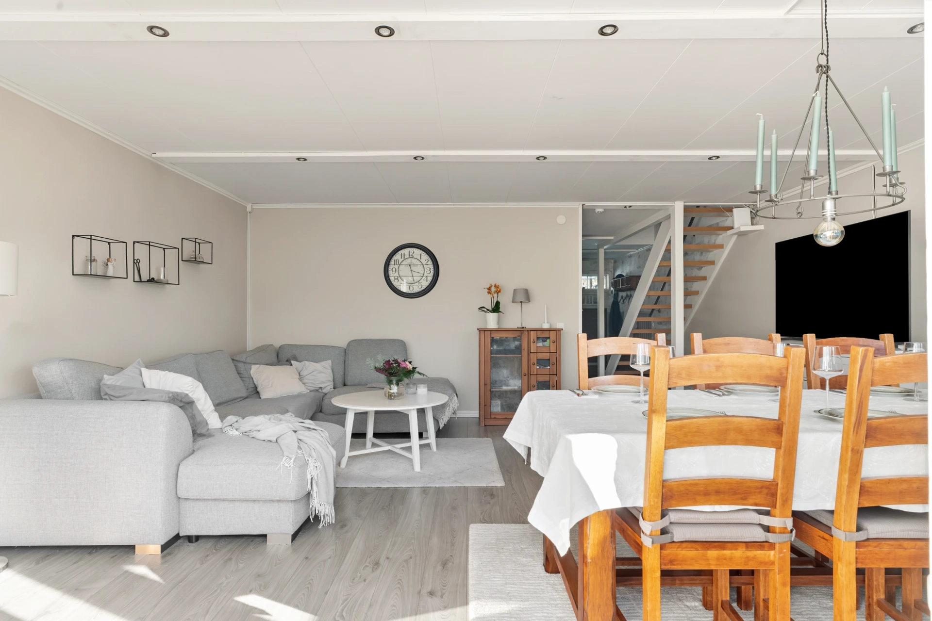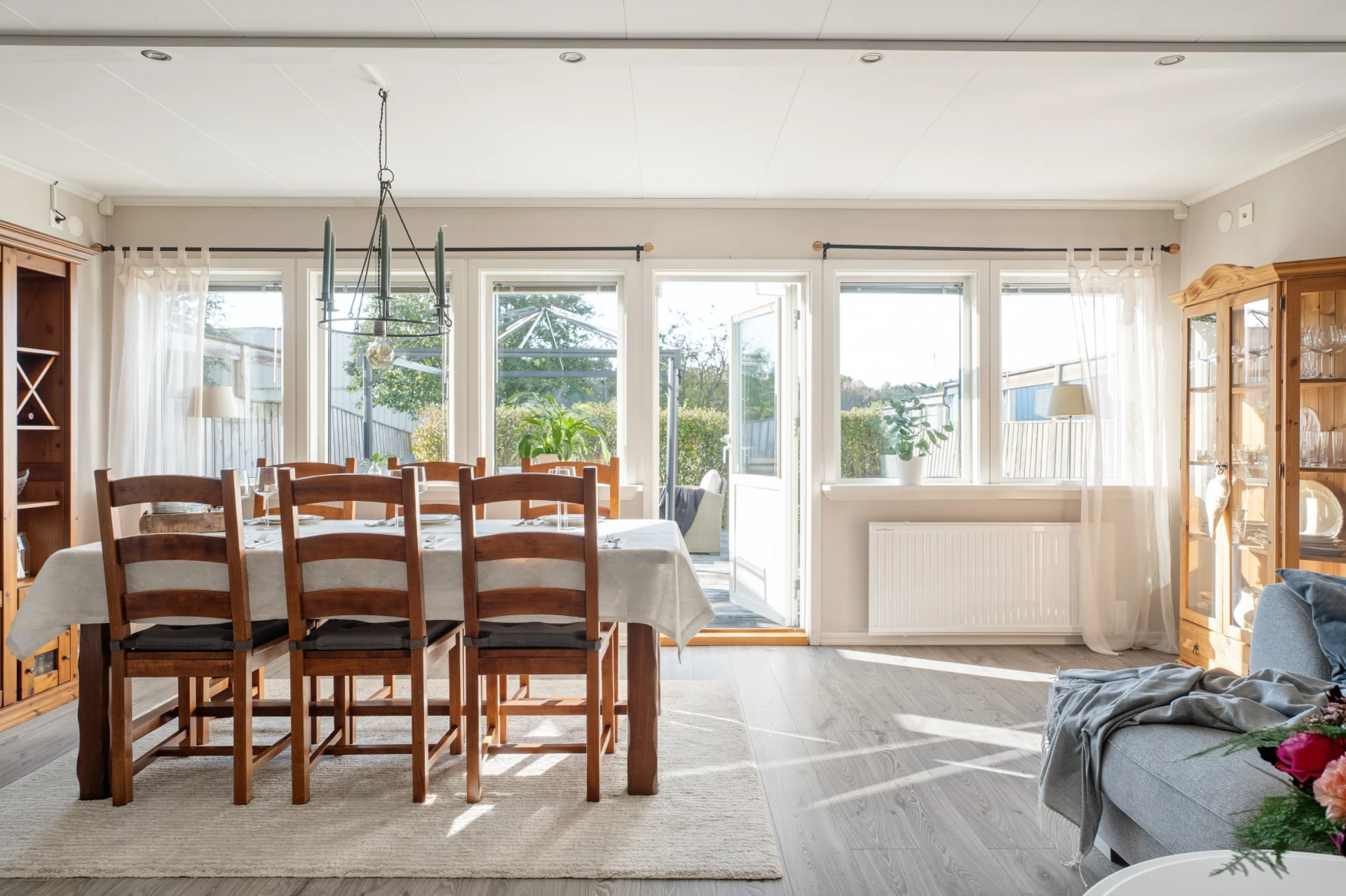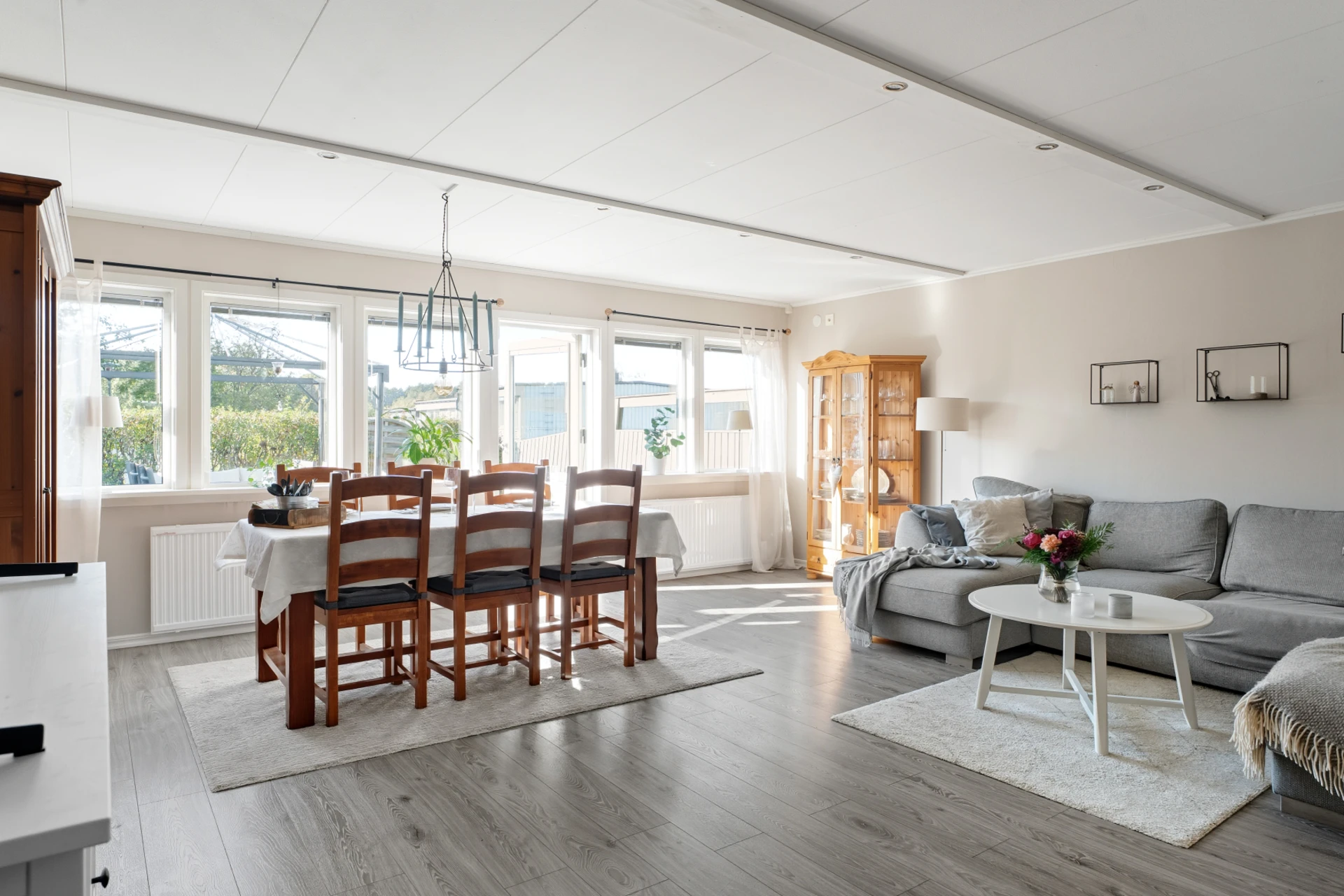 Laminatgolv och ljusa väggar. Plats för soffgrupp med tillhörande möblemang och matsalsbord. Härifrån nås bostadens altan med eftermiddagssol.