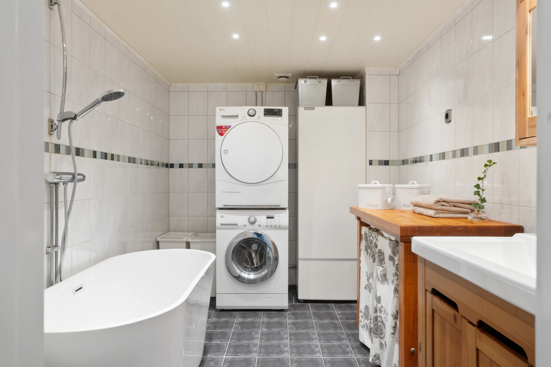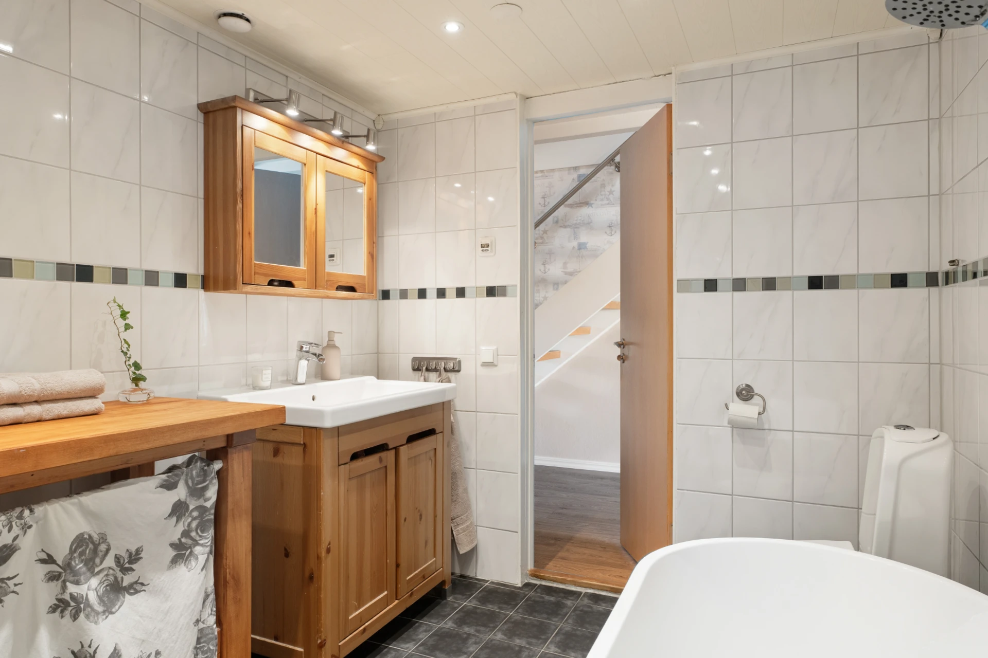 Klinkergolv med golvvärme och helkaklade väggar. Badrumsinredningen består av WC-stol, handfat med kommod, spegelskåp, badkar kombinerat med dusch samt tvättpelare med torktumlare och tvättmaskin.