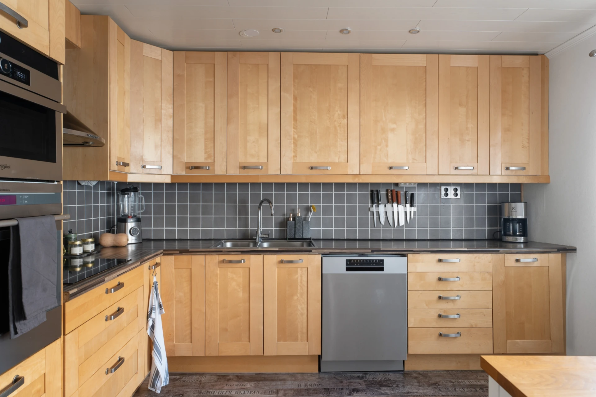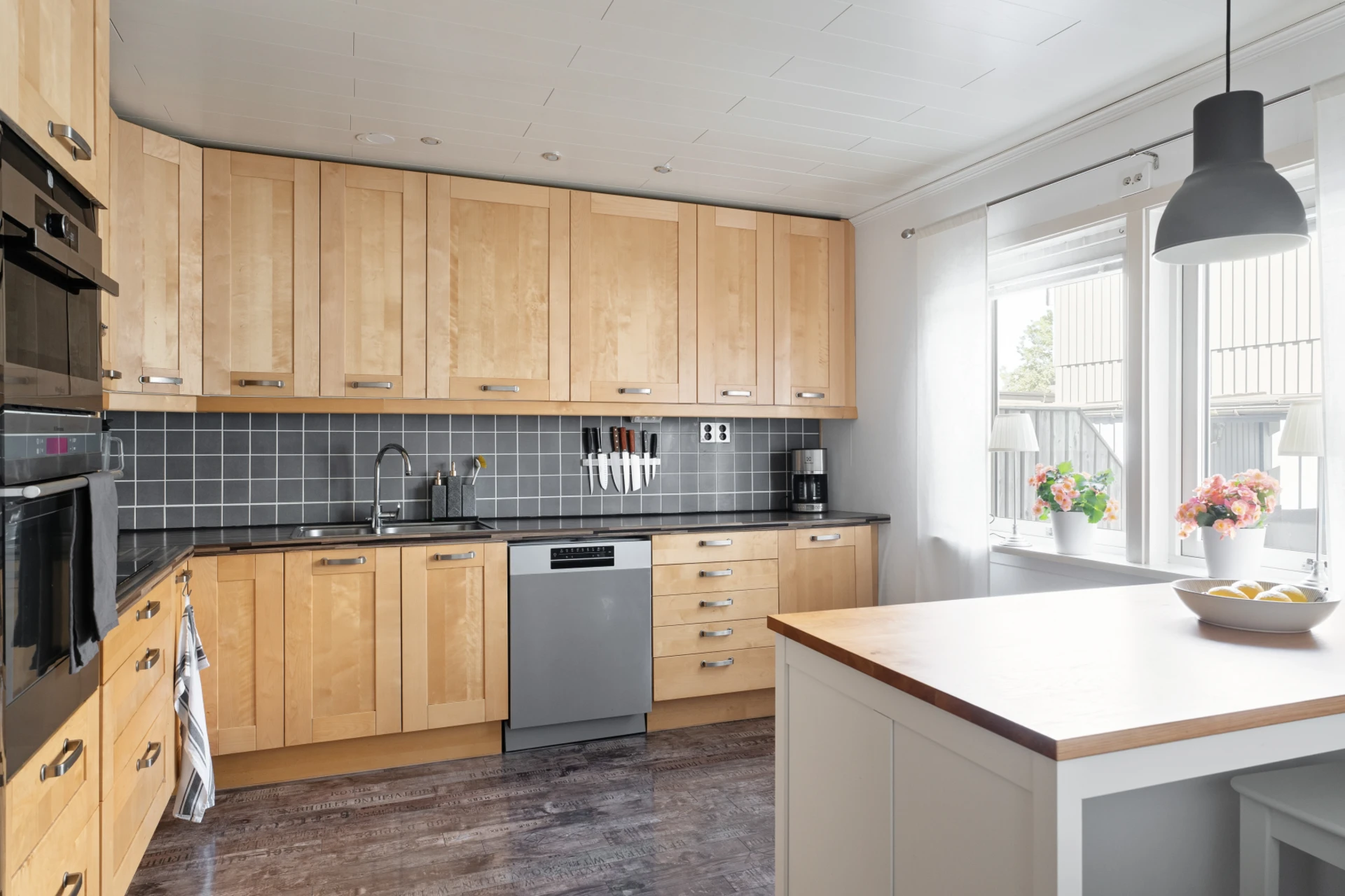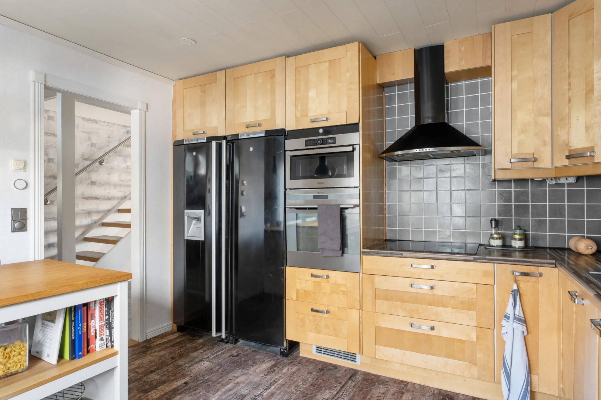 Laminatgolv med golvvärme och ljusa väggar. Köksinredning i trä och ovan arbetsbänken sitter grått kakel. Den maskinella utrustningen består av kyl och frys i fullhöjd, inbyggd ugn och mikro, spishäll, köksfläkt och diskmaskin. I köket finns plats för matbord/köksö.