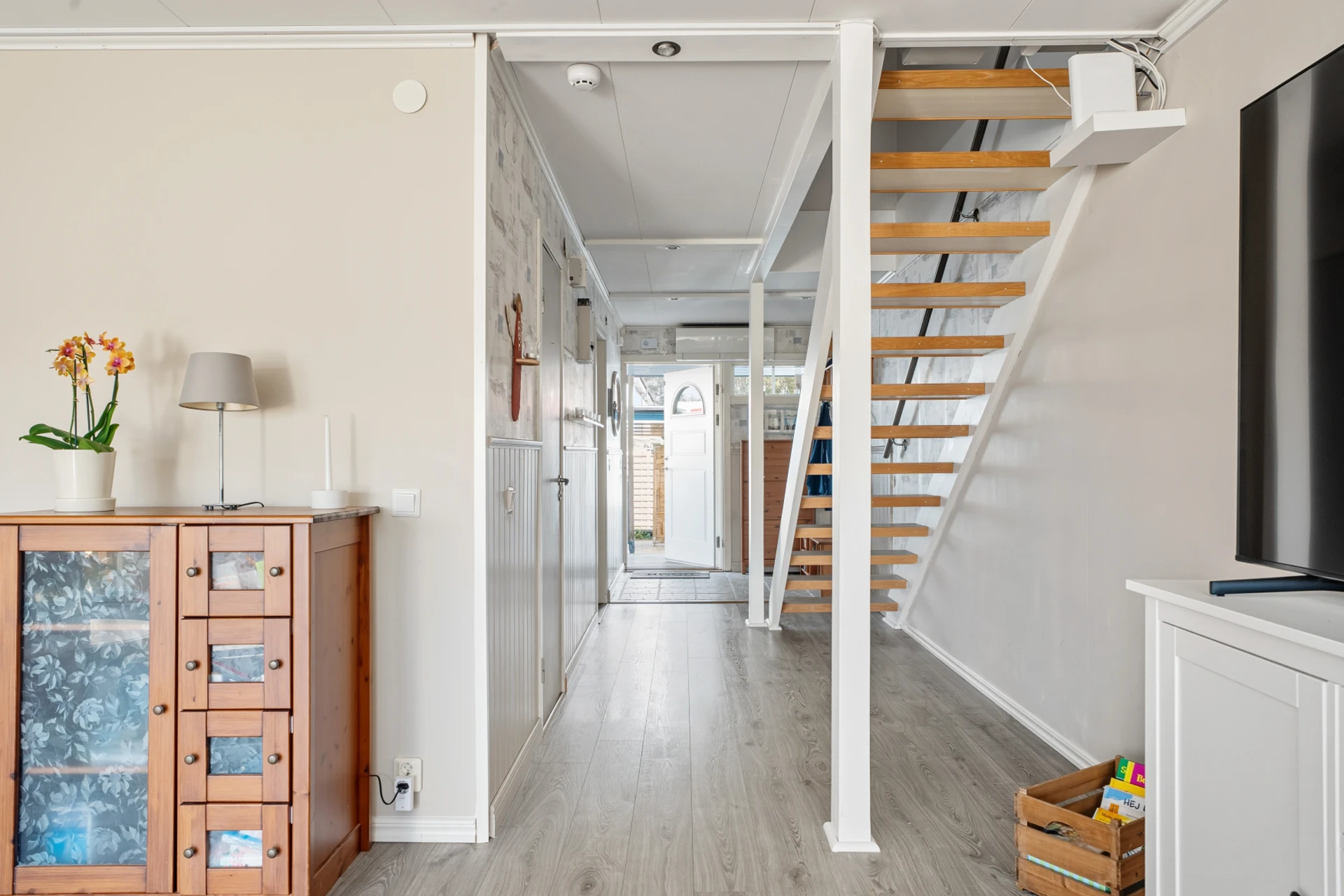 Klinkergolv och tapetserade väggar med bröstpanel. Plats för kappavhängning. Utanför entrén finns ett altandäck och stenlagd uteplats med förmiddagssol.