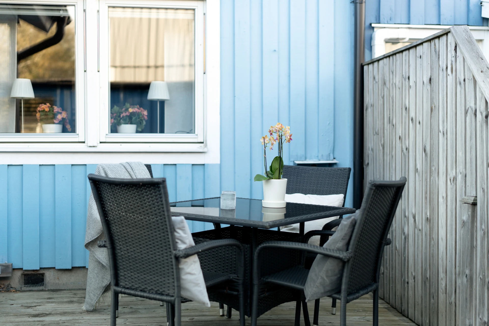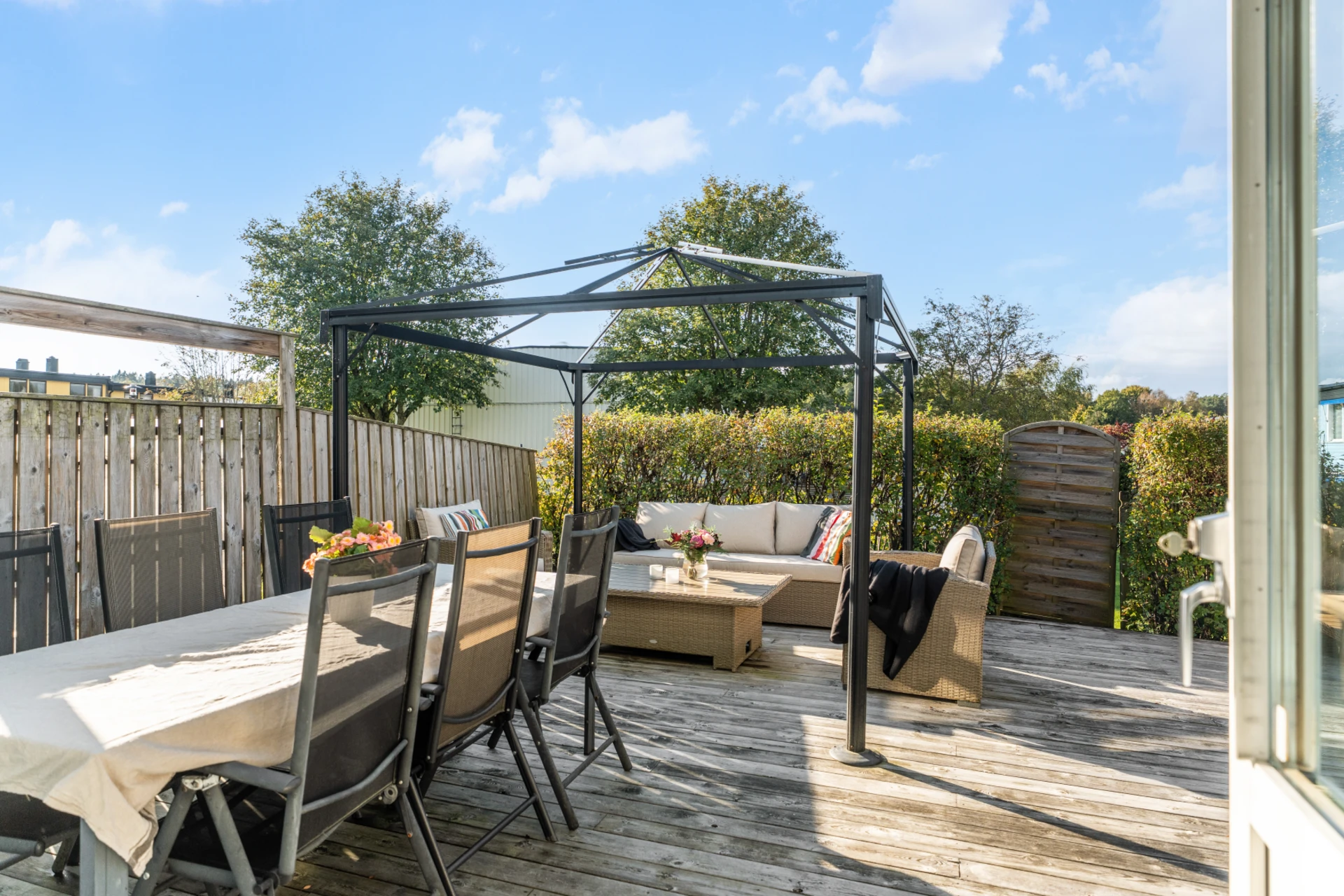Beskrivning uteplats: Altandäck och stenlagd yta vid entrén i österläge med förmiddagssol. Stort altandäck på husets baksida i västerläge med eftermiddagssol.