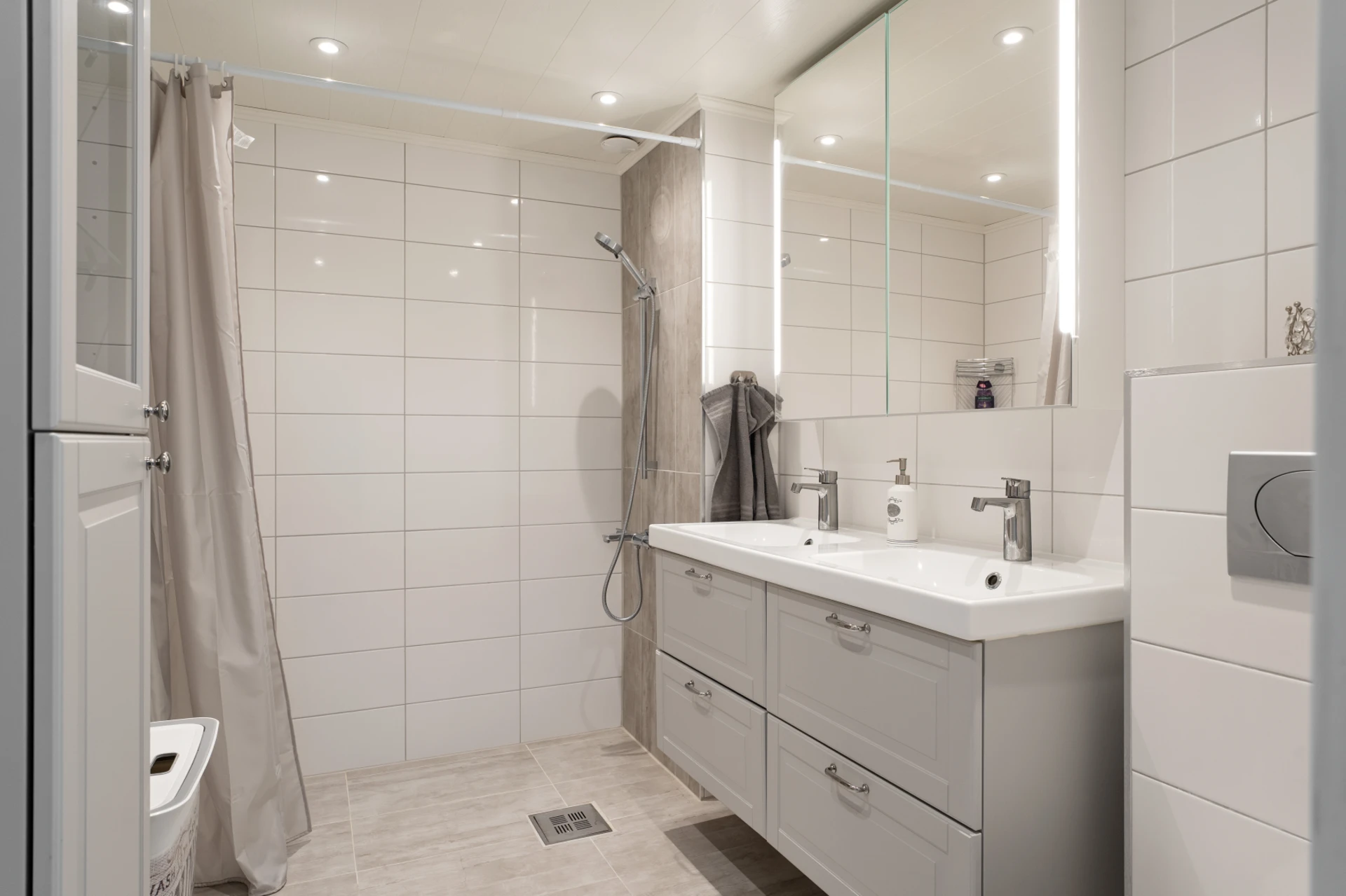 Klinkergolv med golvvärme och helkaklade väggar. Badrumsinredningen består av WC-stol, dubbla handfat med kommod, spegelskåp, förvaringsskåp och dusch med draperi.