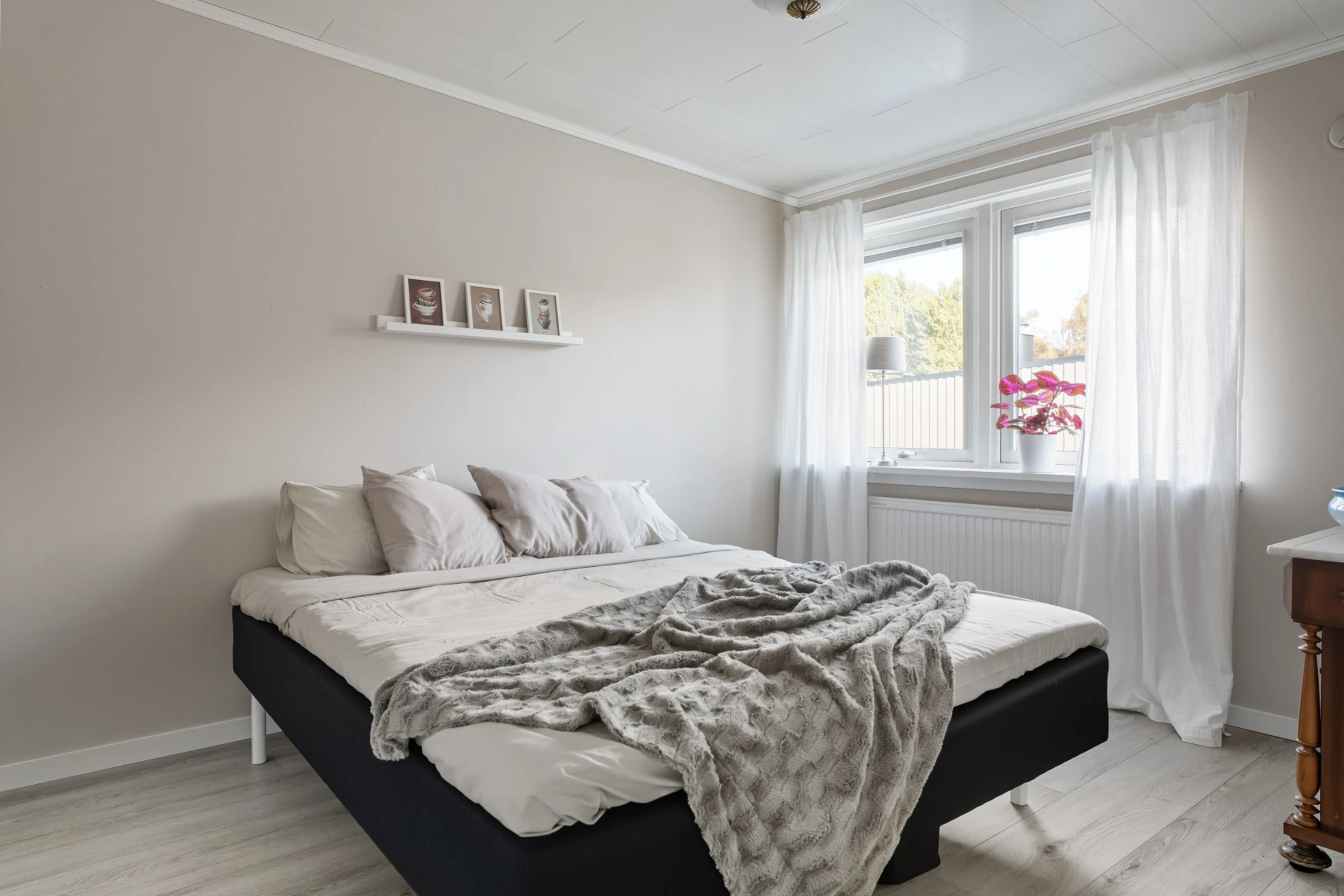 Laminatgolv och ljusa väggar. Plats för säng med tillhörande möblemang.