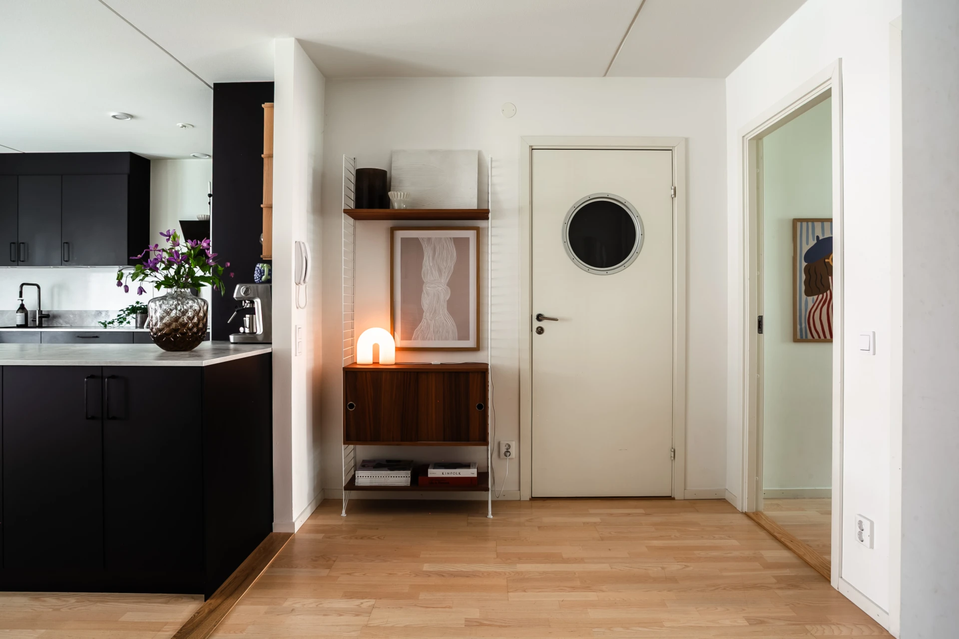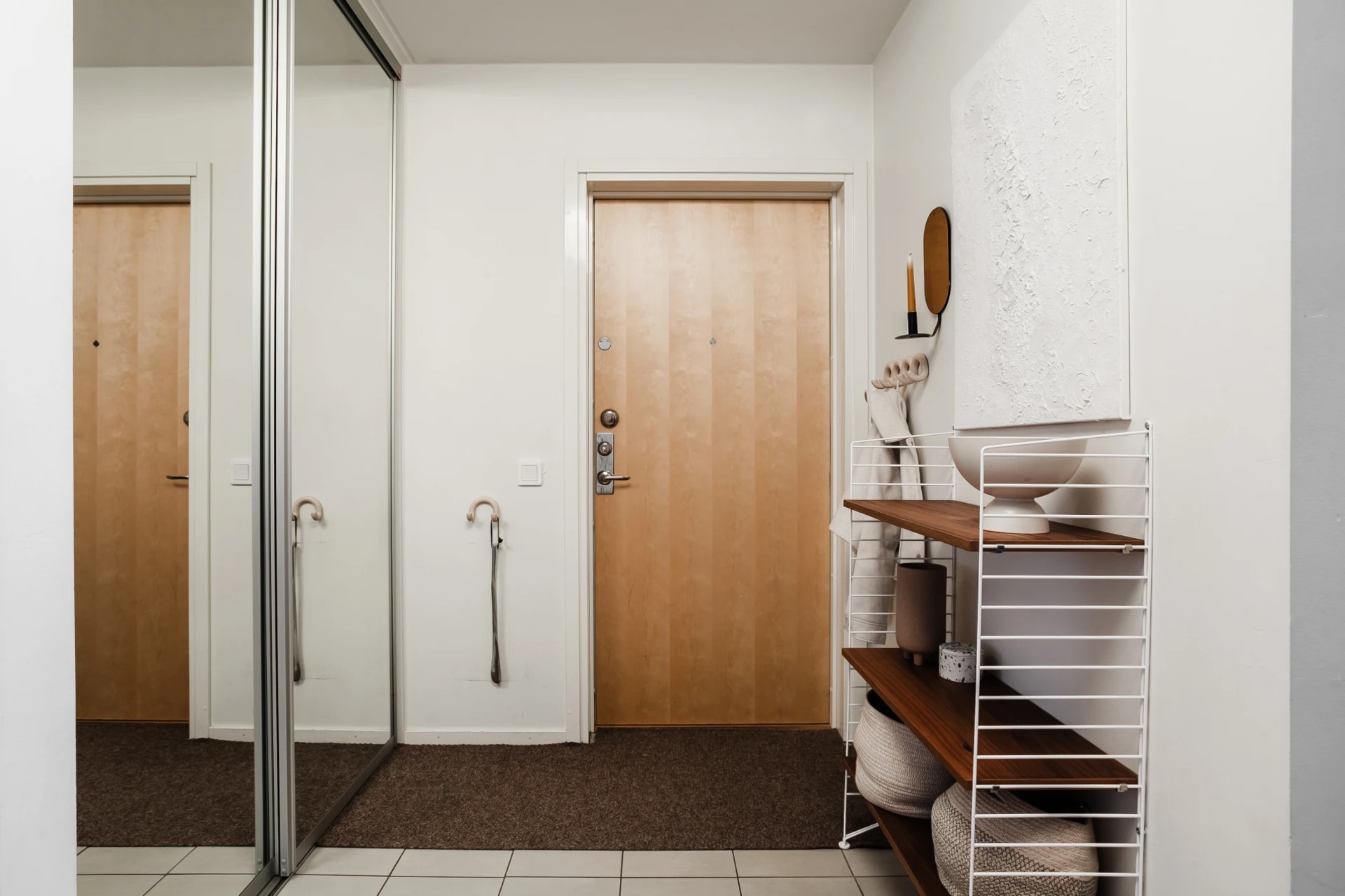 Klinkergolv i entrén som övergår i parkettgolv samt vitmålade väggar. Här finns plats för avhängning av ytterkläder samt förvaring i en skjutdörrsgarderob. Bostaden är utrustad med säkerhetsdörr.