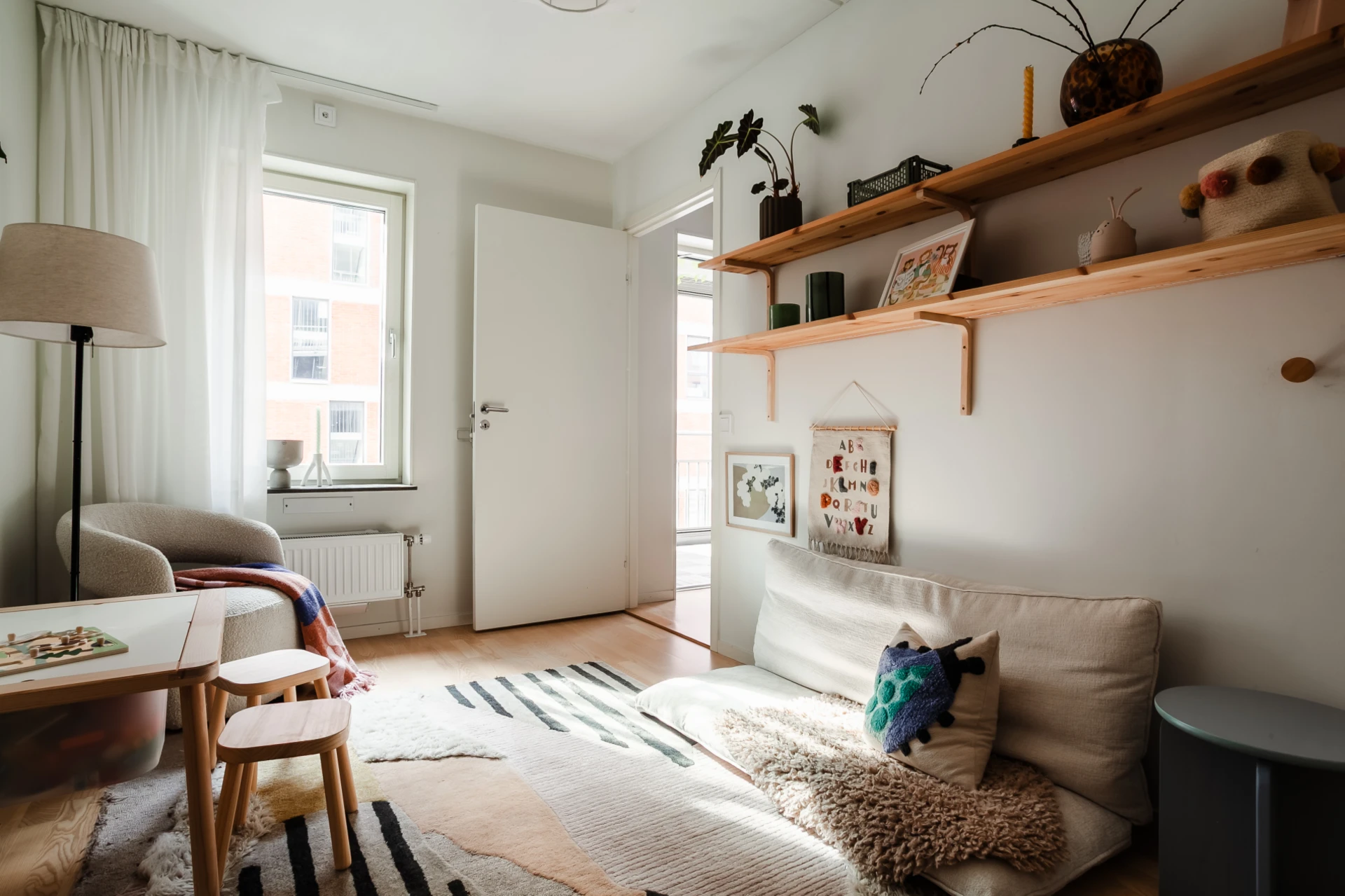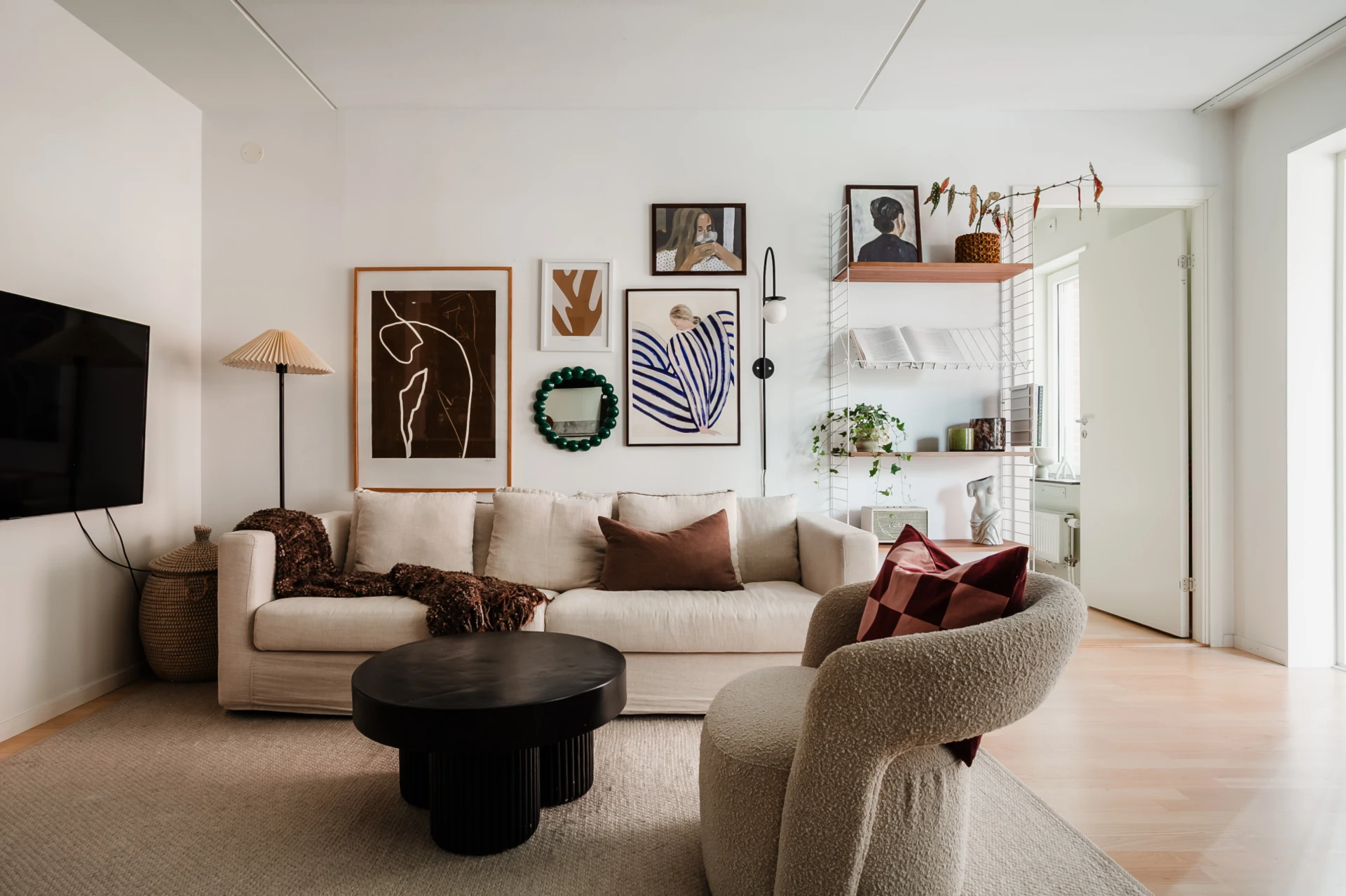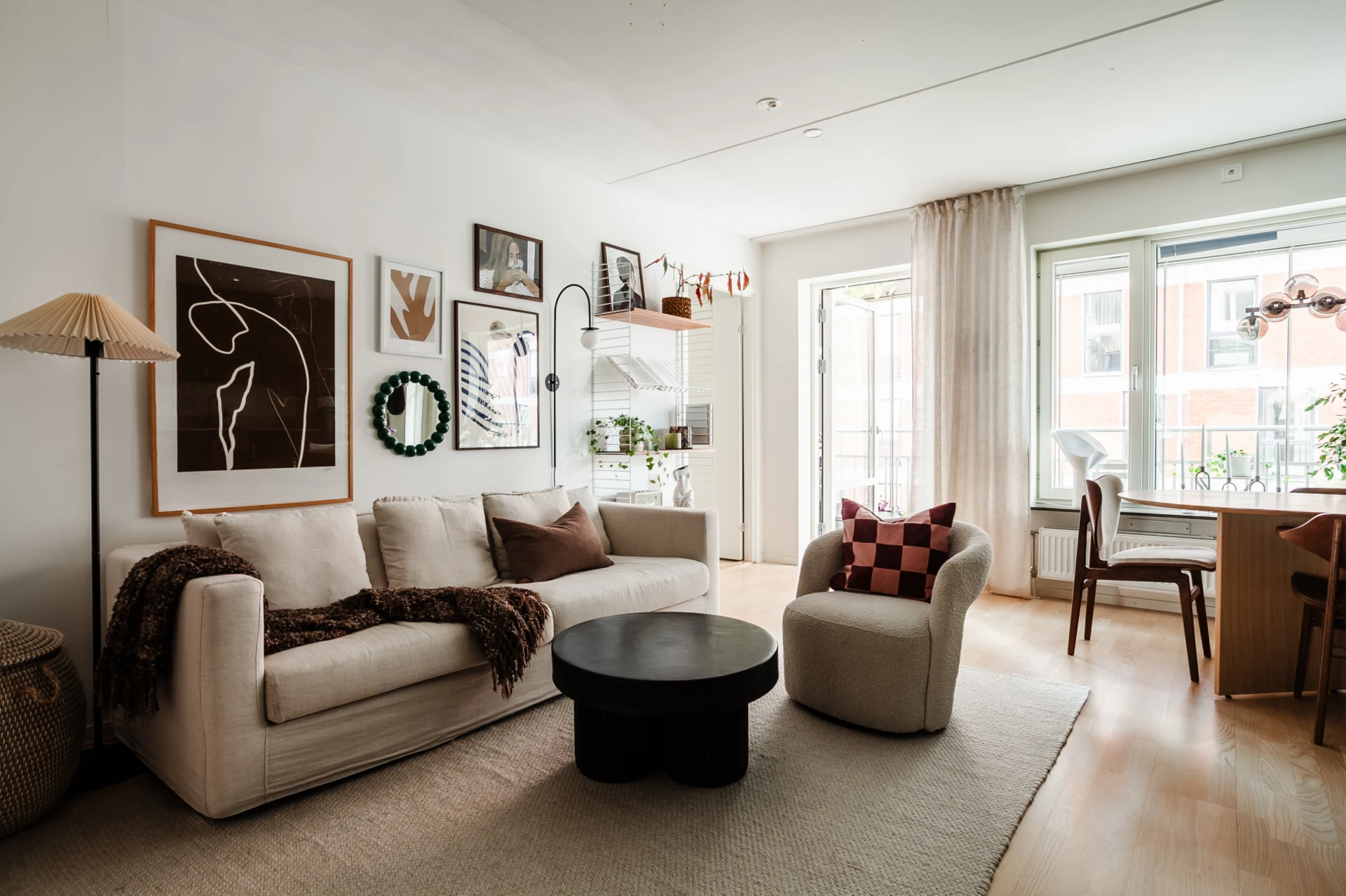 Parkettgolv och vitmålade väggar. Här finns utrymme för soffgrupp med tillhörande möblemang. Härifrån nås den ena av bostadens två inglasade balkonger.