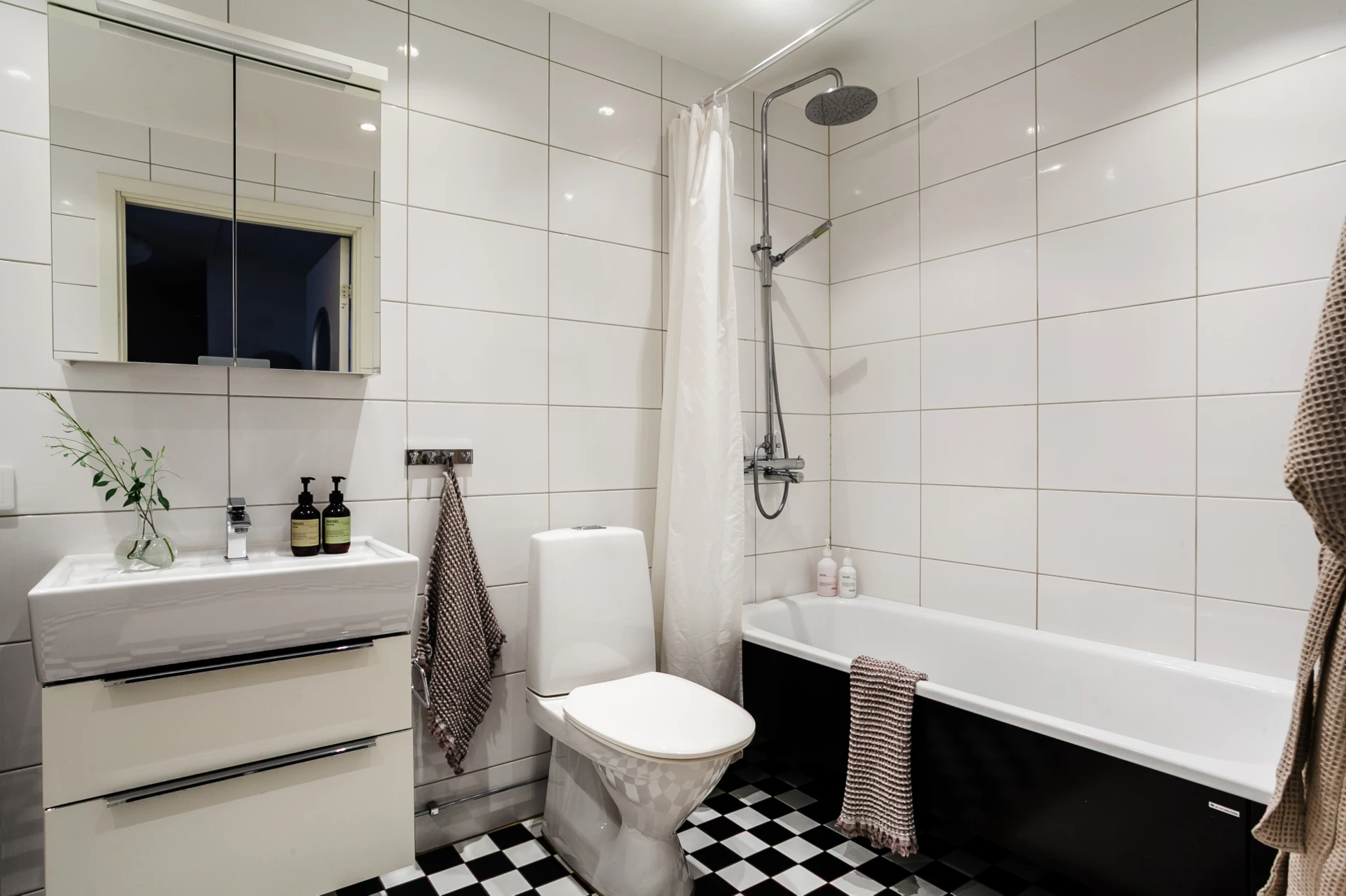 Klinkergolv med golvvärme och helkaklade väggar. Badrummet är inrett med WC, handfat med kommod, spegelskåp, badkar med takdusch samt tvättmaskin och torktumlare. I taket sitter spotlights med dimmer.