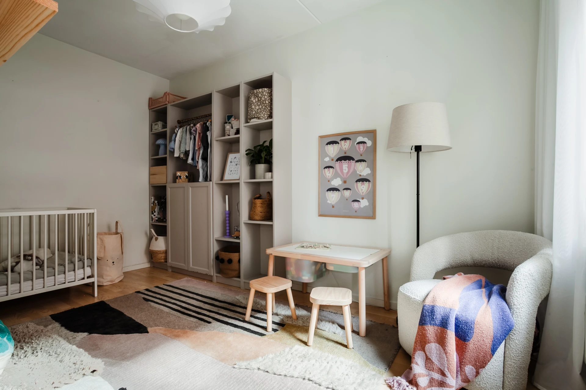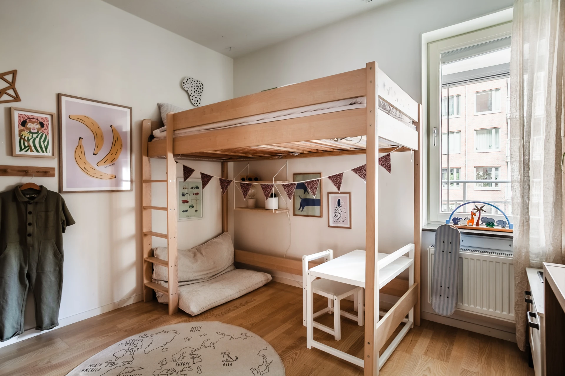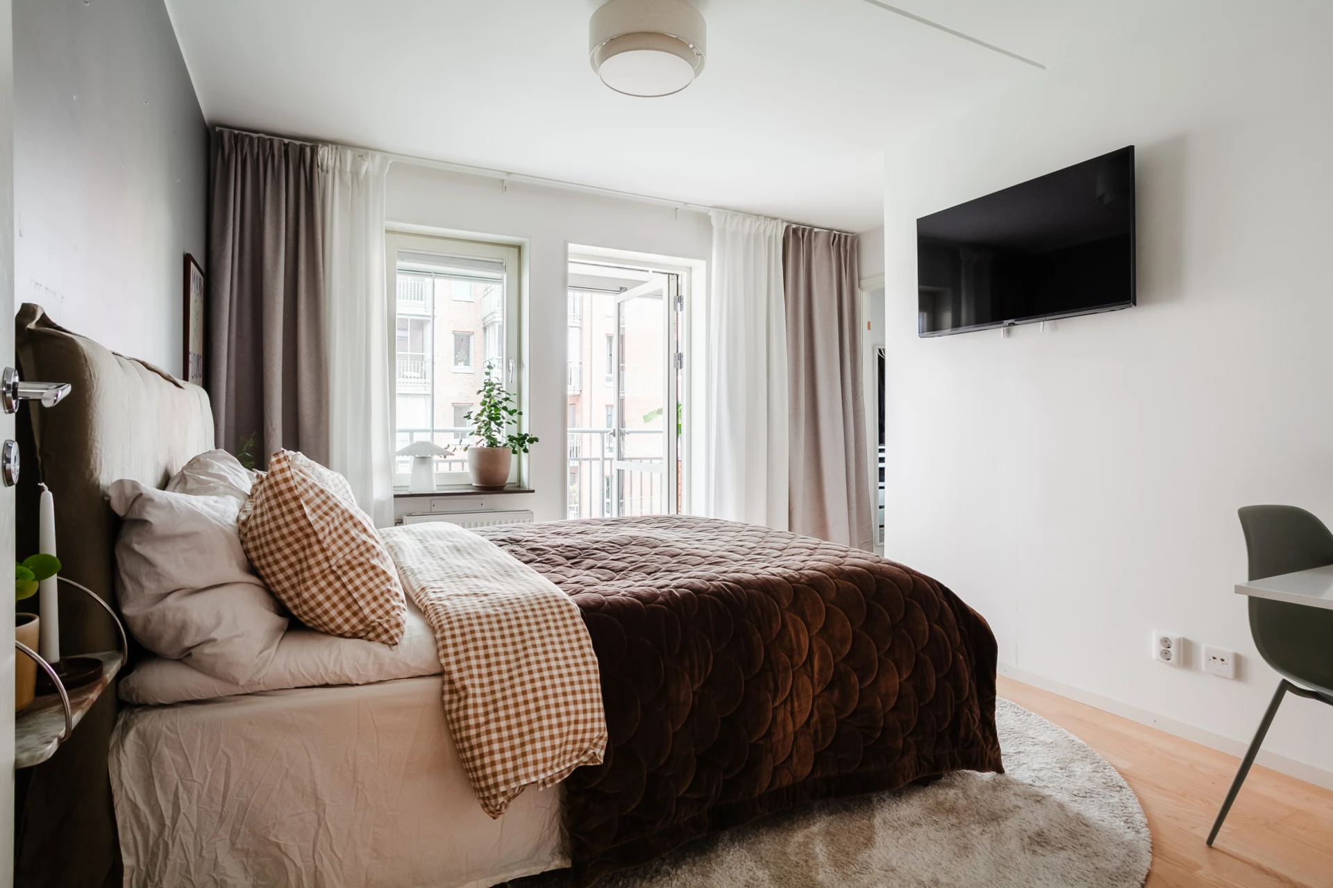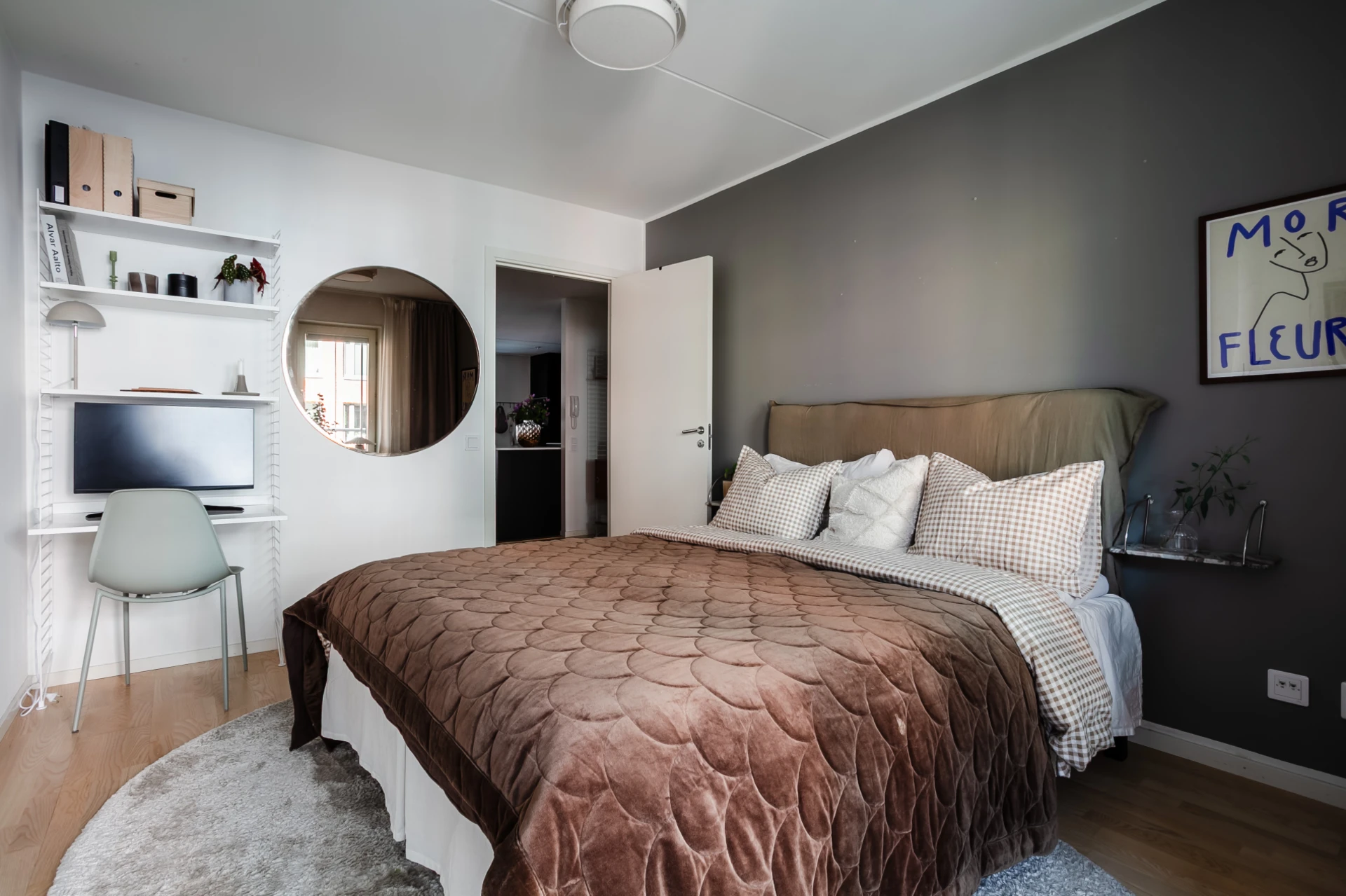 Parkettgolv och vitmålade väggar med en grå fondvägg. Här finns plats för dubbelsäng med tillhörande sängbord samt skrivbordshörna. Förvaring i klädkammare. Härifrån nås den andra av bostadens två inglasade balkonger.