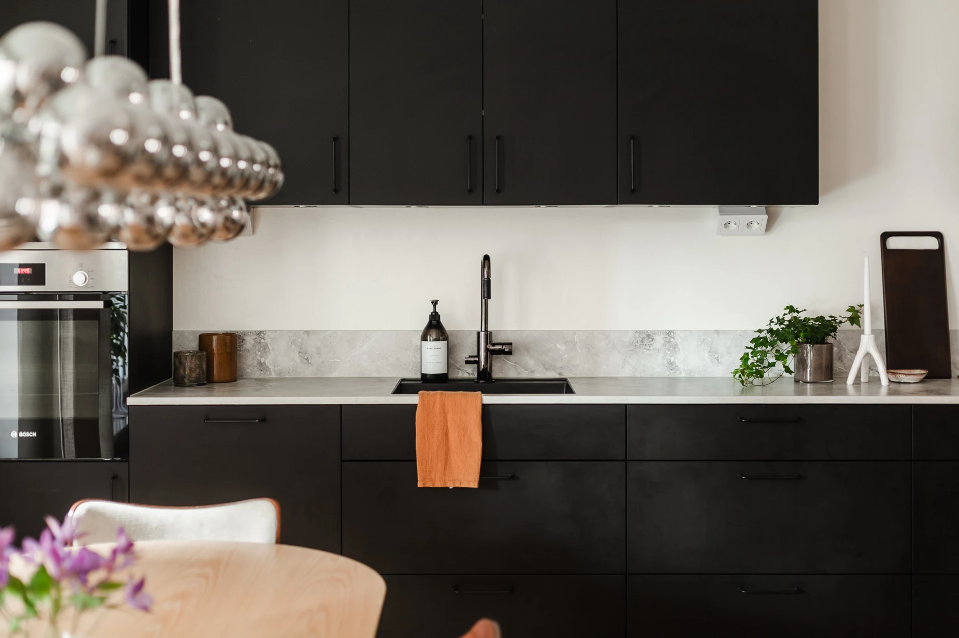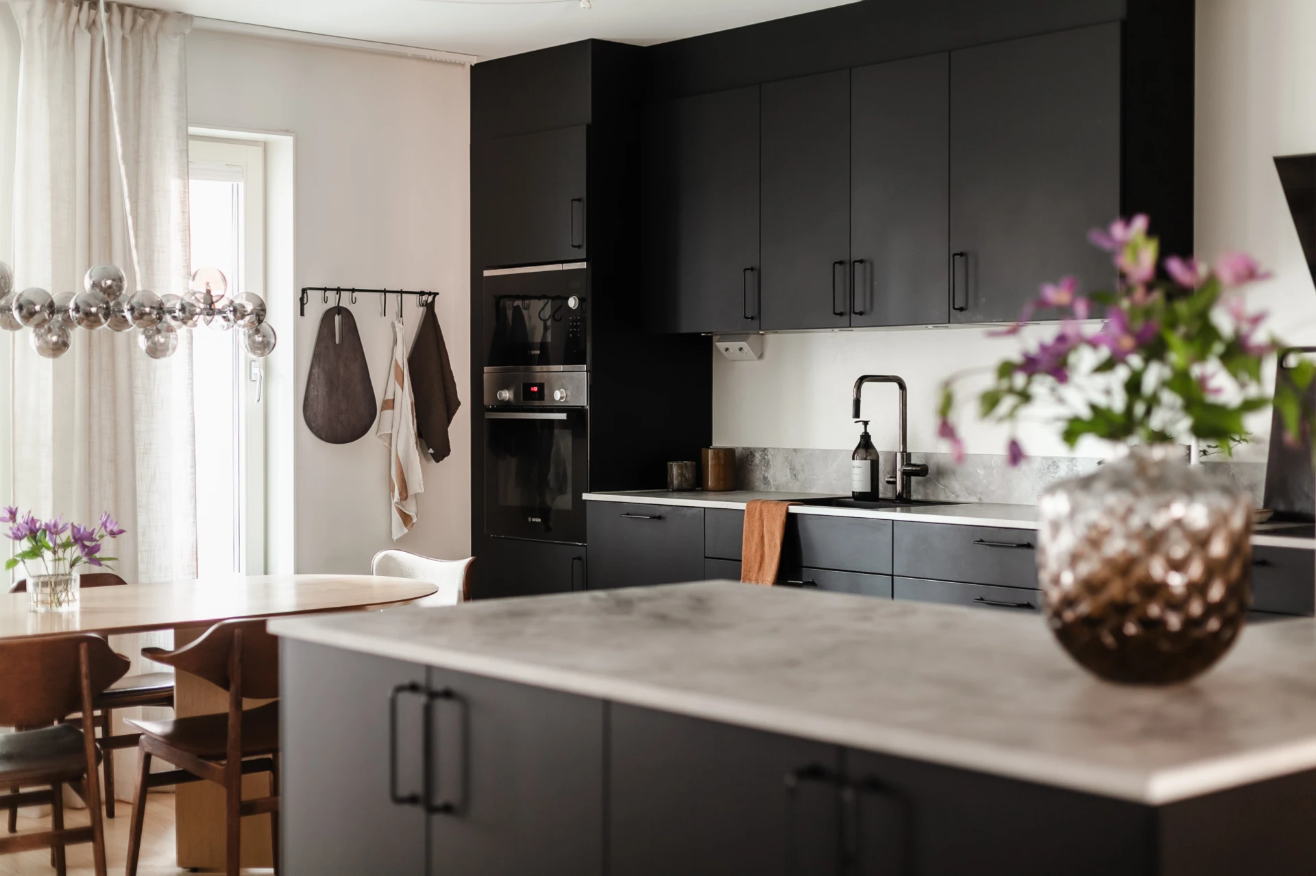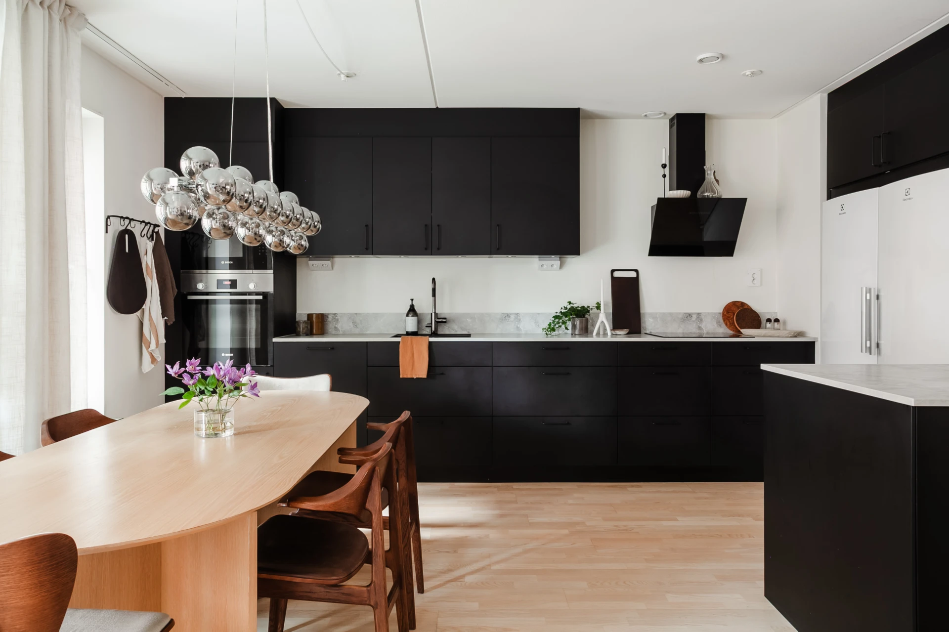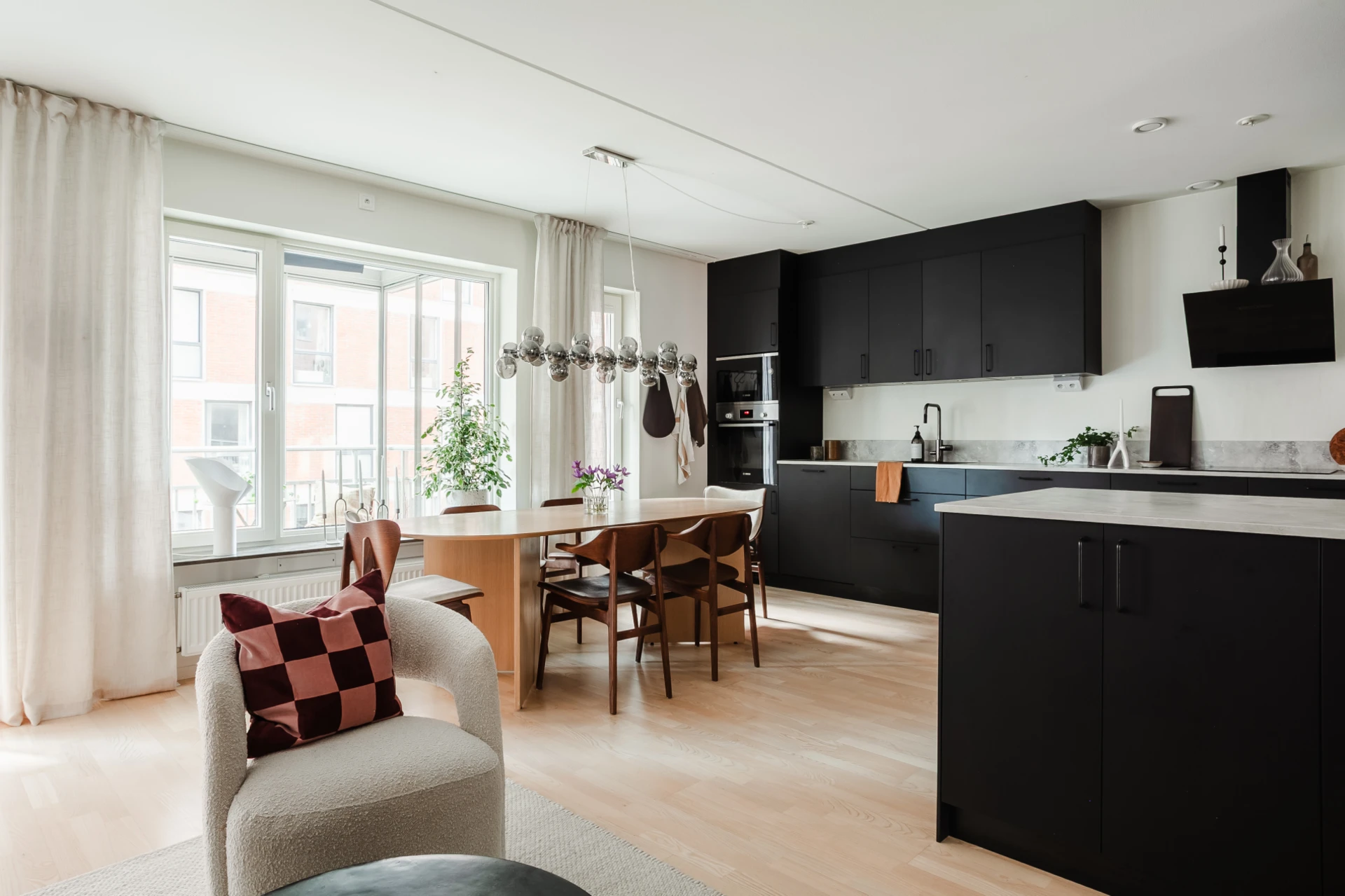 Parkettgolv och vitmålade väggar. Köksinredning i svart från Kvik och ovan köksbänken i marmormönstrad laminat sitter stänkskydd i samma material samt spotlights. Köket är utrustat med kyl och frys i fullhöjd, induktionshäll, inbyggd ugn, fläkt, inbyggd mikro, diskmaskin samt vinkyl. Matplats för ca 6 personer. Takbeysning med dimmer.
