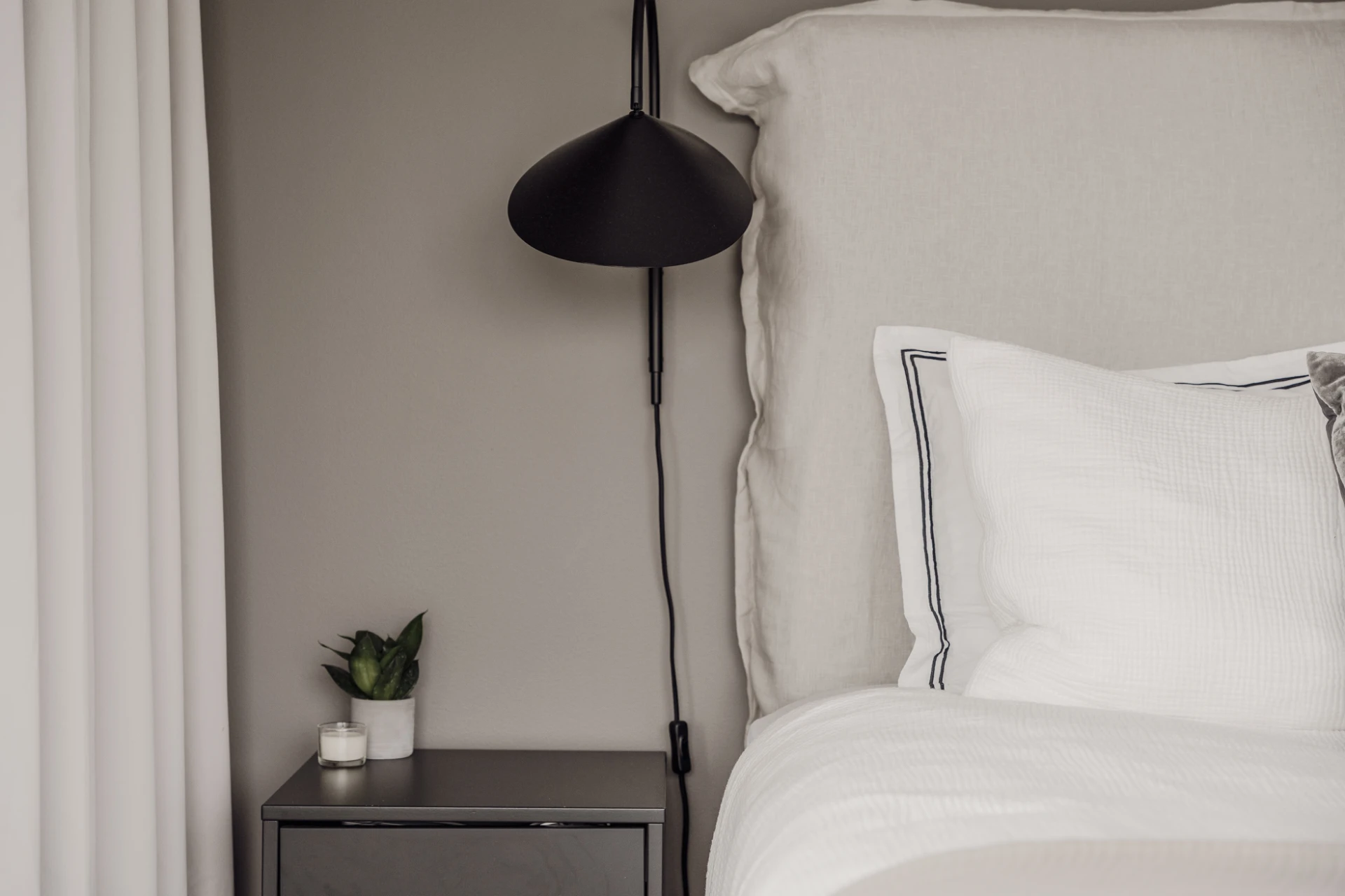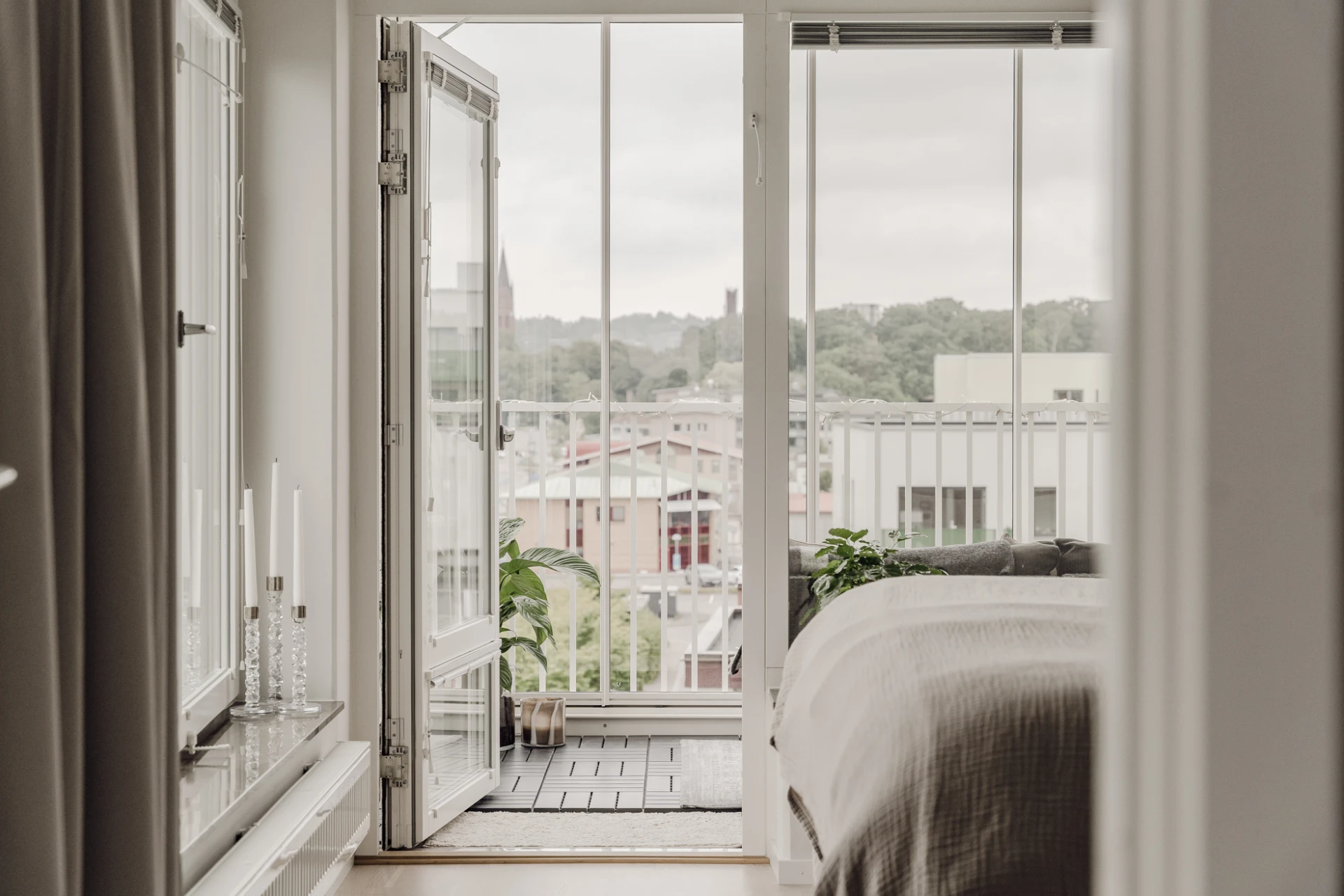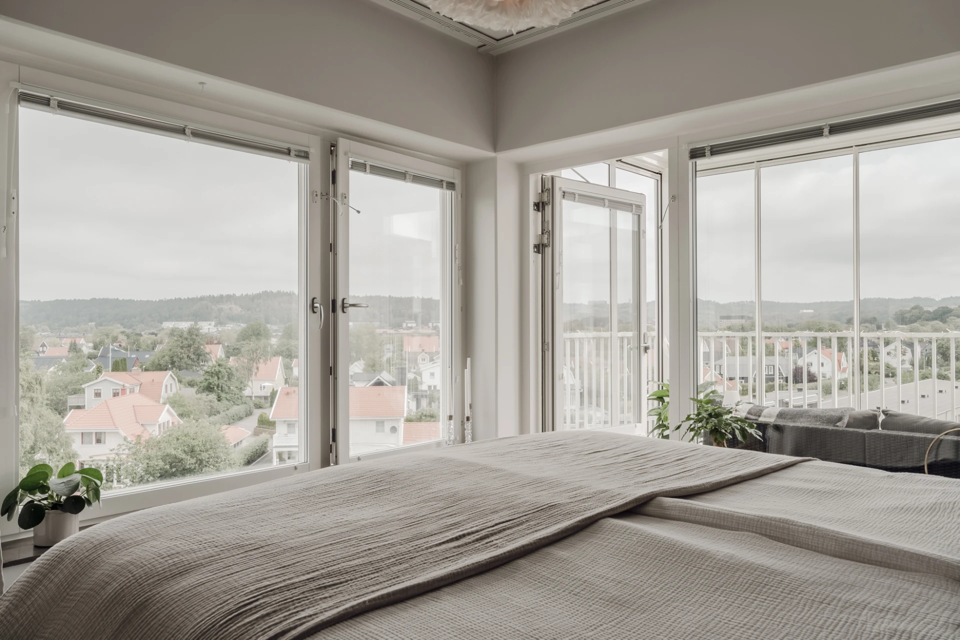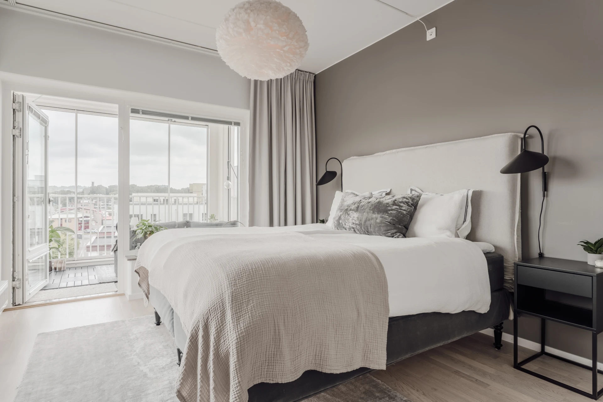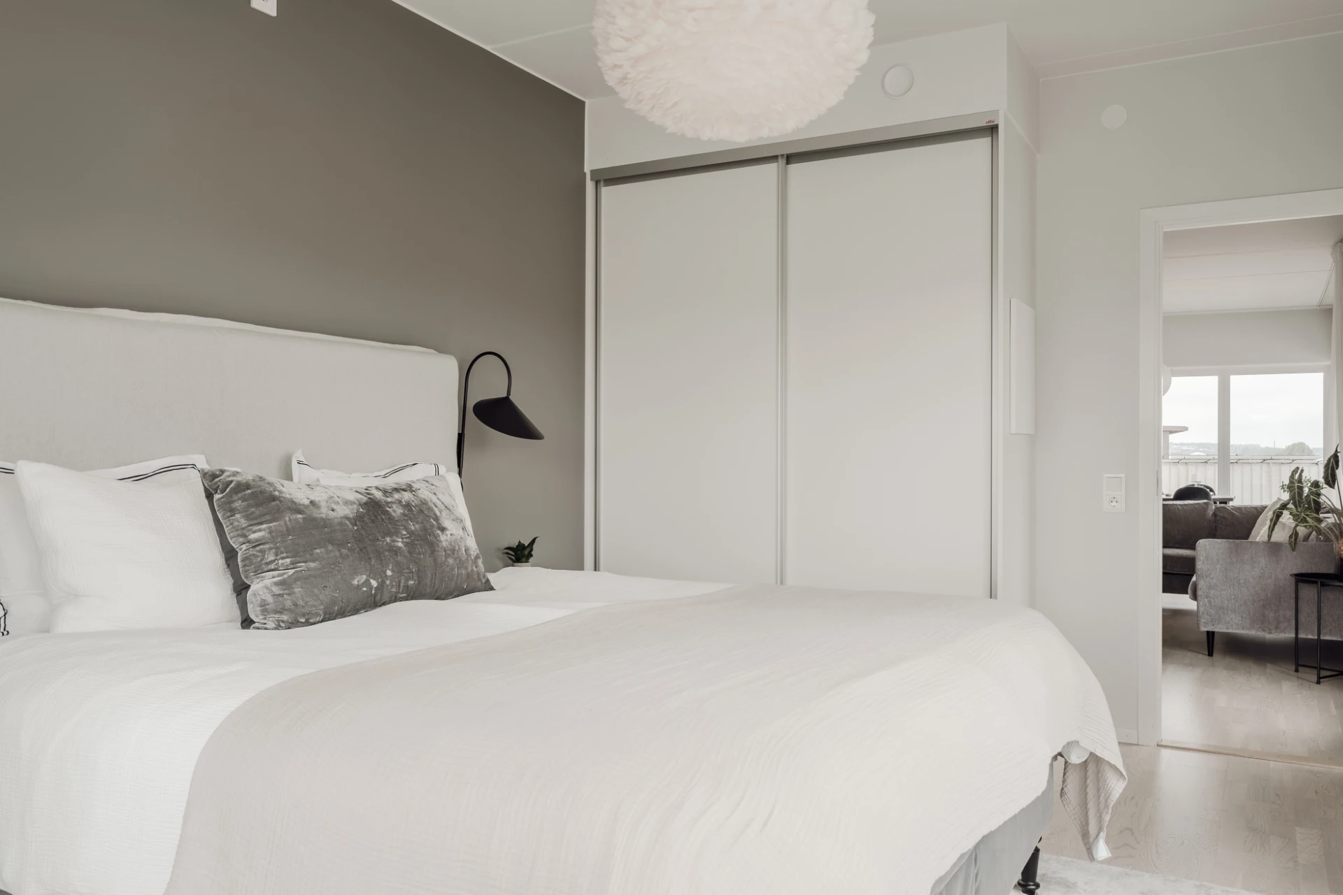 Vitlaserad ekparkett och ljusgråa väggar utöver en greige fondvägg. I taket finns belysning med dimmerfunktion. Här finns plats för dubbelsäng och förvaring i en skjutdörrsgarderob med praktisk Elfa-inredning. Från detta sovrum nås bostadens inglasade balkong.
